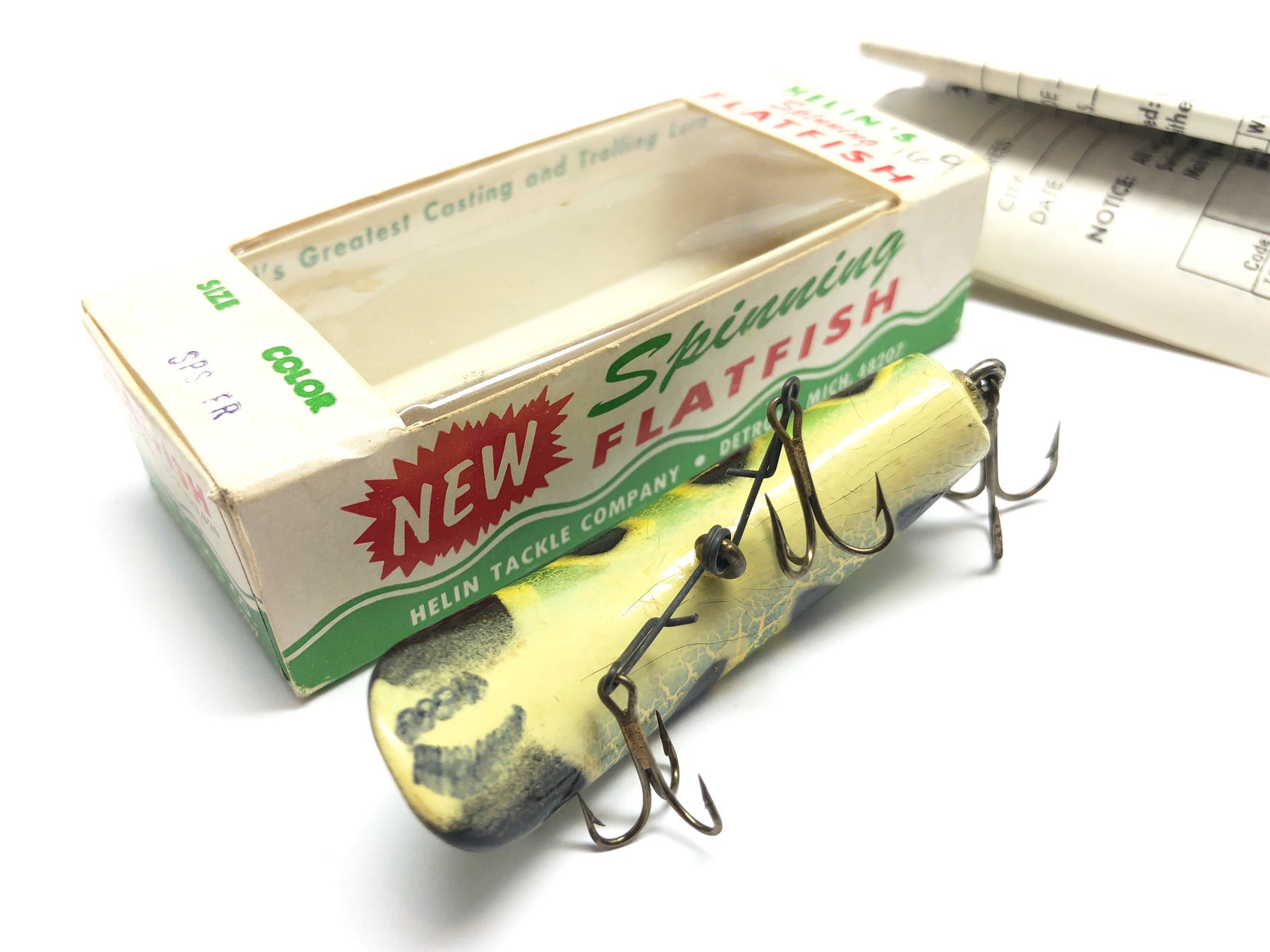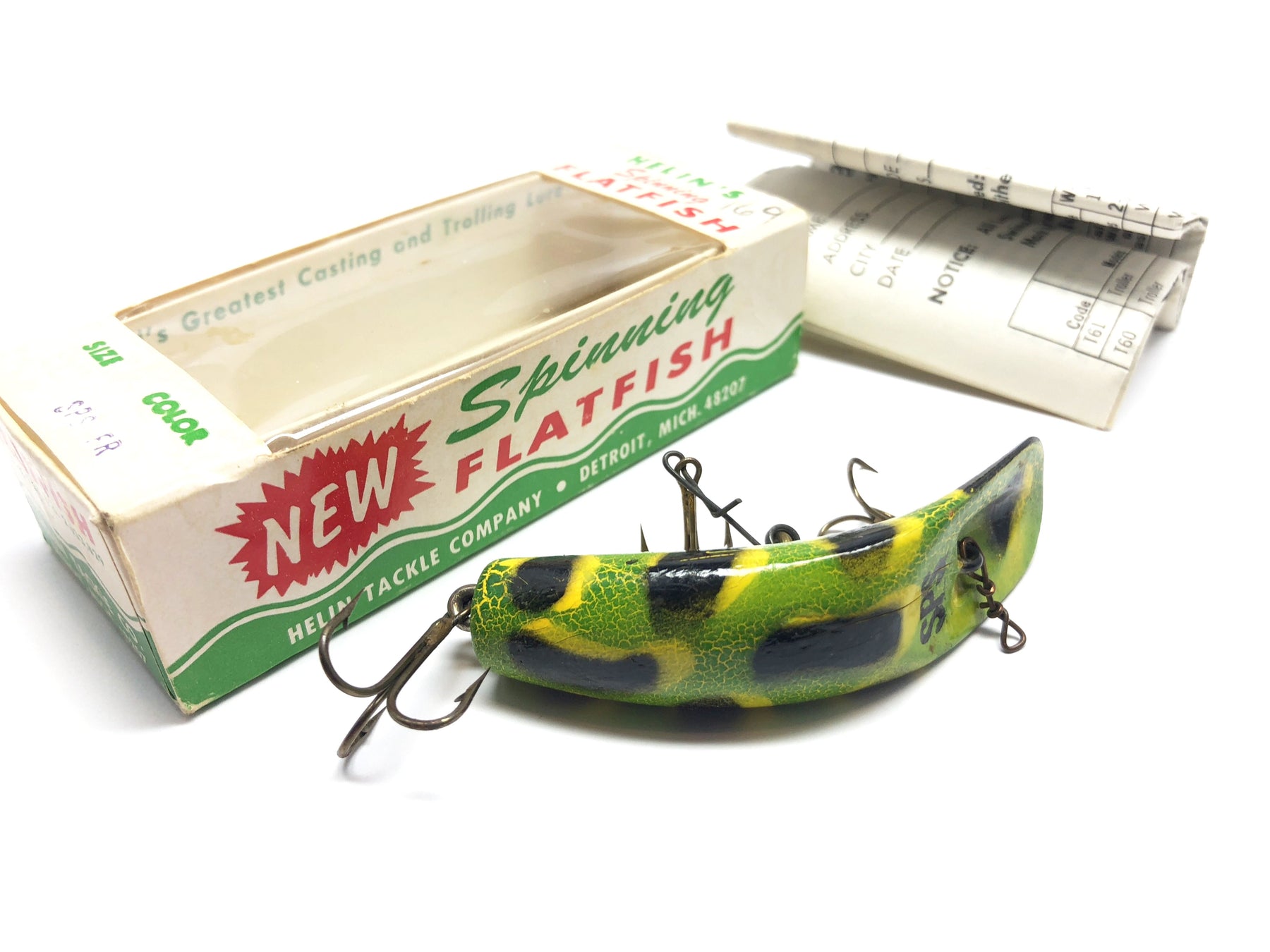 Helin Vintage Wooden Flatfish SPS FR Frog Color with Box and Paperwork. Lure is vintage but in very good condition. Box and paperwork nice as well. See photos. Tough to find Spinning Flatfish SPS model.