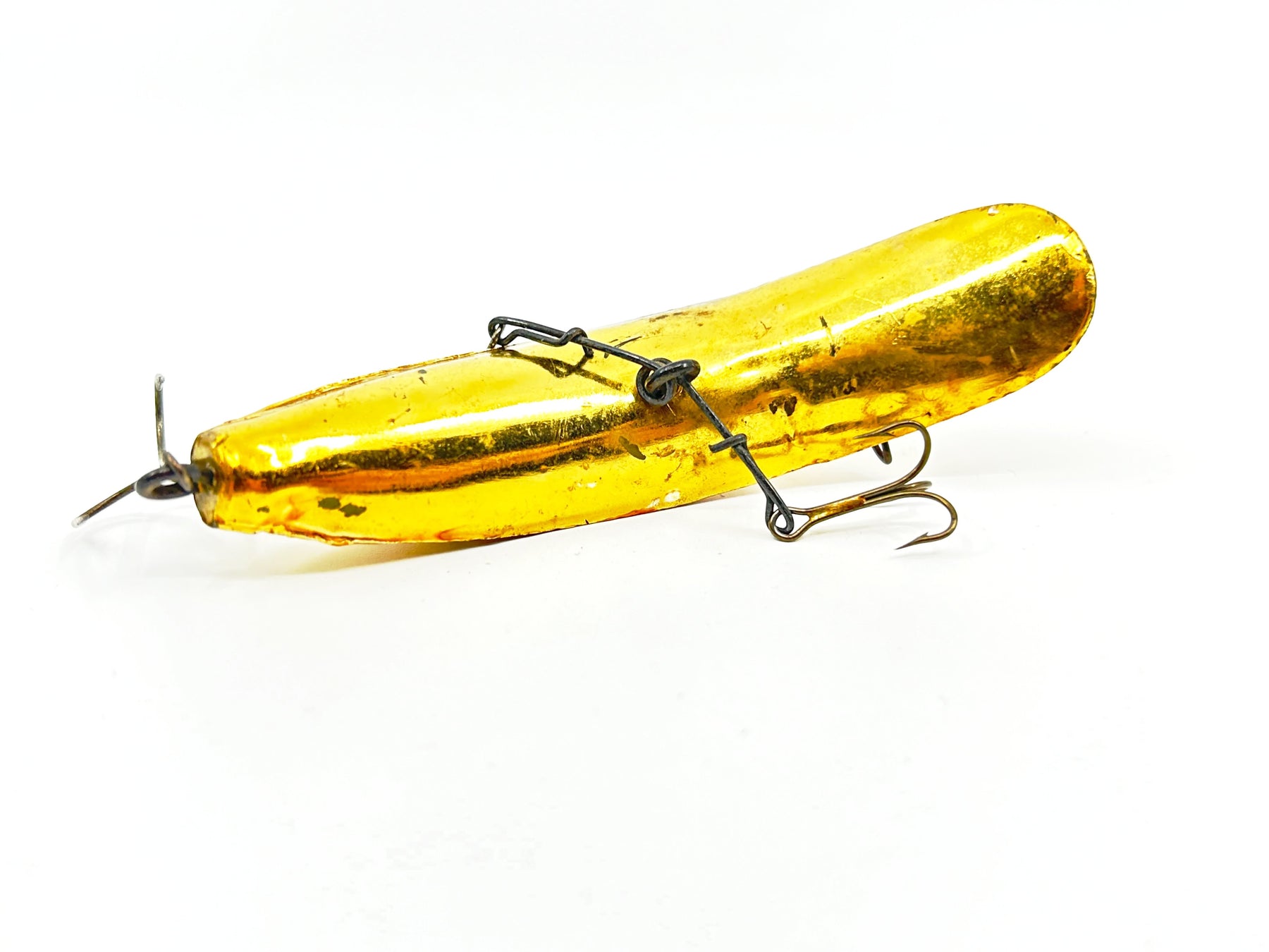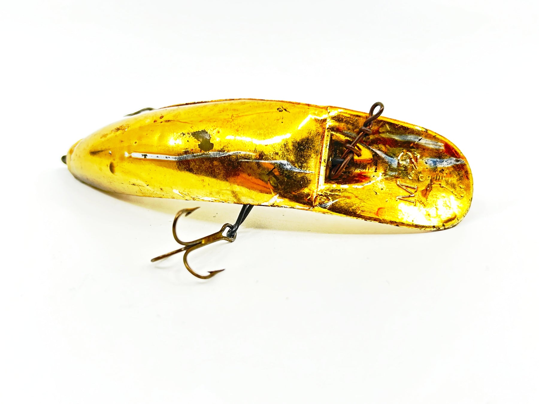 Helin Flatfish M2, Gold Plated Color. About 4 1/4" long. Used with some wear but overall in good condition, see photos. One of the most successful fishing lures ever made. Fish or collect! Vintage plastic version.