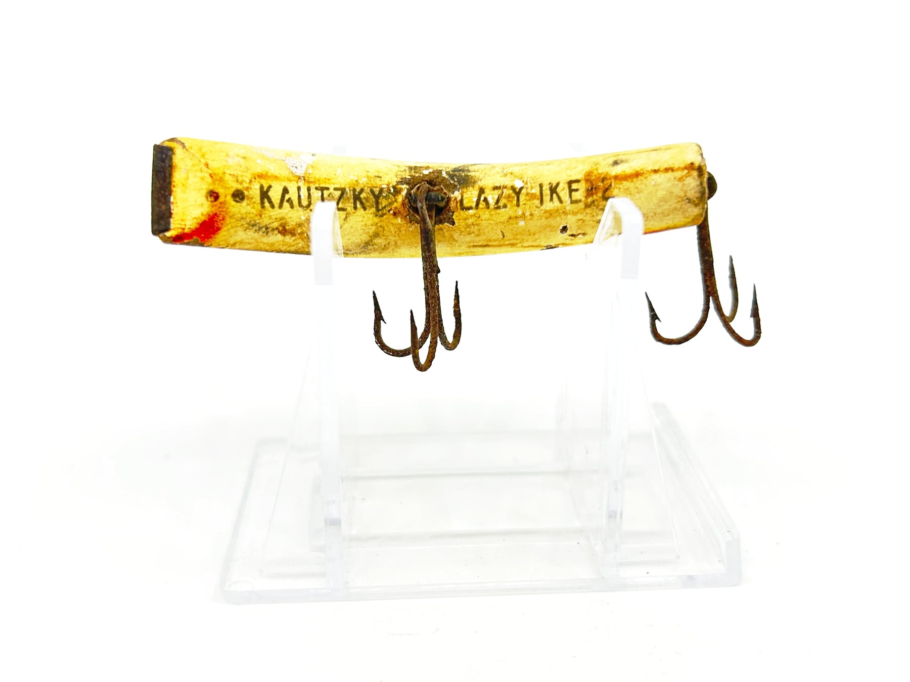 Kautzky Lazy Ike 2 Yellow Spots Color-Wooden Warrior.  About 2 1/2" long.  One of the most famous lures of all time.  Lure is vintage and used with a lot of wear.  This one is a project bait.  Fix it up and take fishing or just display as is as the vintage warrior that it is.  Dates to the 1950's.  See photos.