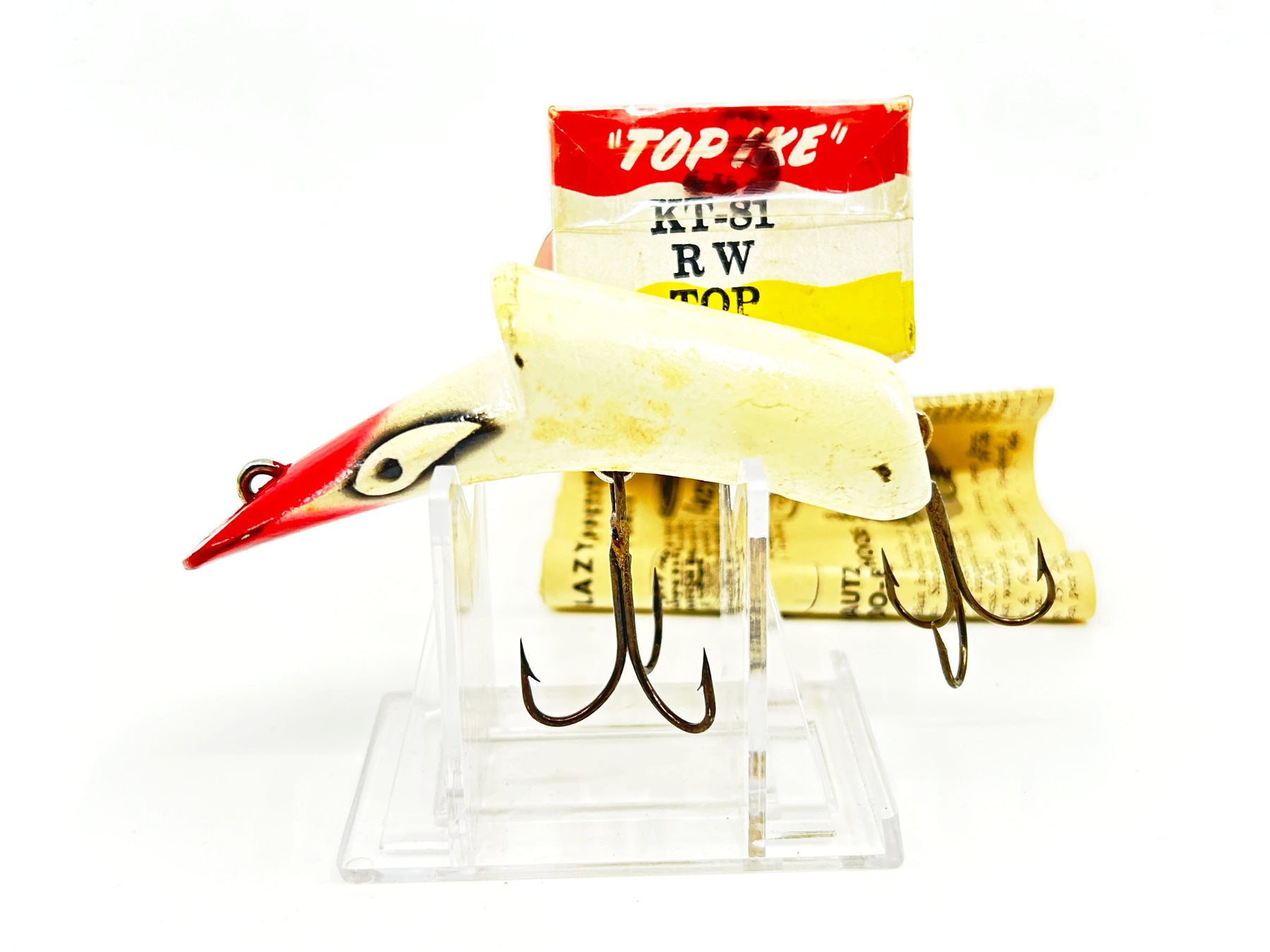 Kautzky Lazy Ike Top Ike Wooden Lure Red White Color with Box. Great vintage lure dating to somewhere in the 1950's. About 3 1/2" long. Used with some minor wear but overall in good condition and may clean up better, see photos. Matching box has some wear but overall good condition. Includes box paperwork. Great classic lure here. Fish or collect.