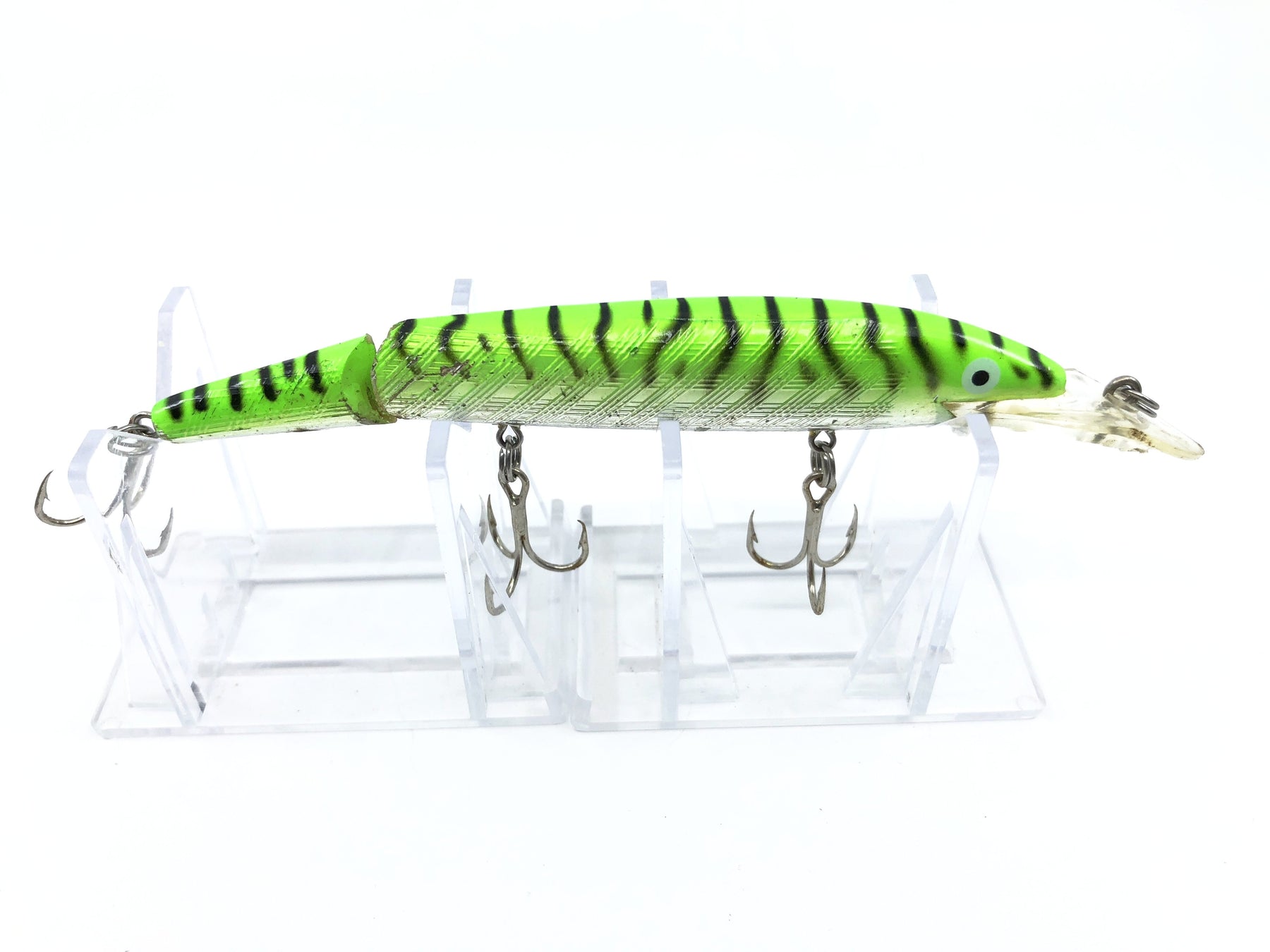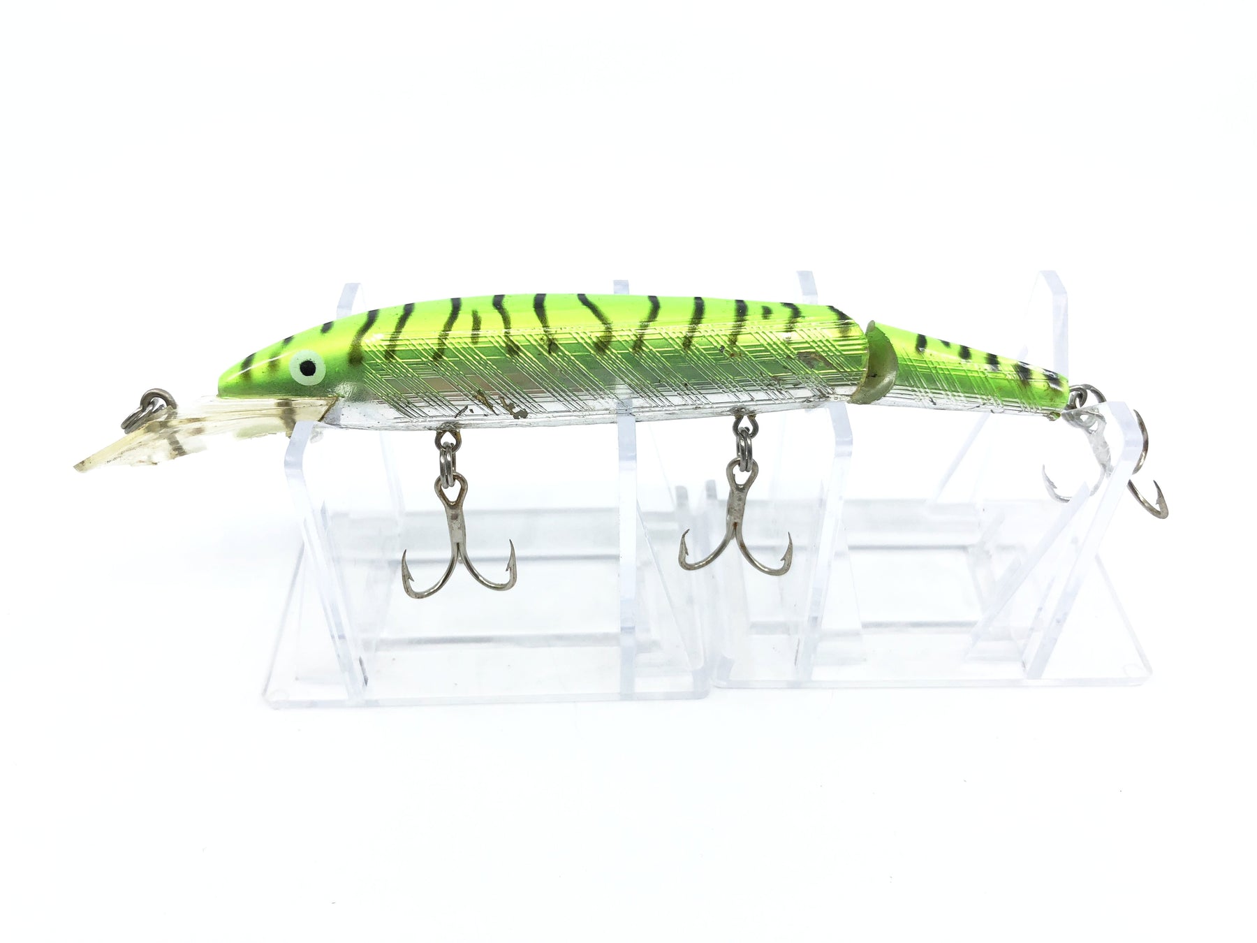 Vintage Rebel Fastrac Jointed Minnow Green Black Stripes and Silver Color.  Smaller size version.  About 4.5" body excluding lip.  Used but good condition, see photos.  Beautiful baits great for fishing and becoming very collectible.  Nice color.