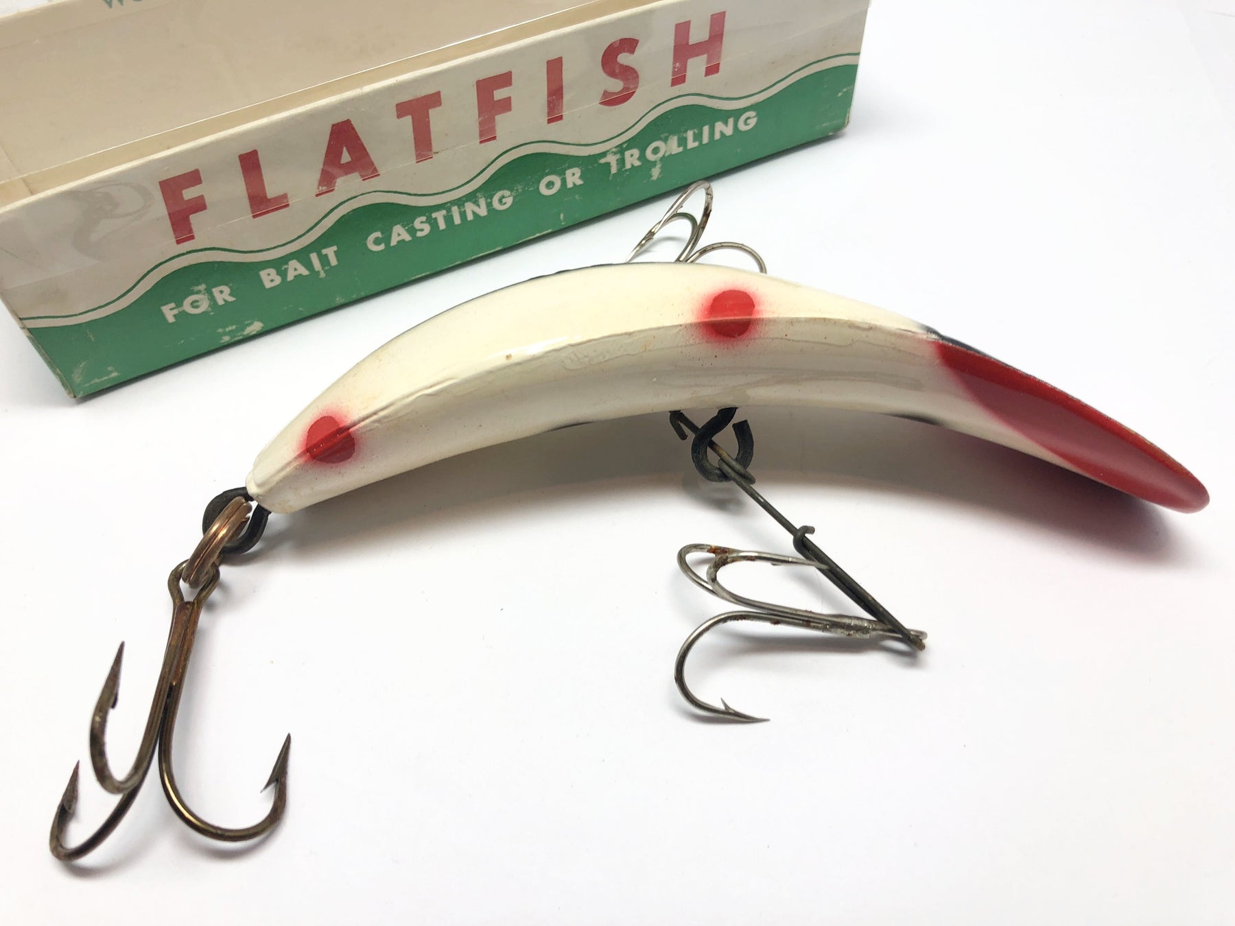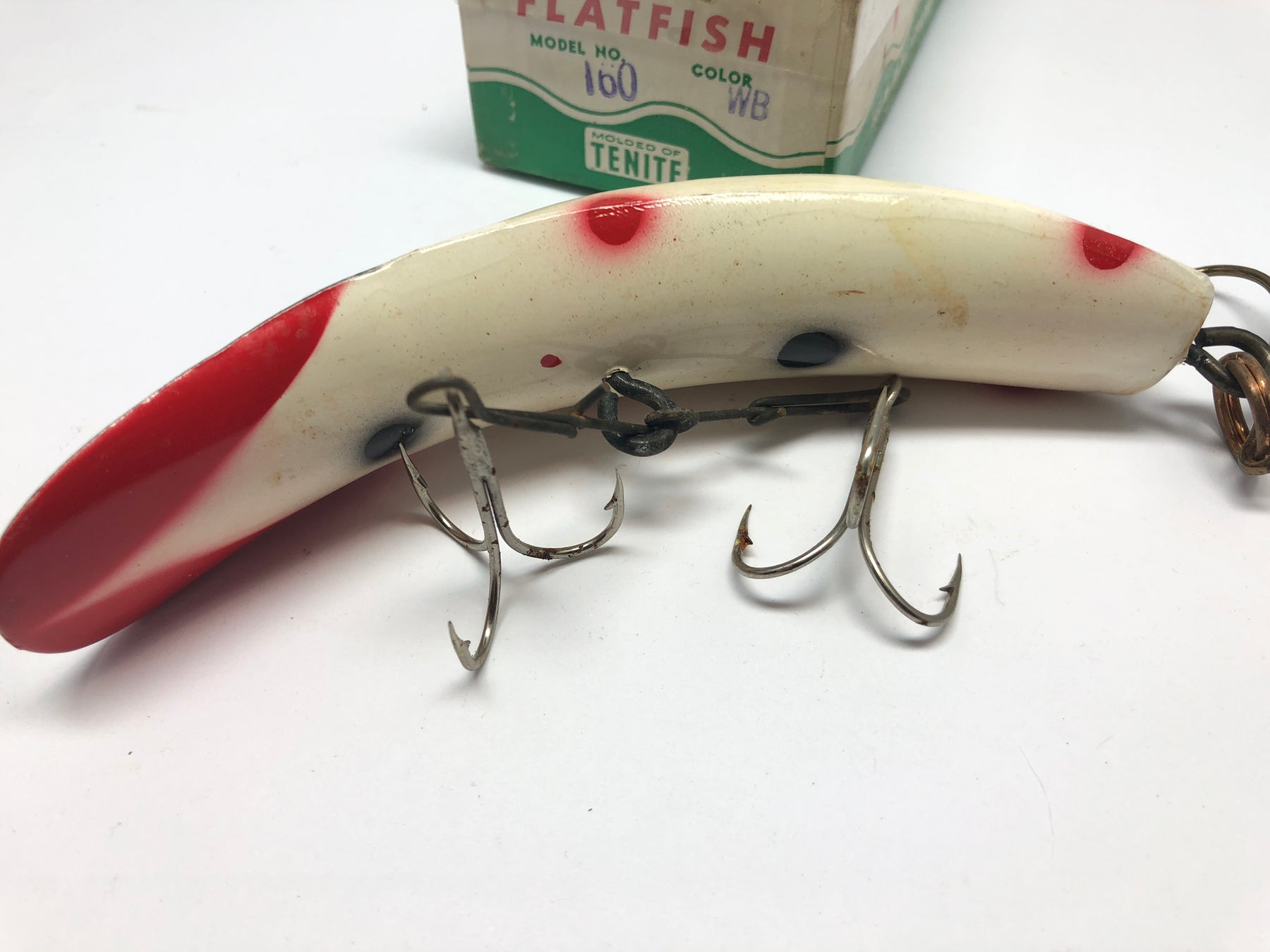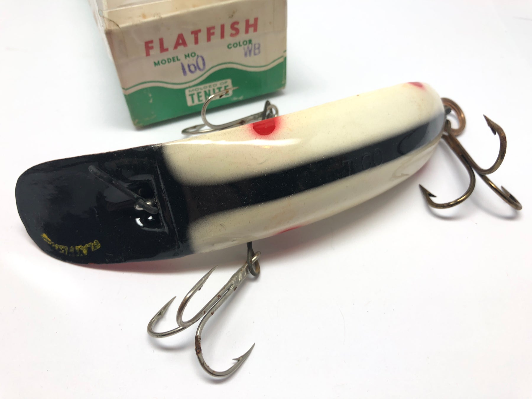 Helin Flatfish T60 WB White and Black with Red Dots New in Box.   Huge lure here, about 6" long.  Box has some wear with grime on plastic cover.  End marked correctly.  Lure is in fantastic shape, never fished.  Whether you collect or fish you can't go wrong with this lure.  One of the top sellers and best fish catchers of all time.  Cast or troll with this big boy!