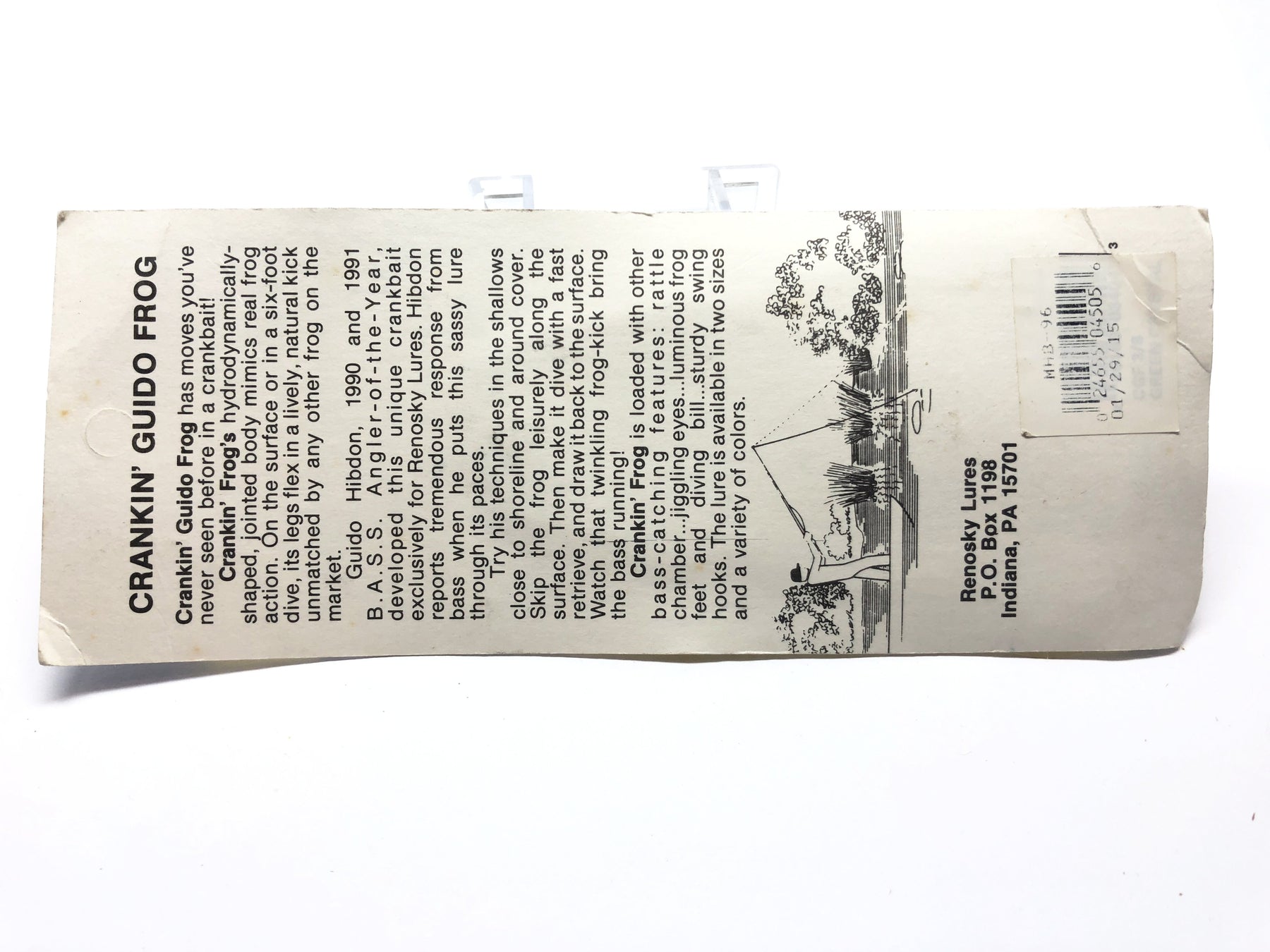 Renosky Crankin' Guido Frog Purple Frog TOUGH COLOR New on Card.  New on Card.  Great lure here from the 1990-91 BASS Angler of the Year Guido Hibdon.  3/8 oz, rattle chamber, kicking feet.  Great lure from Renosky Lures in Indiana, PA.  Tough to find these lures.  Card has minor wear, lure is new.