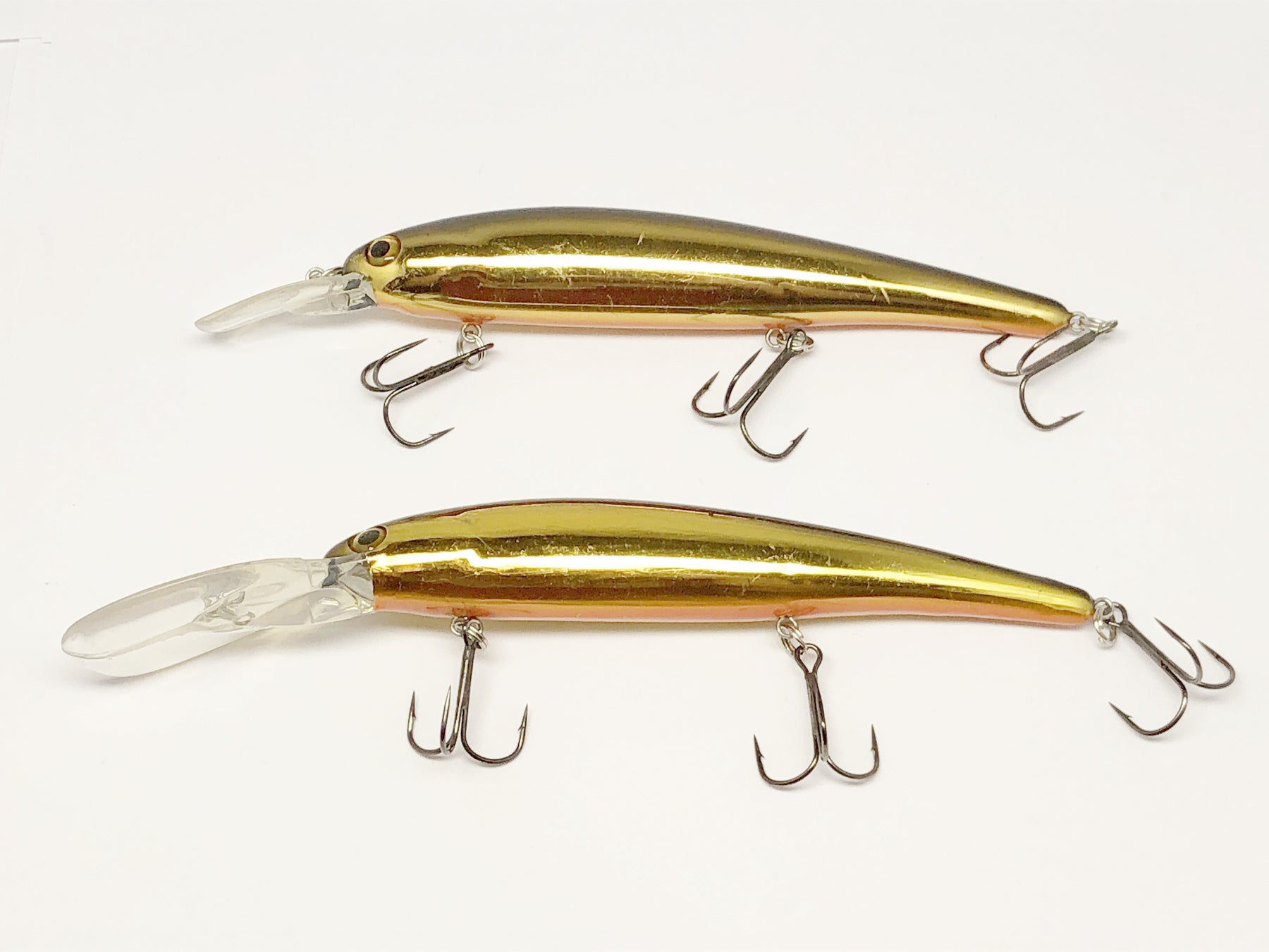 Two Large Unmarked Gold Lures. At about 6" and 5 1/2" long these two lures are in new like condition and would look great in your tackle box. See photos.