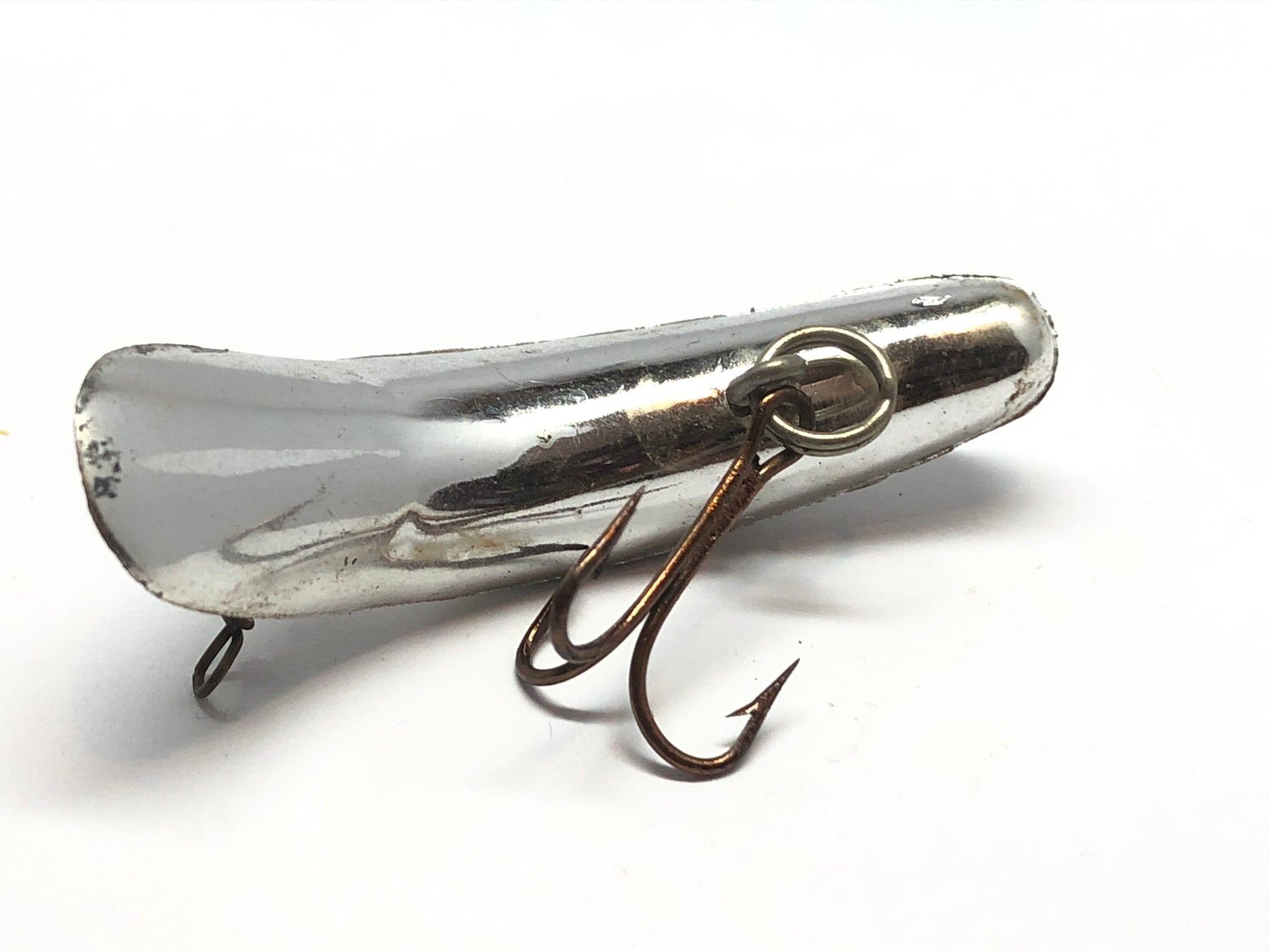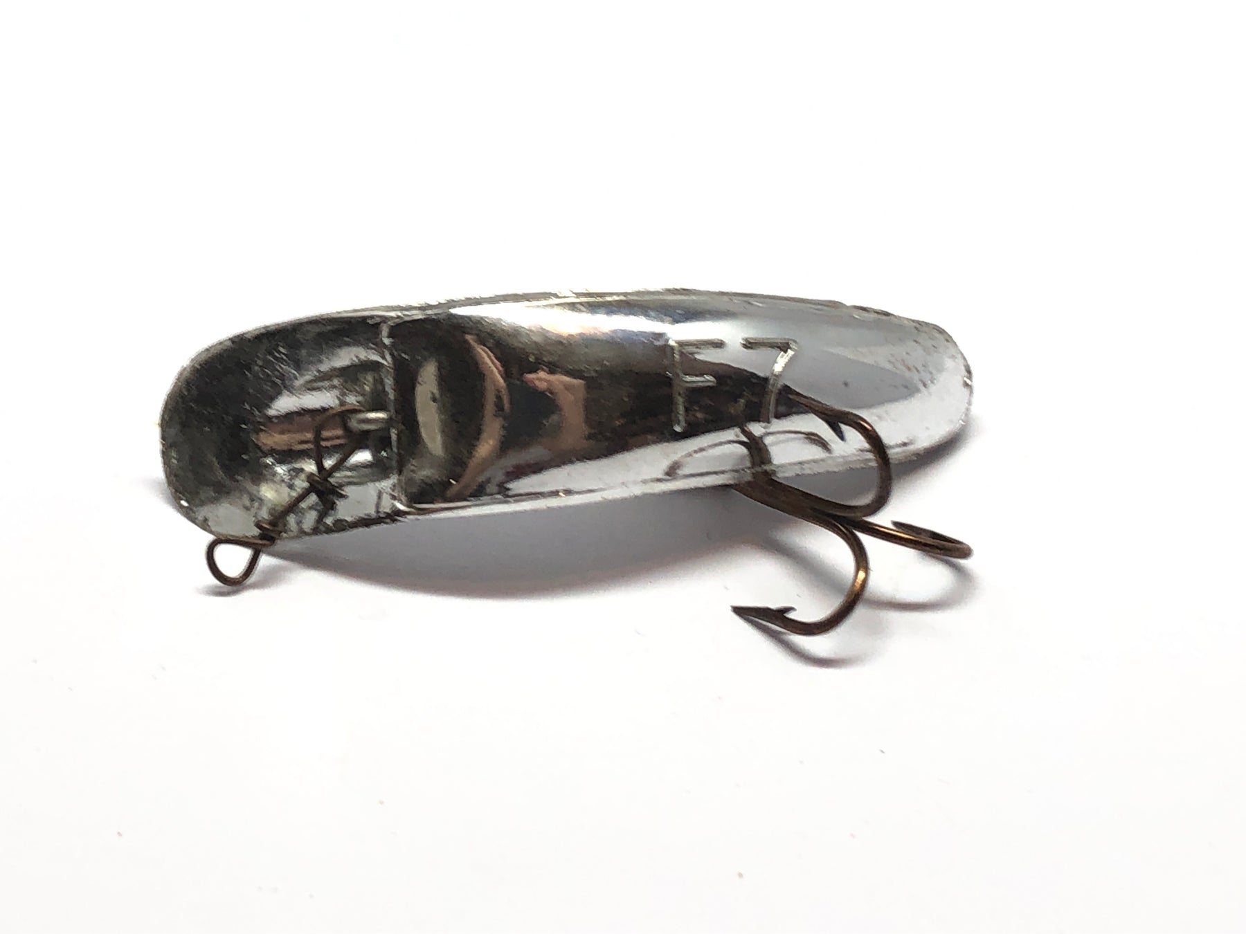 Helin Flatfish F7 Silver Chrome. at about 2 1/4" long this lure is in good condition with a few chips revealing its black body. See photos.