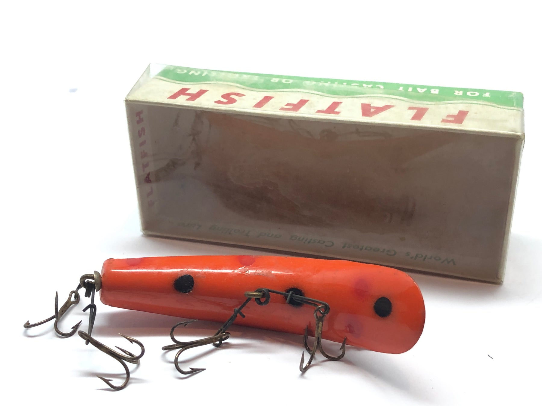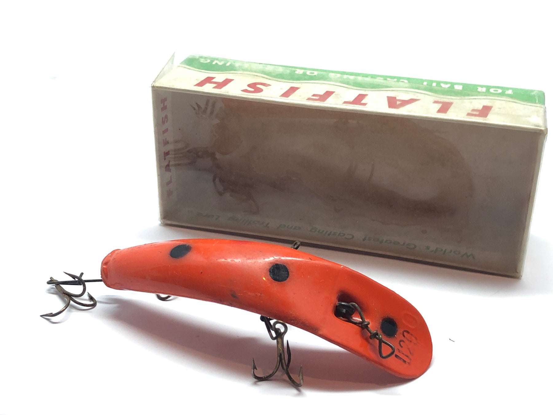 Helin Flatfish Orange U20 with Black and Red Dots in Box. At about 3 1/4" long this lure is in good condition with some scratches and some gritty residue on it. The box is unlabeled and the cover is covered with dirt. See photos.