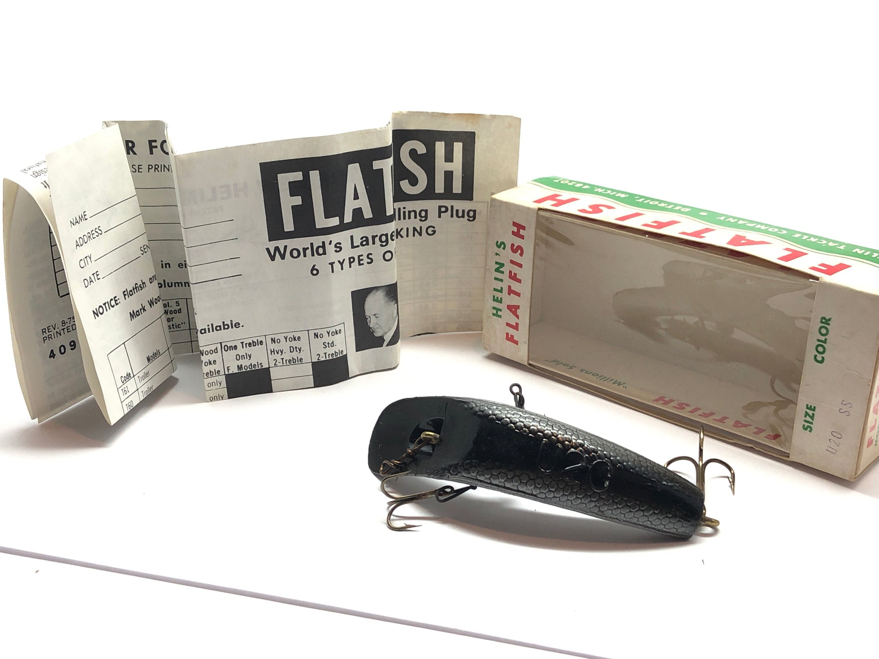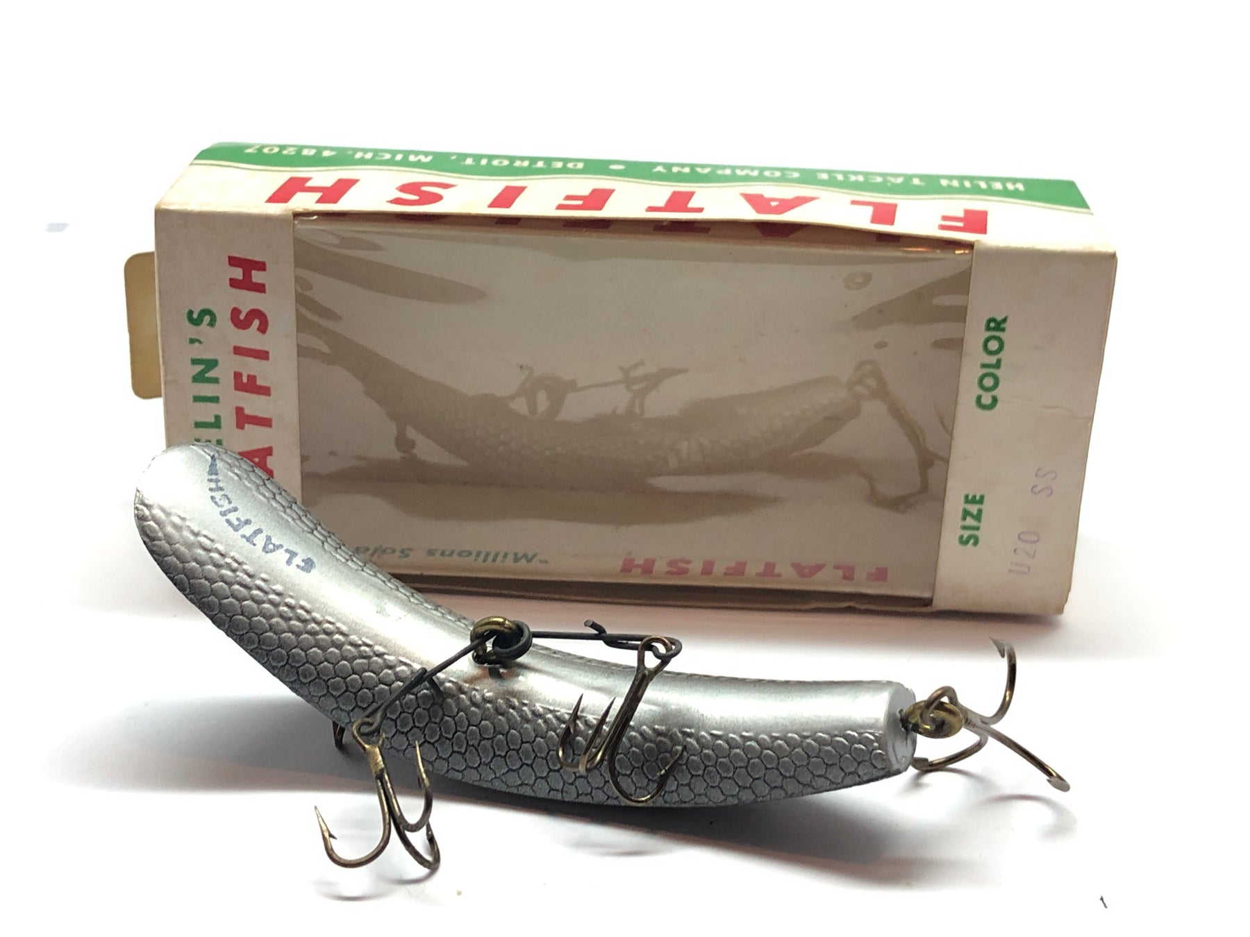 Helin Flatfish U20 SS Black Silver and Grey Scales in Box. At about 3 1/2" long this lure is in new like condition and comes in a unique pattern with defined scales. See photos.