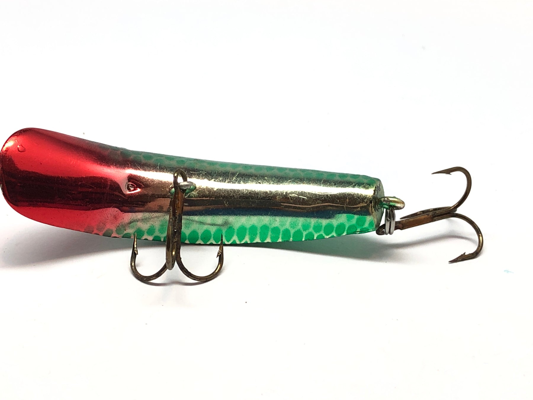 Kwikfish K10 Red, Silver, and Green. at about 3" this lure is in superb condition but it does show some signs of use such as the small scratches on the bottom. This lure would look great in your collection or tackle box. See photos.