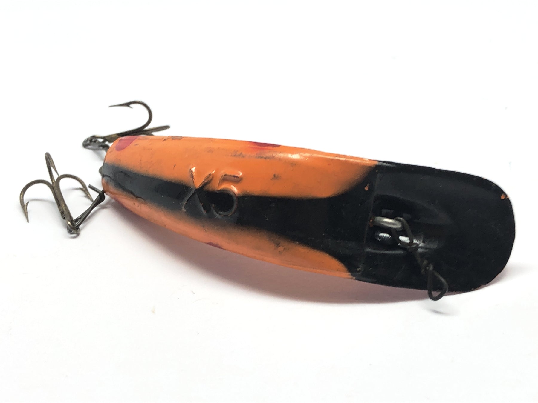 Helin Flatfish X5 OB (Orange Black Stripe). At about 2 3/4" long this flatfish is in good condition with some markings and dirt. This lure is also missing its front hooks but this could be easily replaced. See photos.