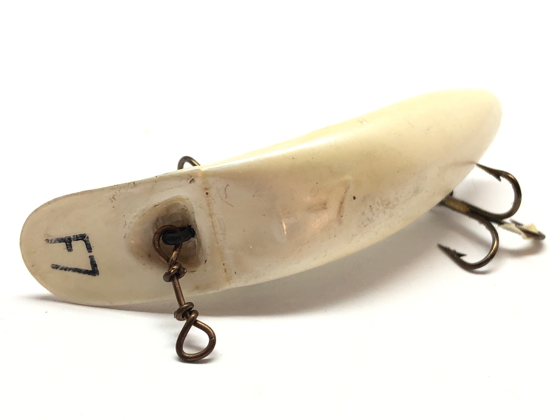 Helin Flatfish F7 PE (Pearl). At about 2 1/4" long this lure is in great condition with little wear and dirt making the white lure the perfect addition for your collection or tackle box. See photos.