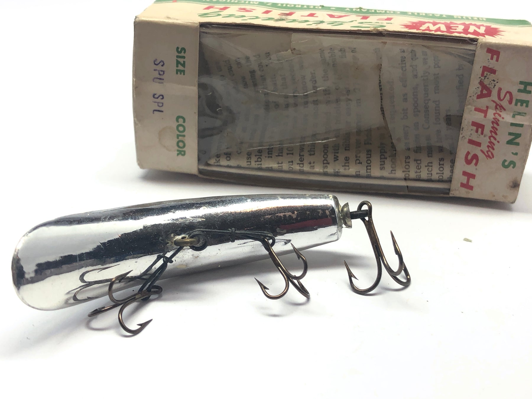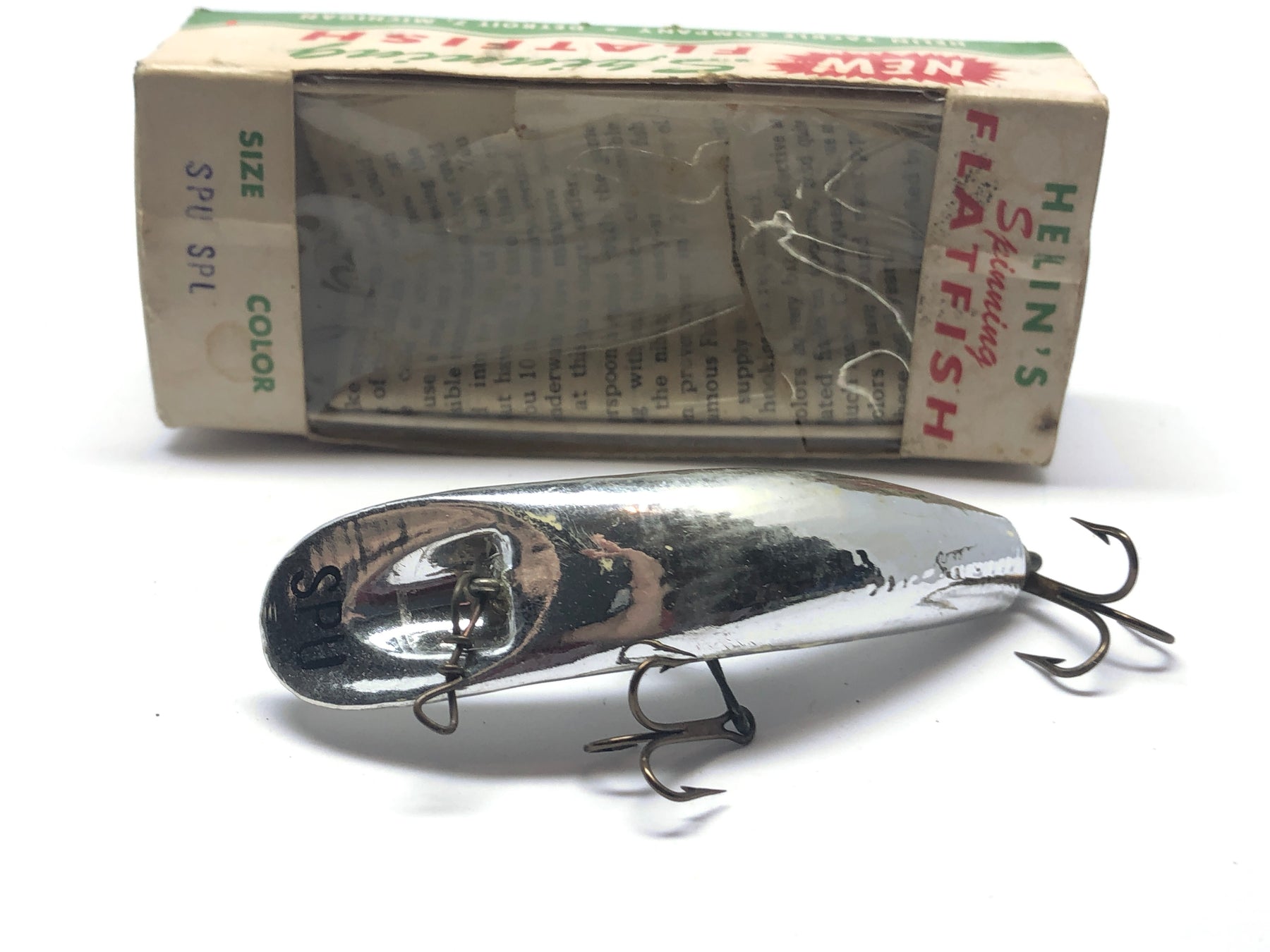 Helin Flatfish SPU SPL (Silver Plated) with Box. At about 2 3/4" long this lure is in superb condition with very little wear. This is surprising because the matching box isn't in the best condition. See photos.