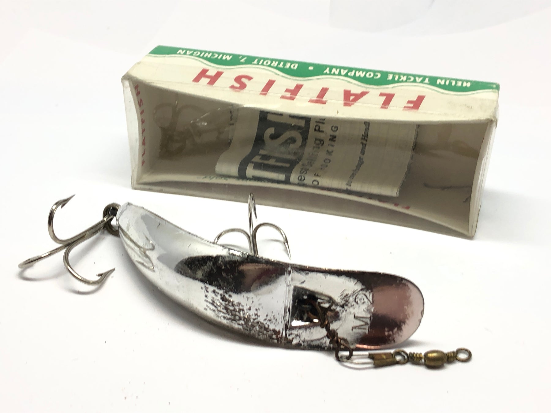 Helin Flatfish M2 SPL (Silver Plated) with Box. At about 4 1/2" long this lure is in ok condition with a number of scrapes. The matching box has the usual middle section collapse that happens over time. This lure would look great in your collection or tackle box. See photos.