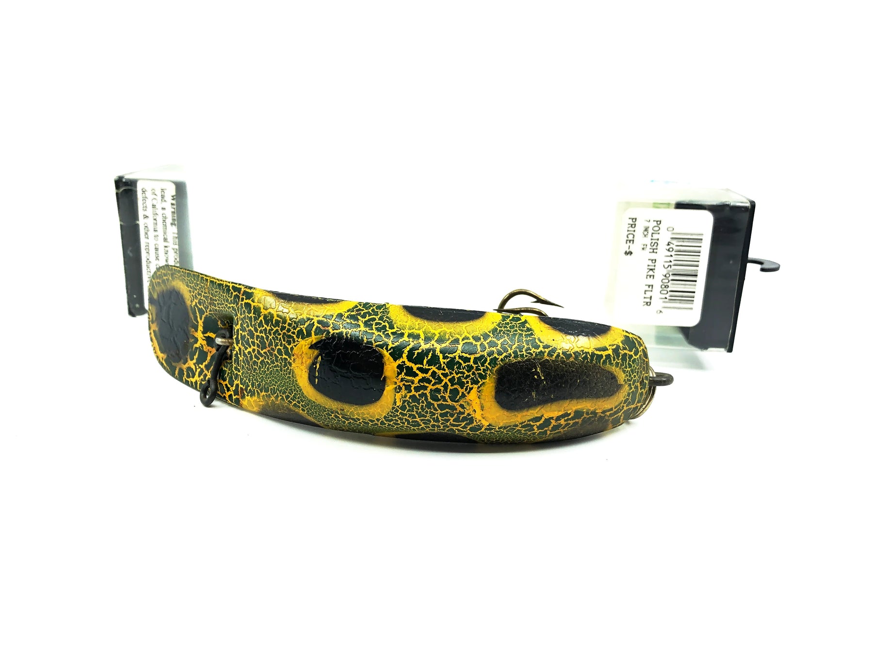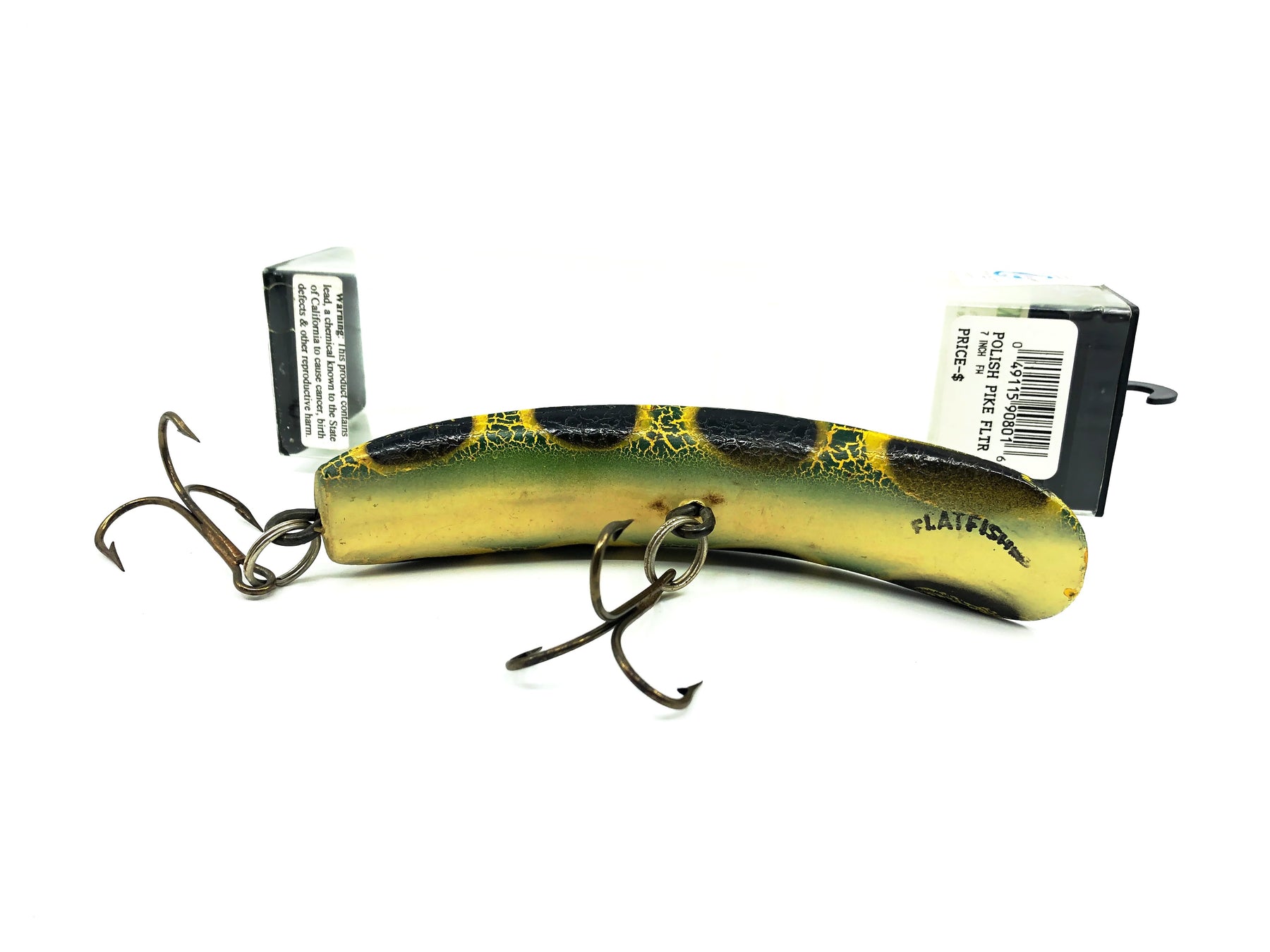 Helin T60 Flatfish Musky Lure, Frog Spot Color with Box. Box is for a completely different lure but still a great box for this lure. About 6" long. Used lure but has very minimal wear and appears to have been never been fished. In great condition. See photos.