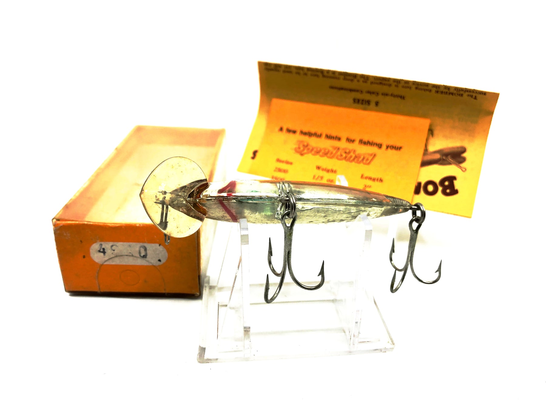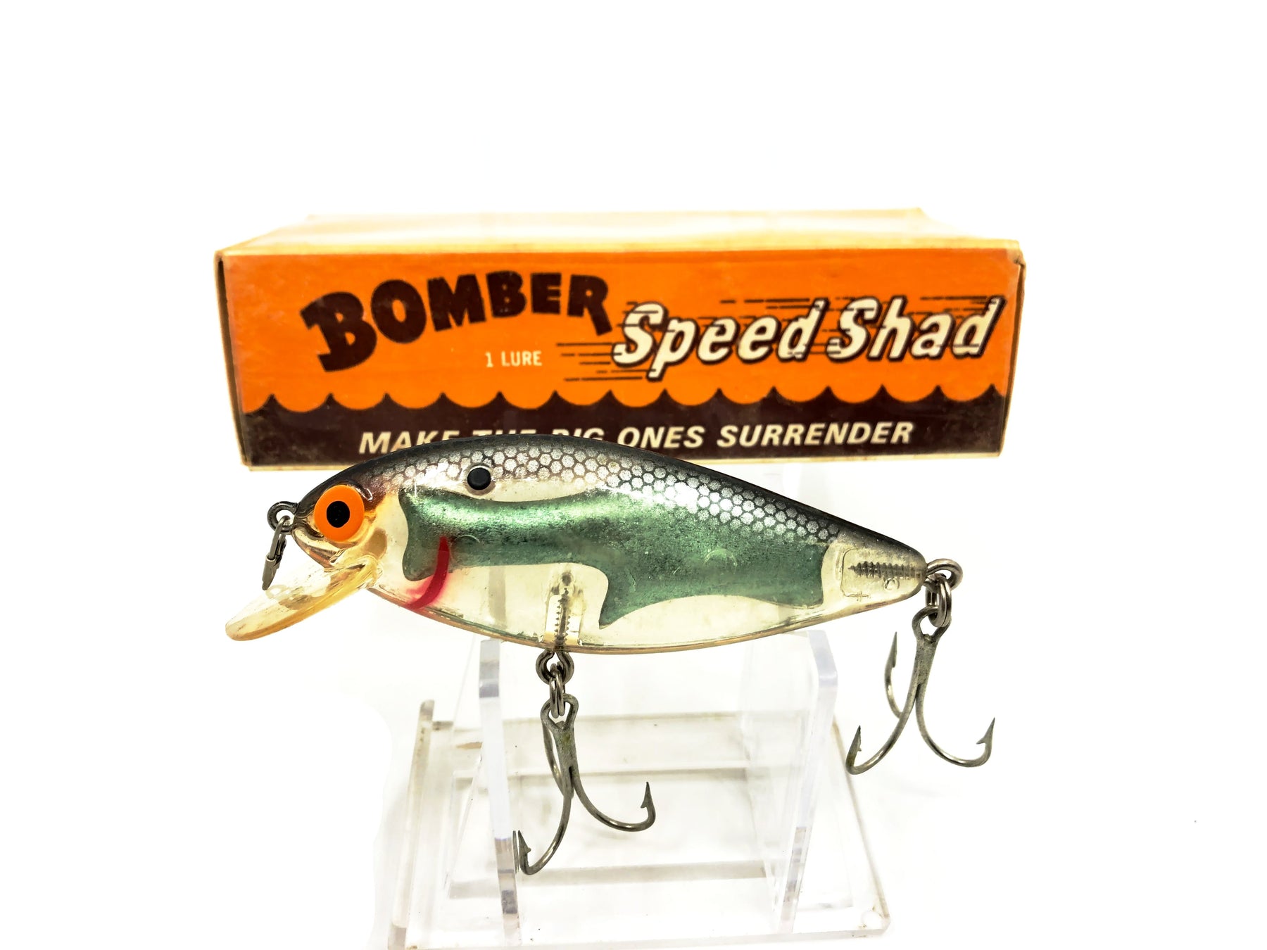 Bomber Speed Shad 4SAQ, Aqua Flash Color with Box. Hard to find combo. About 3" long body not including lip. Vintage lure with some wear and the internal flash has shrunk, still overall good condition, see photos. Box in good condition as well. Classic Bomber lure that hasn't been made in years. One of the all-time greatest lures for fishing. Bass, pike, musky, walleye and more! Fish or collect.