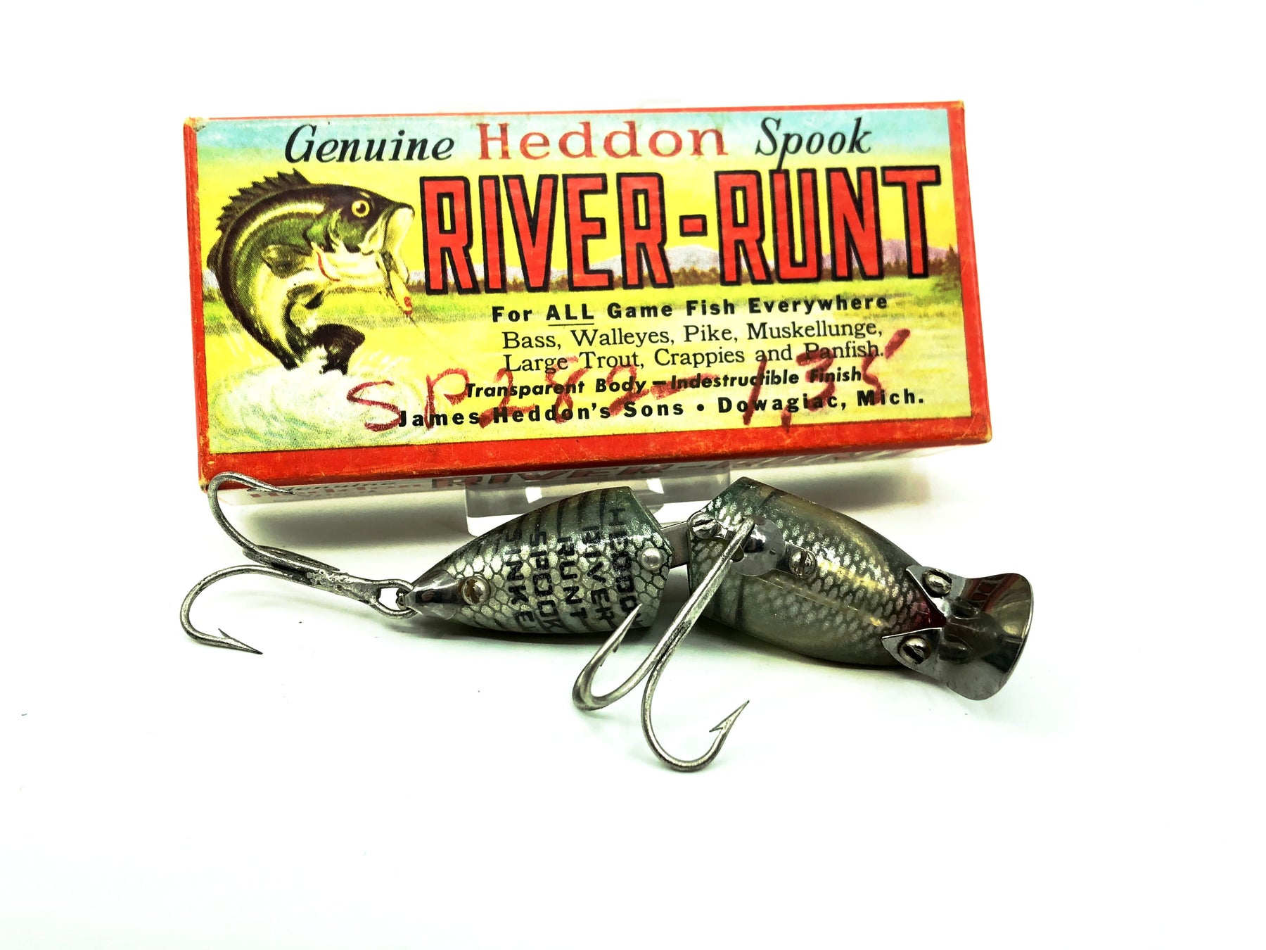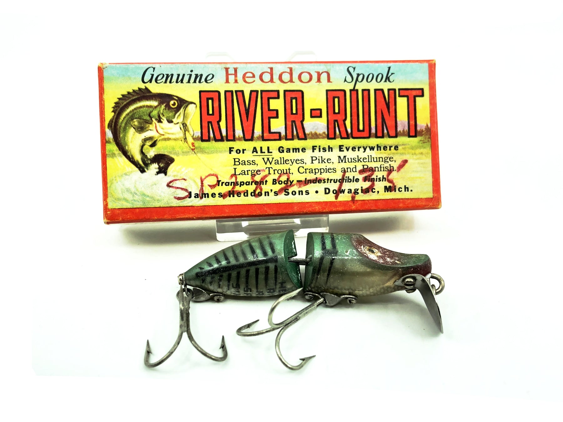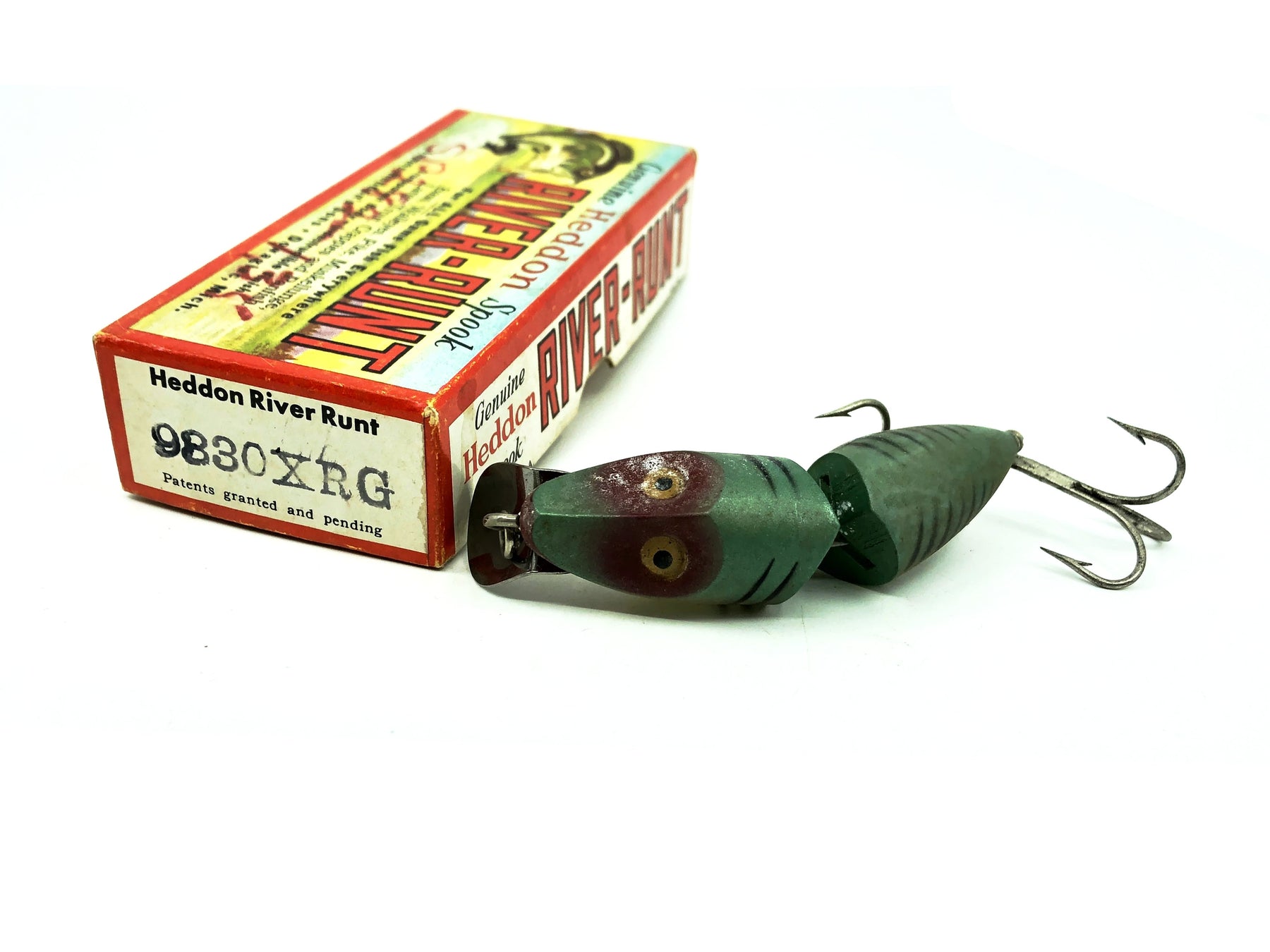 Heddon Jointed River Runt 9330-XRG, Green Shore Minnow Color with Box.  Great vintage bait here.  Box has some wear and writing on the front as shown, still good condition.  Lure overall good condition, see photos.  Nice combo here on one of the best lures ever made.  Two piece cardboard box dates this to at least pre 1955 or so.   See photos.  Nice color in a tougher jointed version.