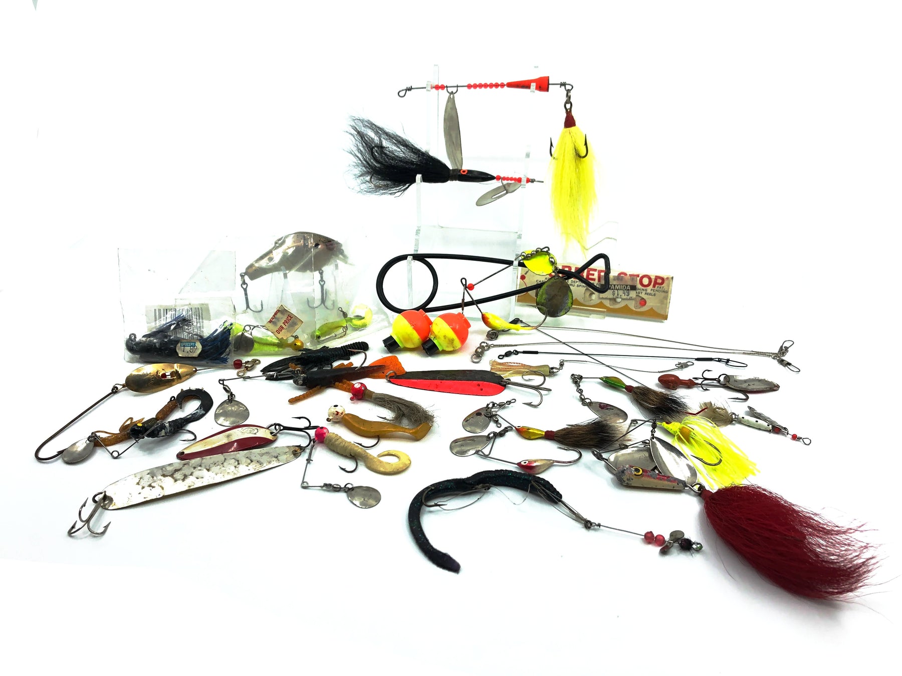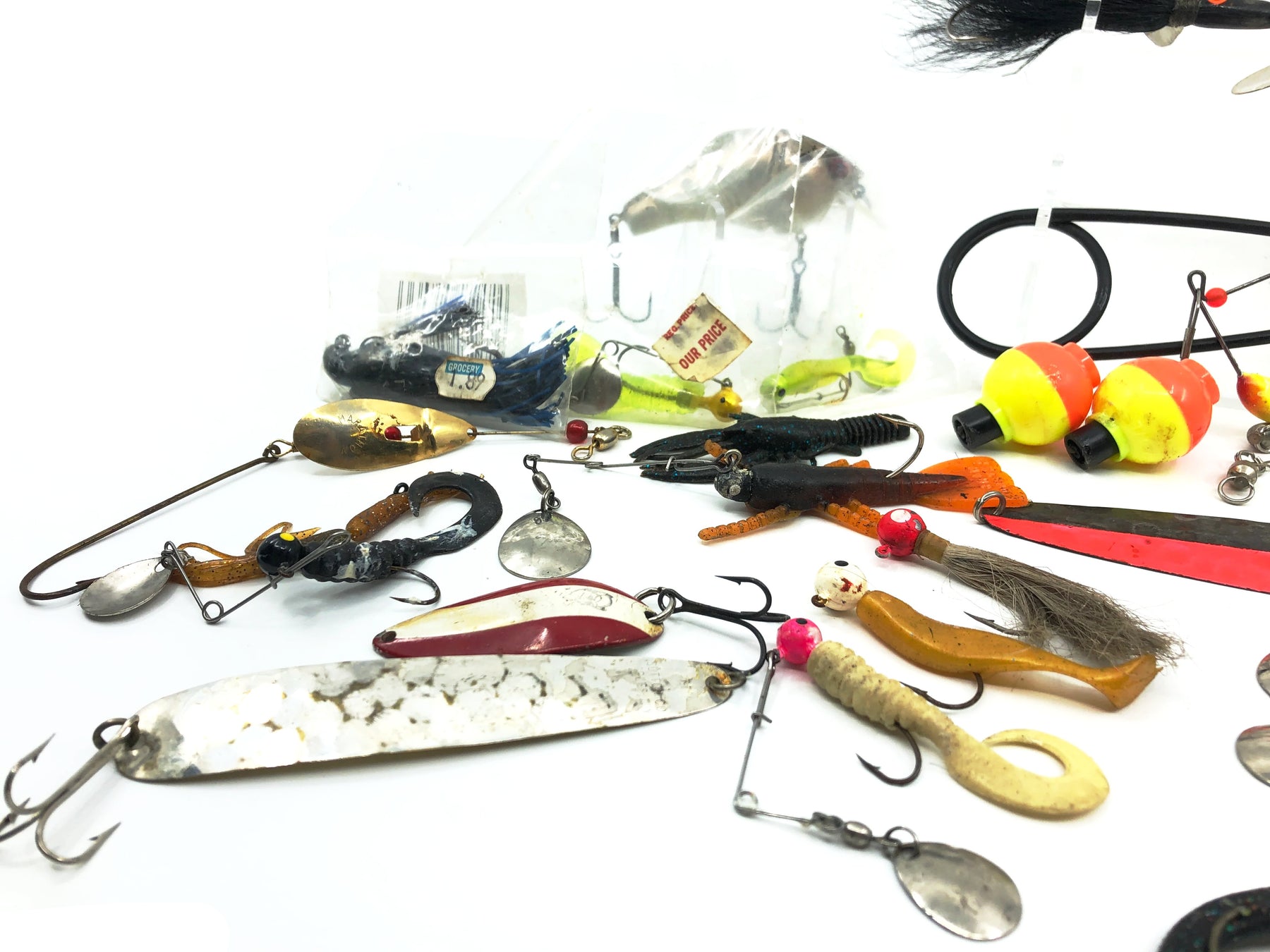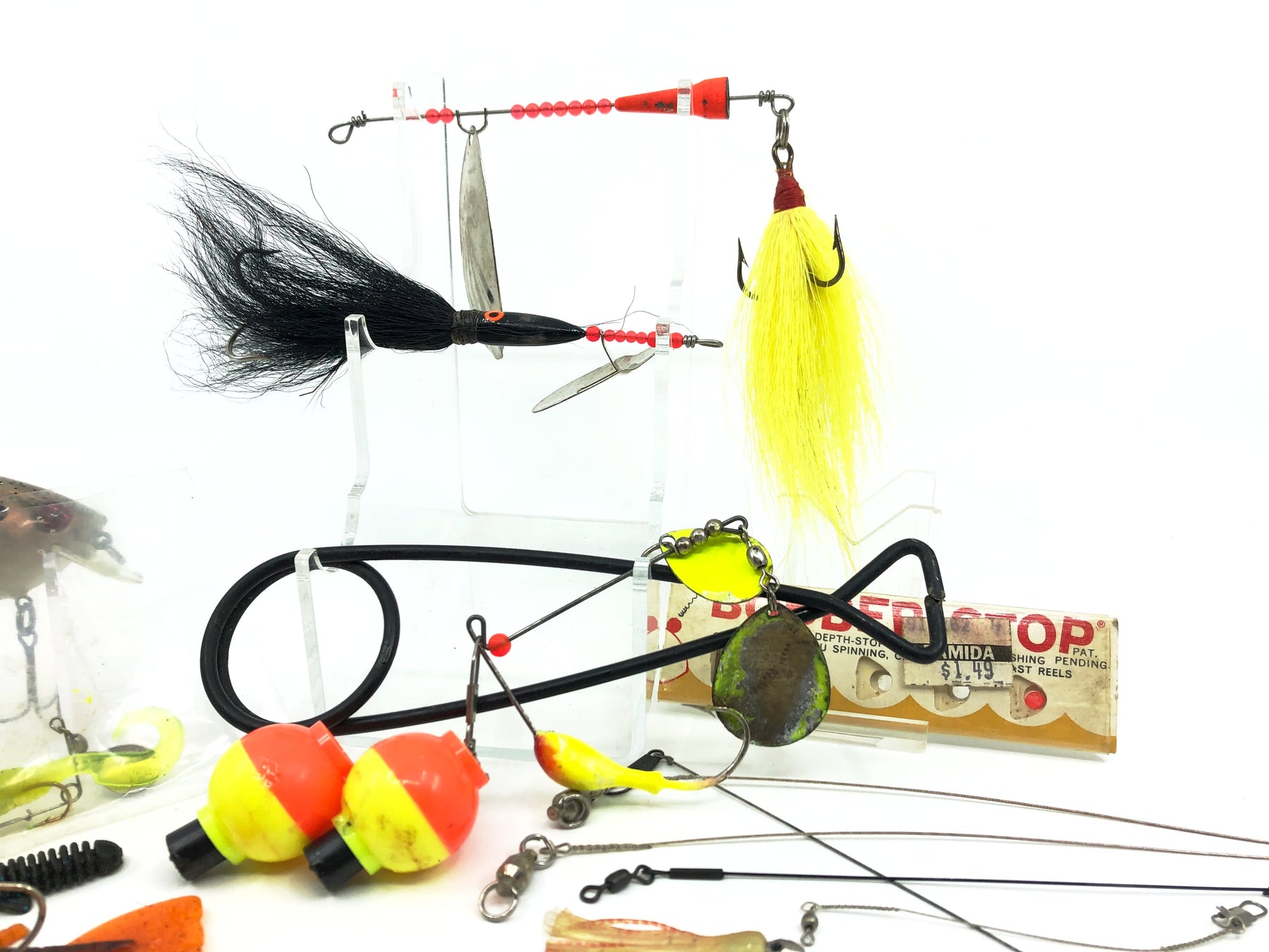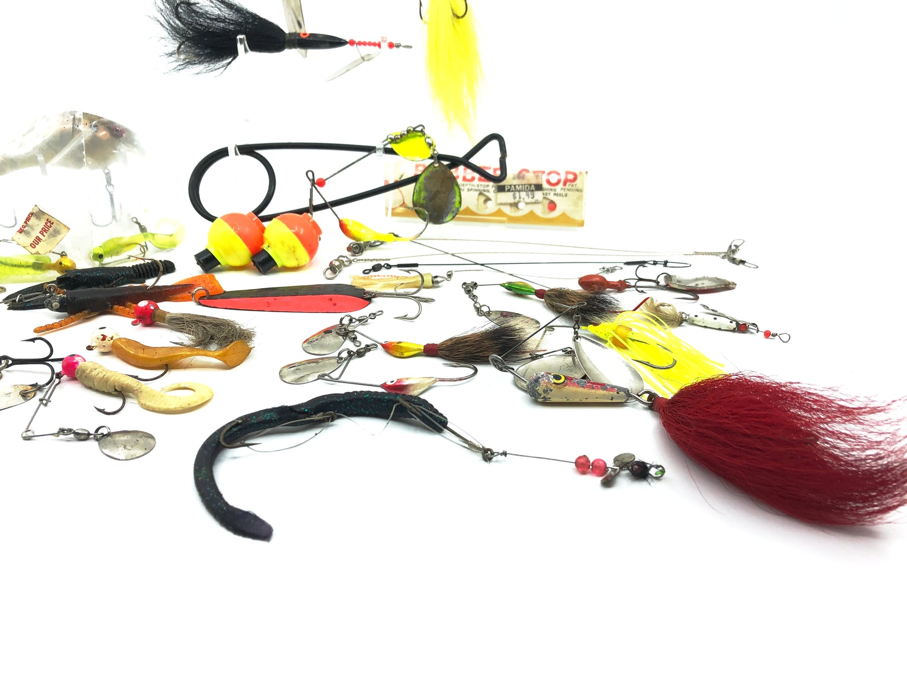 Vintage Tackle Box Stuffing Pack. This pack includes a variety of essentials for any fishermen's tackle box. All these objects are used or vintage with varying degrees of wear but are still in overall ok condition. Good stuff to fill up your tacklebox at a bargain price.