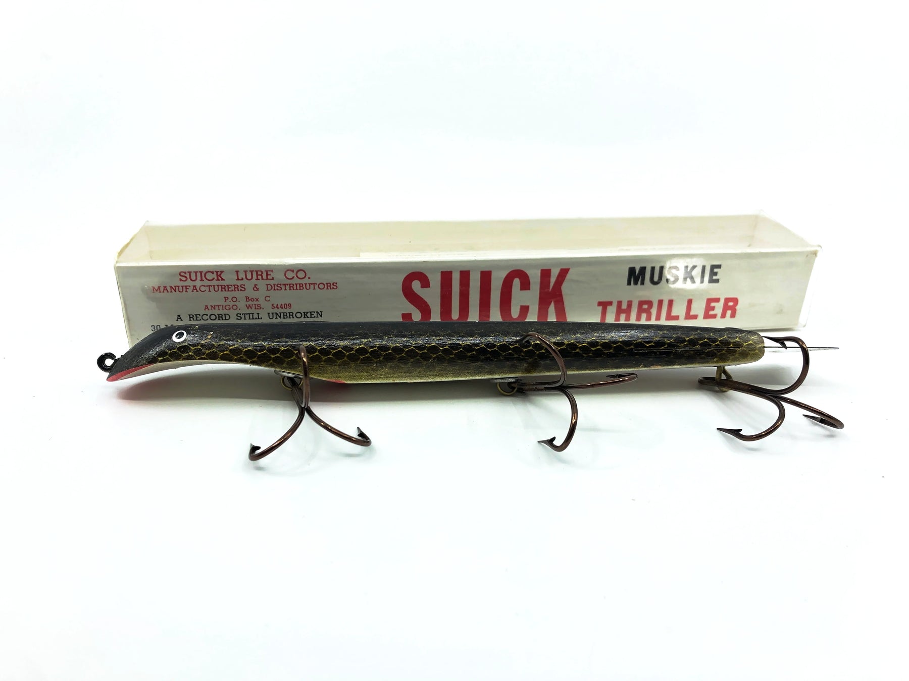 Vintage 9" Suick Muskie Thriller, Cisco Color with Box. Great vintage combo here. Box in decent shape. Lure in great shape. Great musky bait here. One of the all time best. Fish or collect this classic.