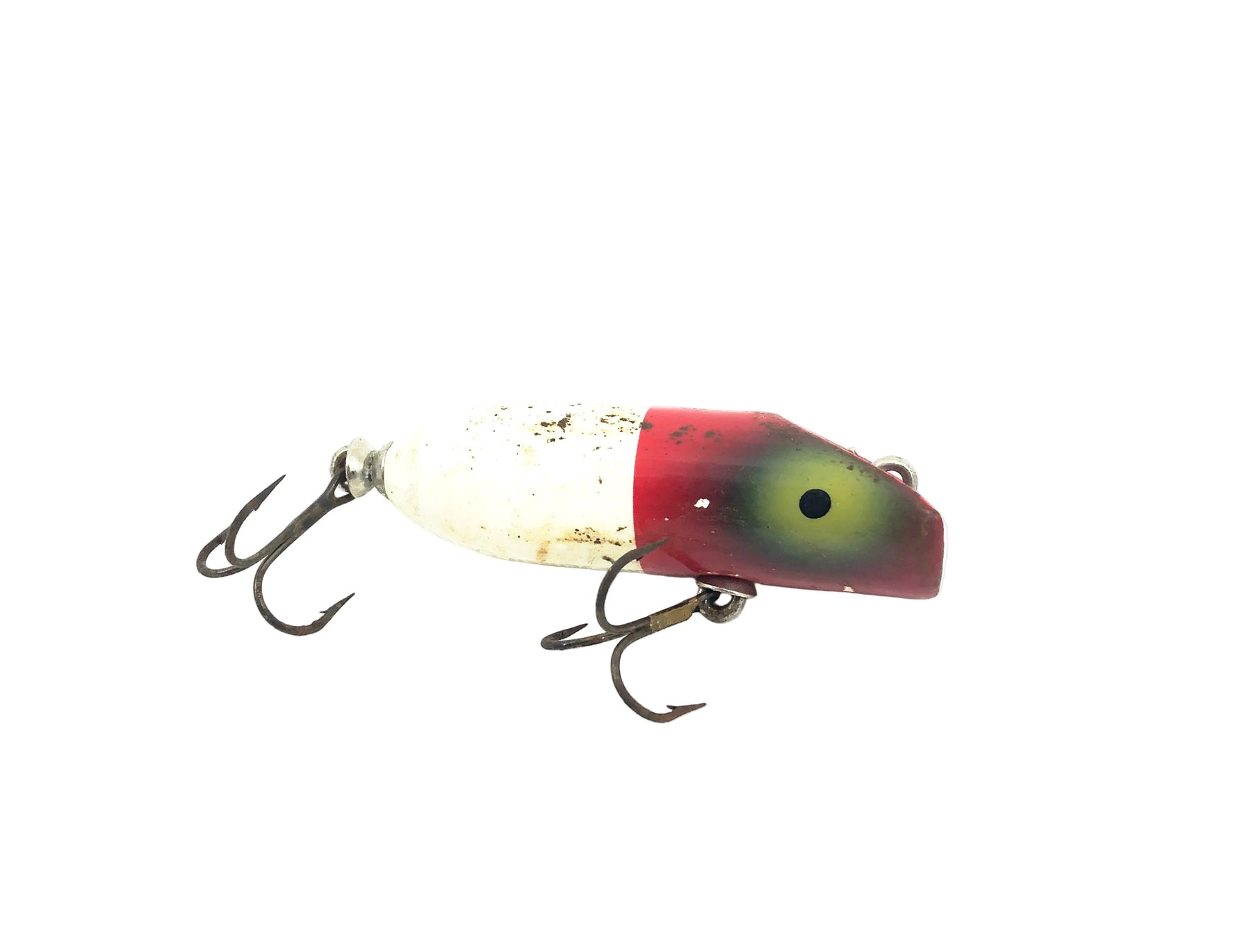 Luhr-Jensen South Bend Babe Oreno, Red Head/White Color. About 2 3/8" long. Lure is used with some wear and marks but in overall ok condition. One of the greatest fishing lures ever made. Fish or collect you can't go wrong on this one. See photos. One of the all time classic baits in wood.