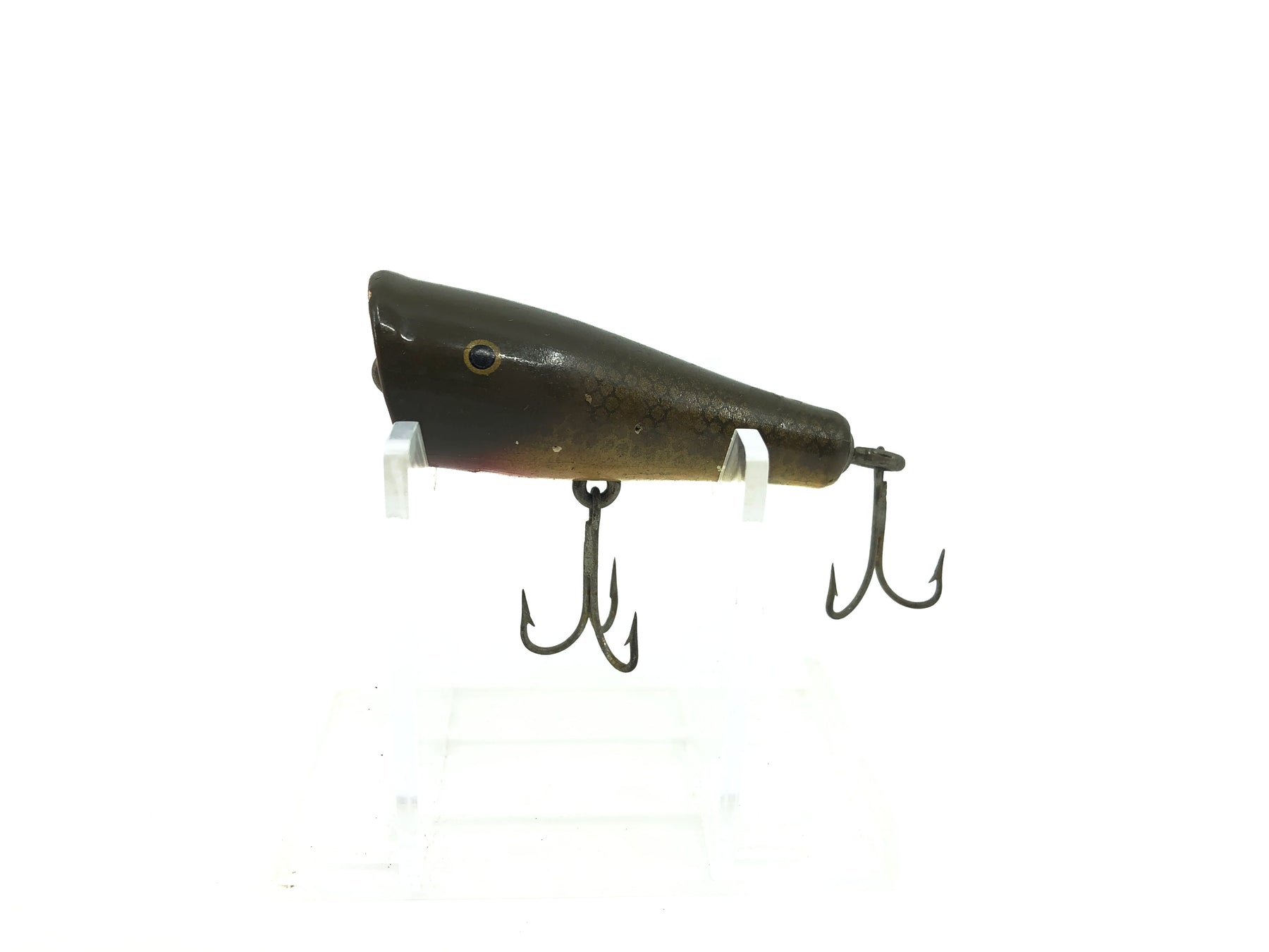 Shur-Strike River Plunker, Pikie Scale Color. About 2 1/8" long. Used vintage lure. Wooden lure, painted eyes. Made by Shur-Strike, the off brand of Creek Chub. Lure has some minor wear and a broken barb, overall in good condition, see photos. Great one for your collection here. See photos.