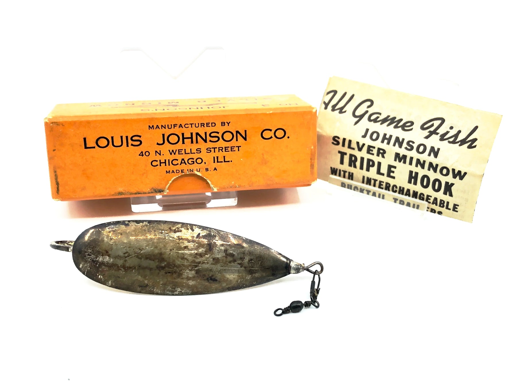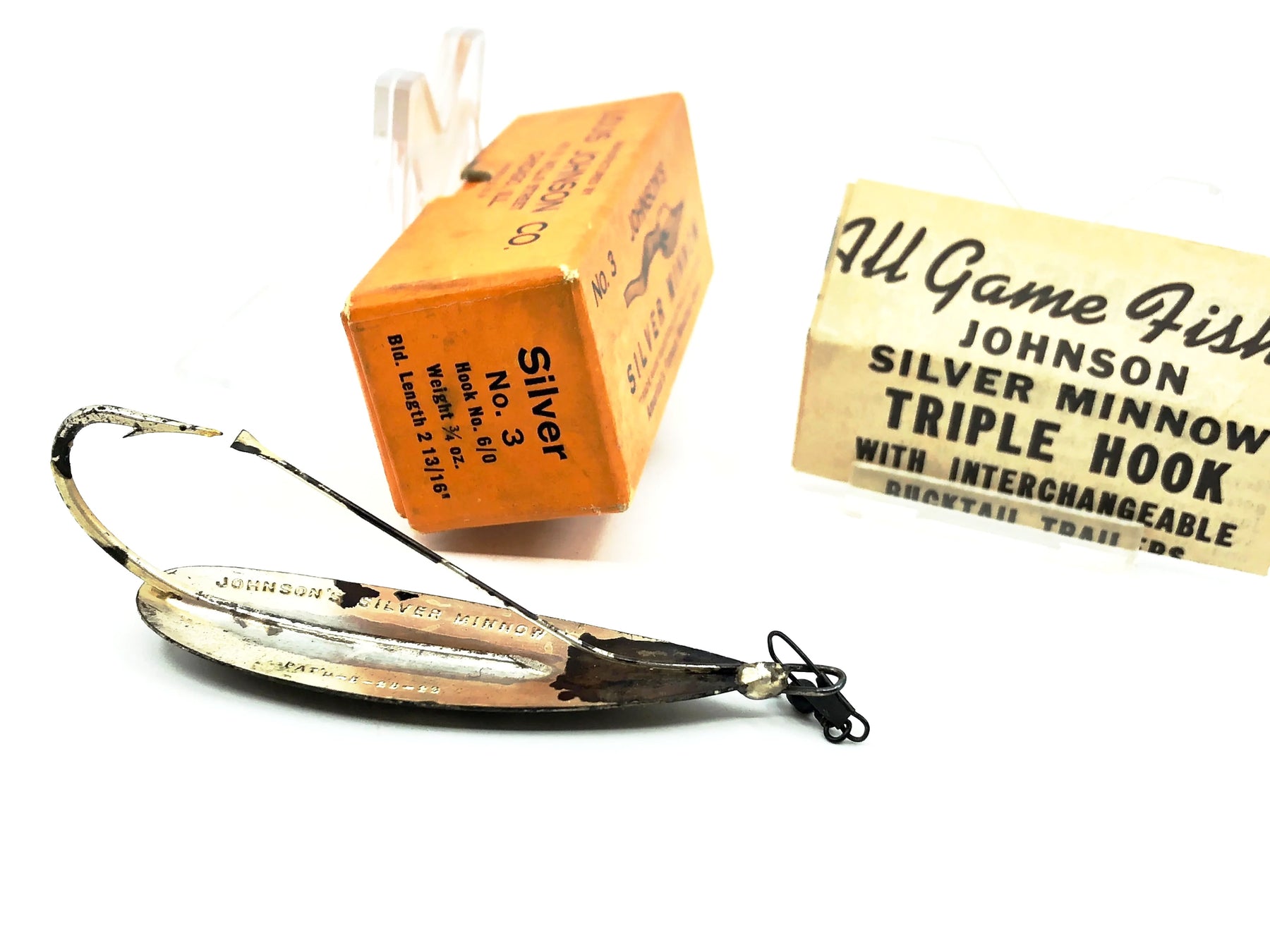 Johnson Silver Minnow No.3, Silver Color in Box. Older minnow in box.  About 3 1/4" long overall. Lure is vintage and has a good amount of wear. The box and paperwork is in good condition, see photos. Cool vintage box. Older box.