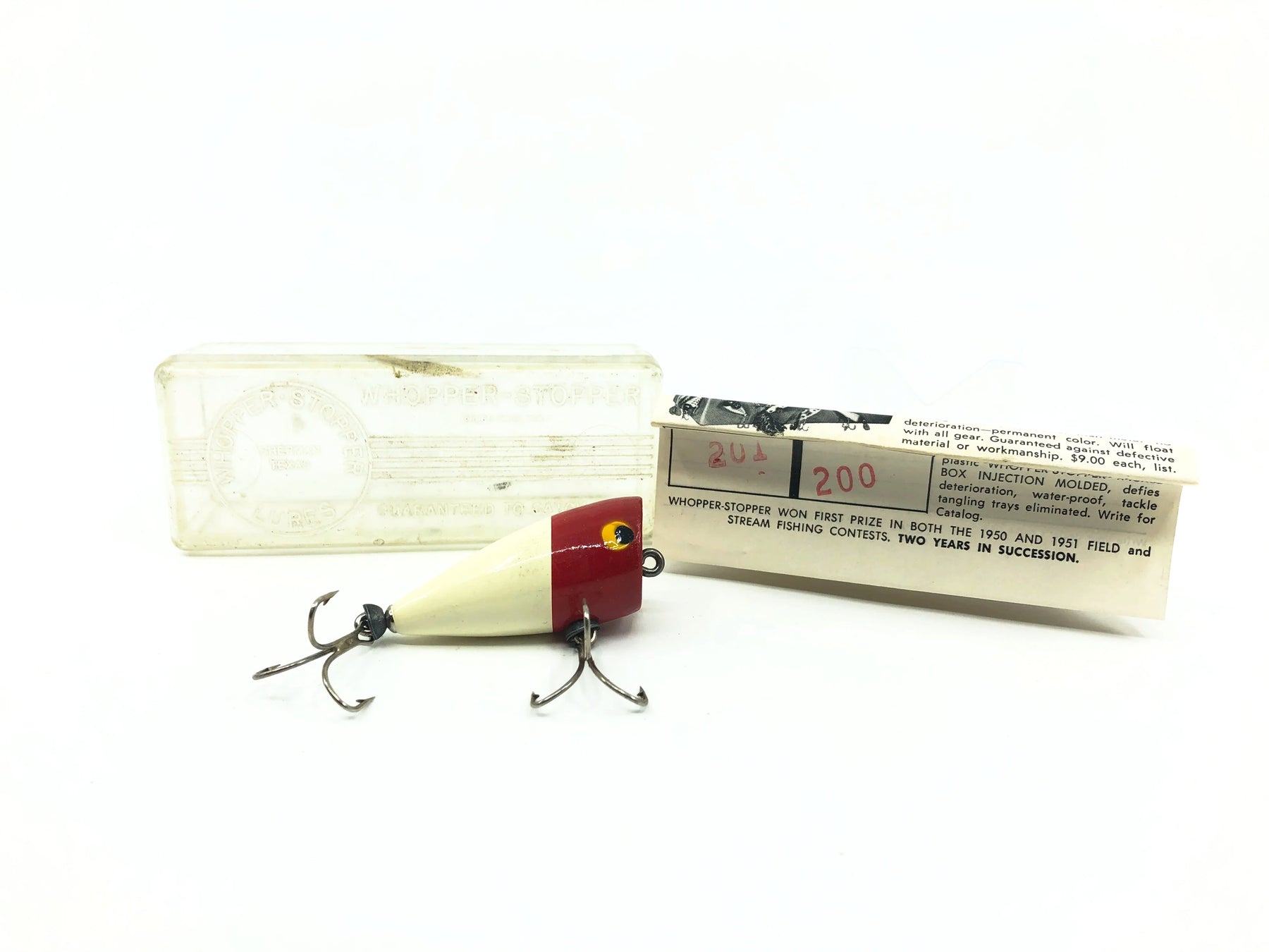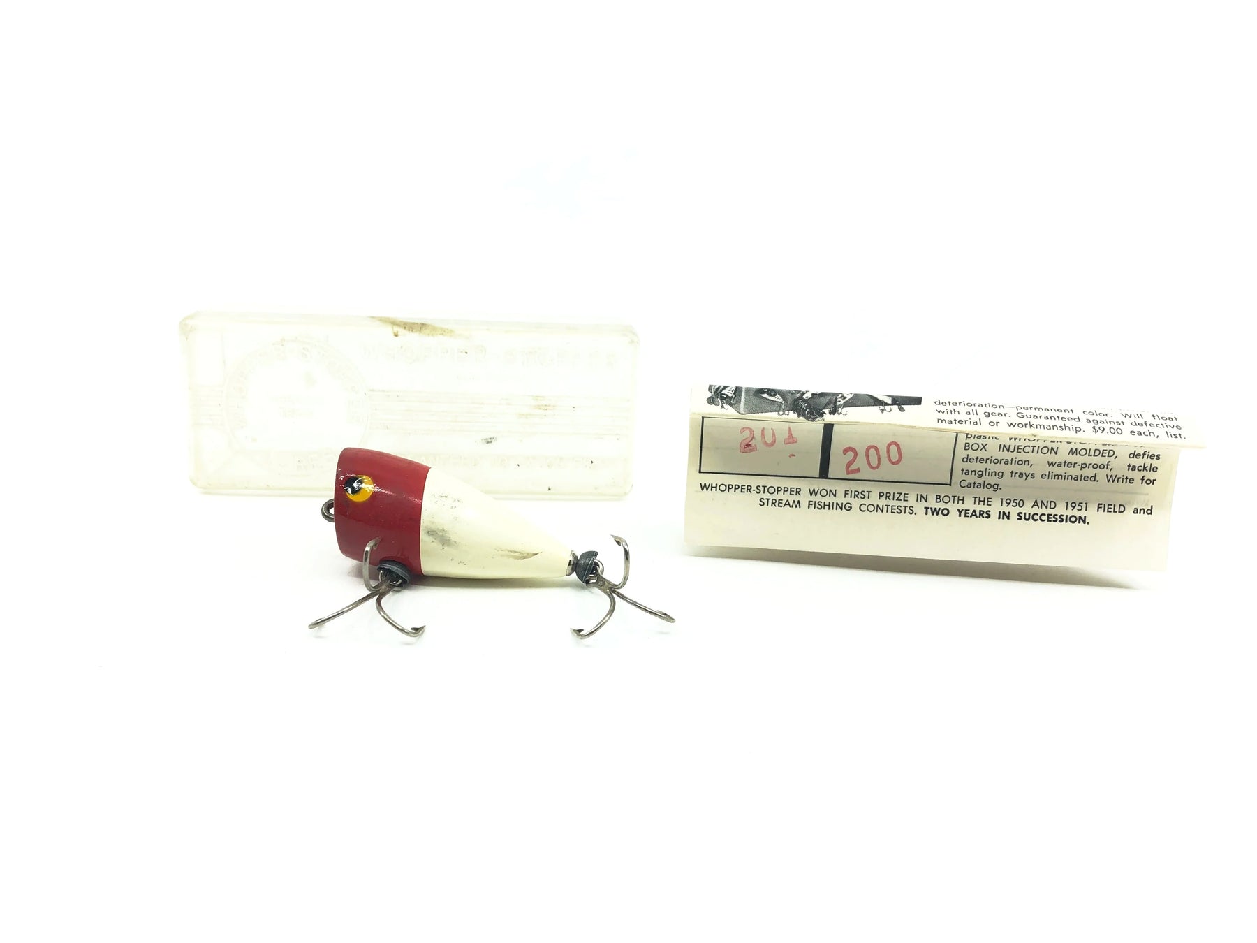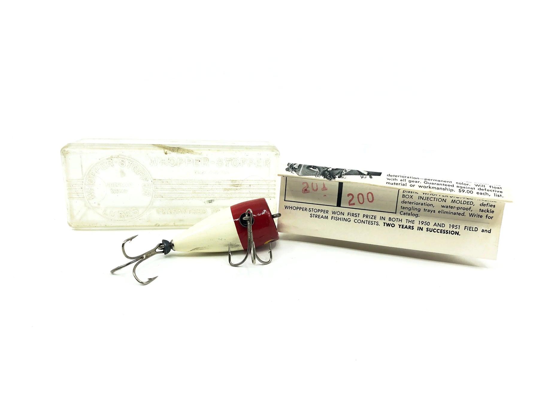 Whopper Stopper Series 200, 201 Red Head/White with Box. About 2 1/4" long. Used vintage lure with some minor wear but overall in good condition. Box and insert in good condition. These lures are collectible and highly sought after by fisherman. Killer on bass! Fish or collect this vintage classic bait. See photos.