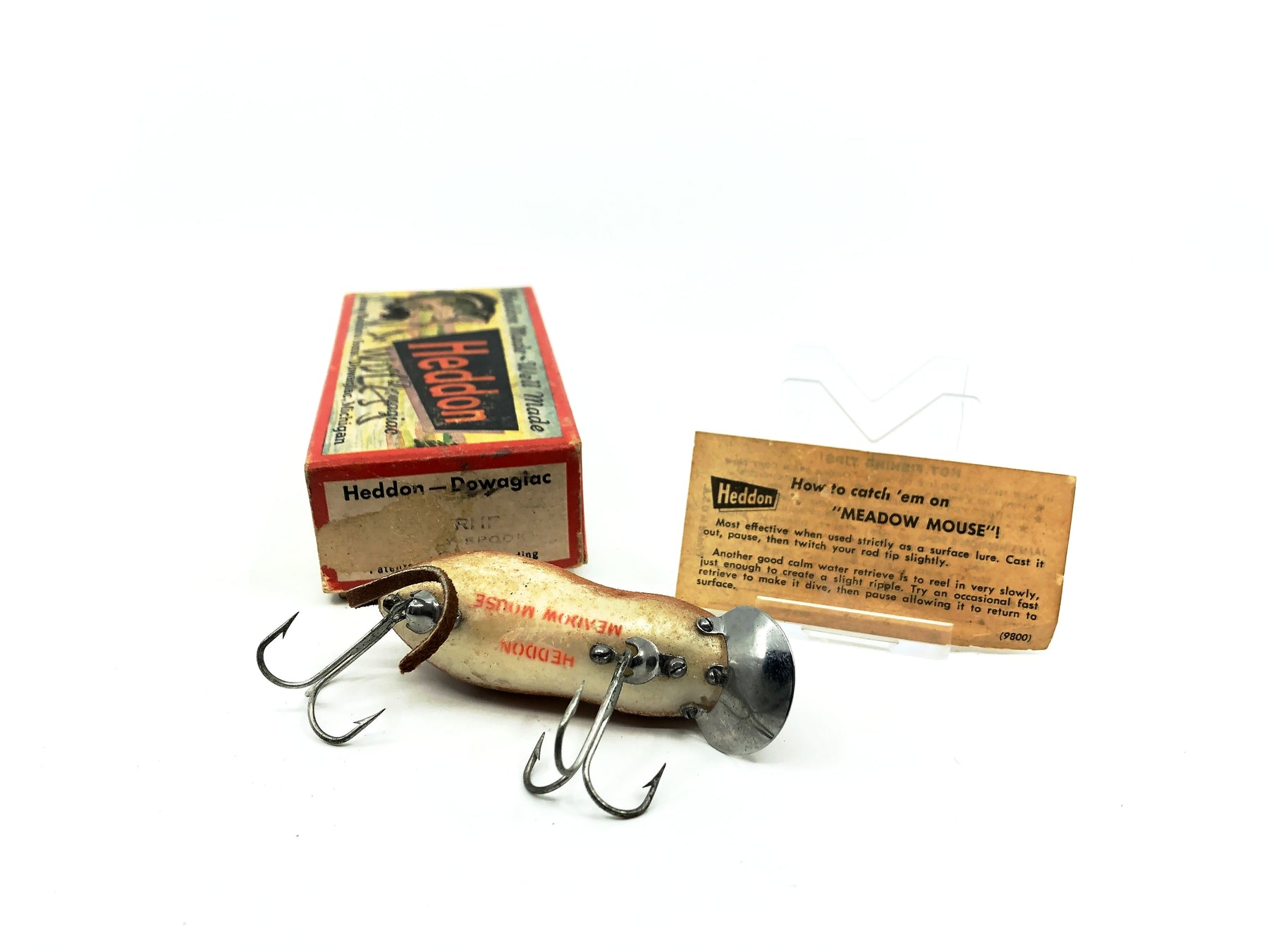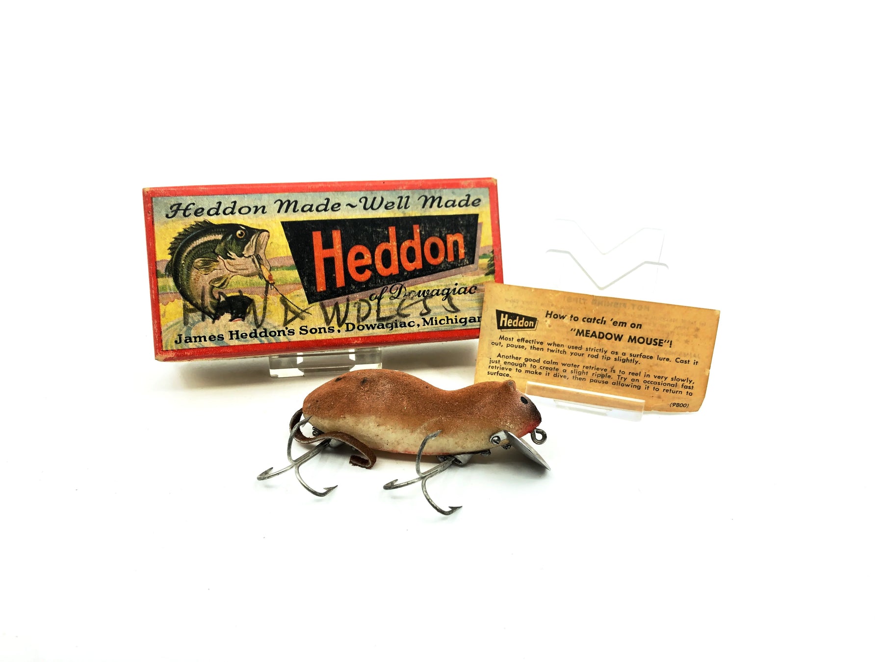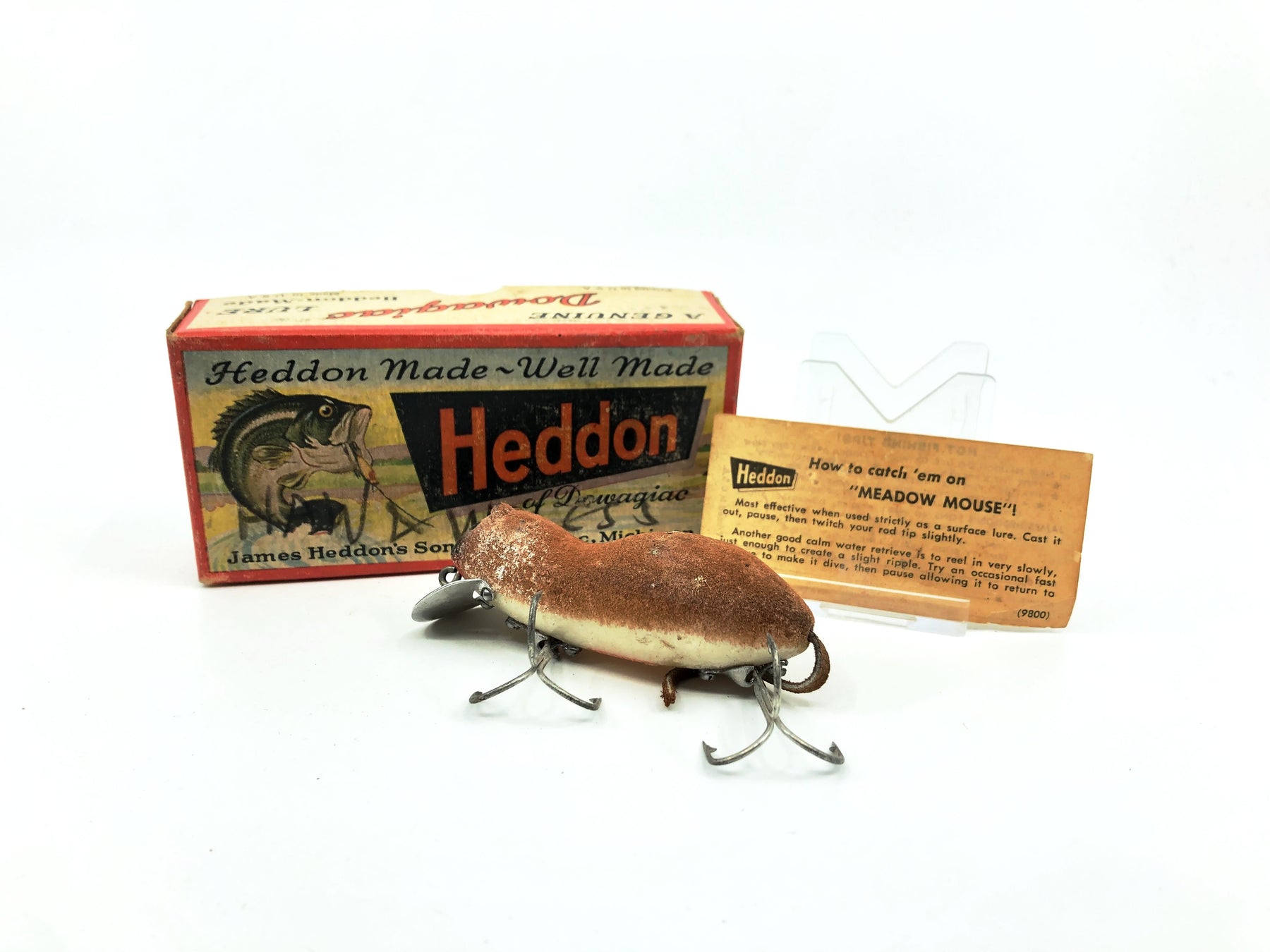 Vintage Heddon Meadow Mouse with Box 9800, BM Brown Mouse Color. Lure body about 2 3/4" long not including the lip or tail. Used vintage lure with some wear as shown but still overall in good condition. Box I believe is incorrect for lure and has some wear and marks/writing but in good overall condition, see photos. Fish or collect you can't go wrong with a vintage Heddon bait.