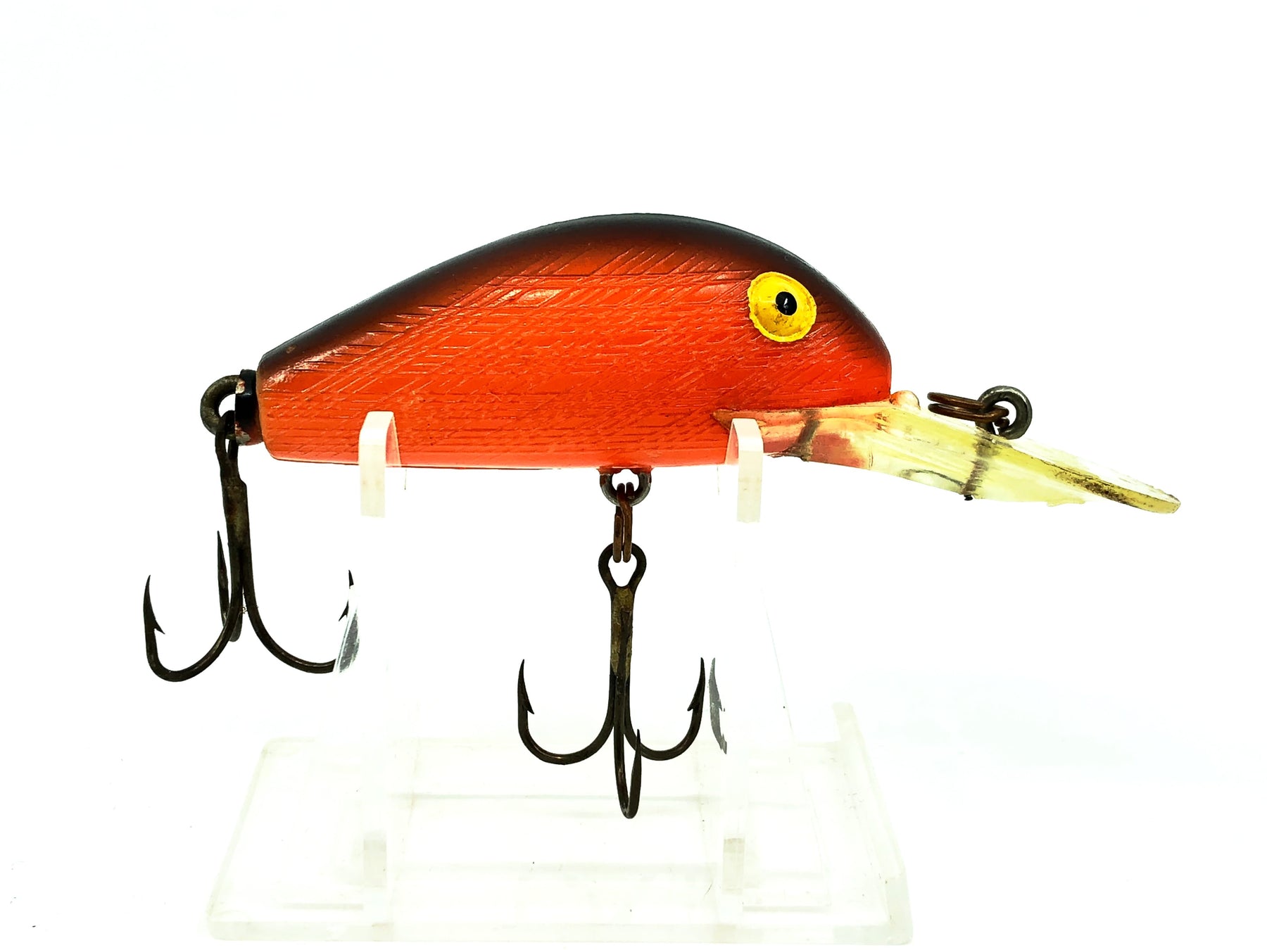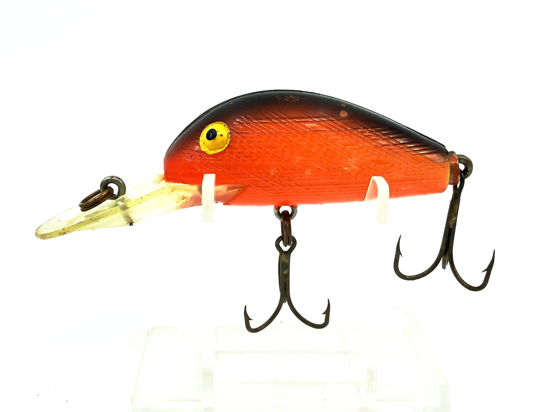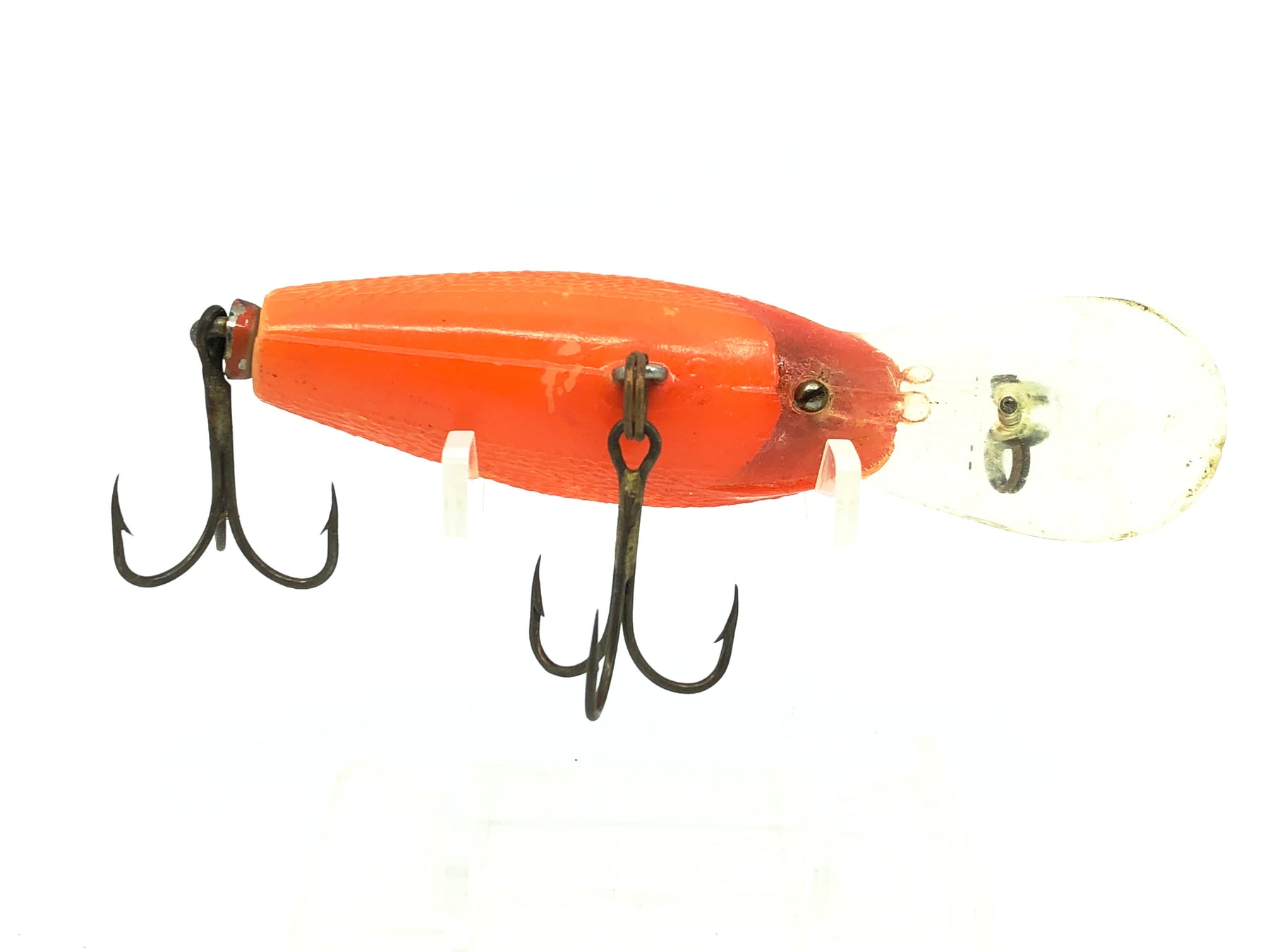 Rebel Super R, BOB Orange/Black Back Color. With a body length of 2 1/2" long this deep-diving Rebel is a rare find. Lure is used with some wear and marks. This would be perfect for your collection or tackle box. See photos.