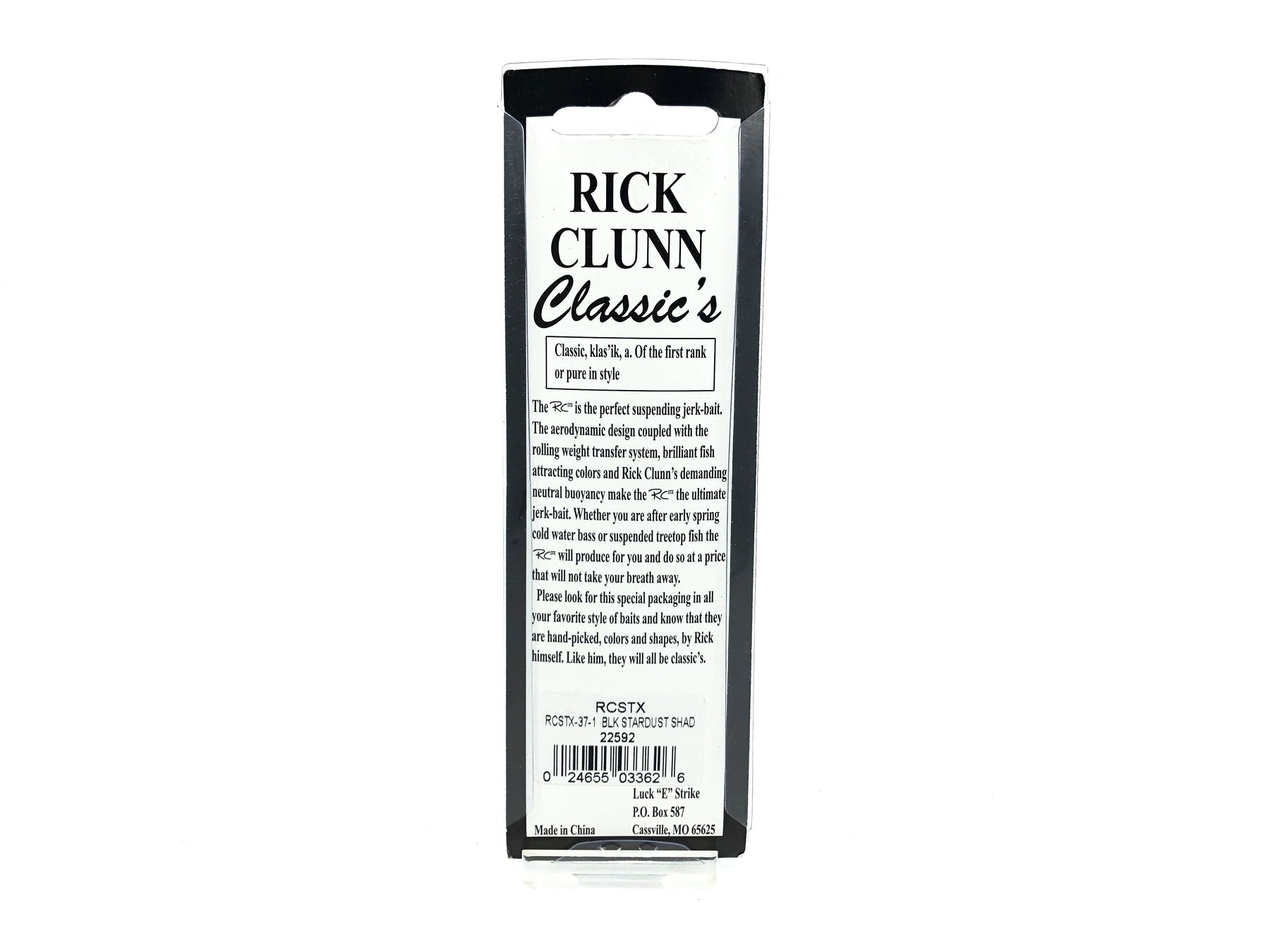 Rick Clunn Luck-E-Strike RC STX, Black Stardust Shad Color on Card. About 4 1/2" long including the lip. This lure is new on card and the card is in good condition. Quality lure from fishing legend Rick Clunn. Great lure to fish or collect. See photos.