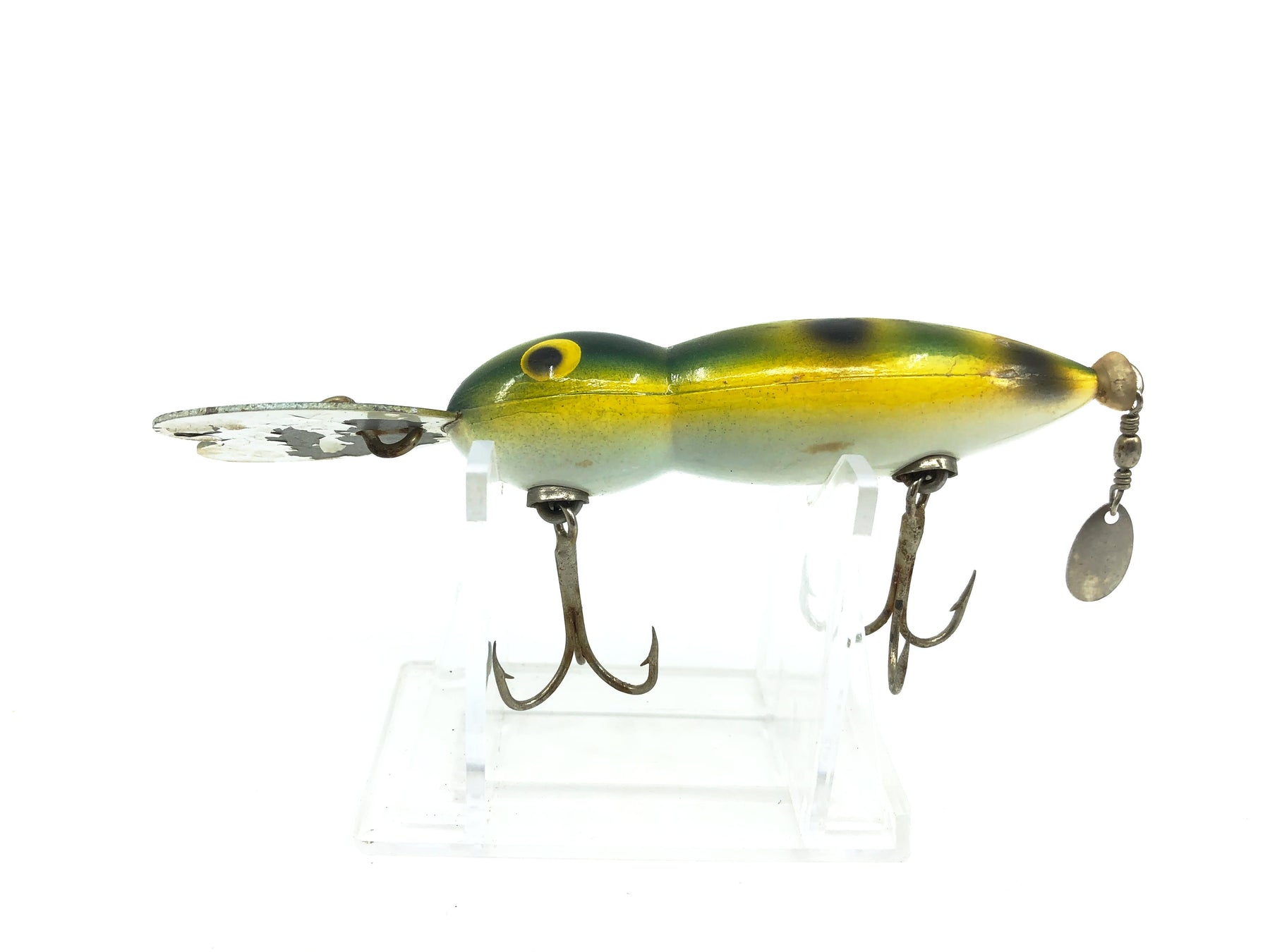 Whopper Stopper Hellbender, Frog Color. About 4 1/4" long including the lip. Used vintage lure with some wear and marks but overall good condition. These lures are collectible and highly sought after by fisherman. Killer on bass! Fish or collect this vintage classic bait. See photos.