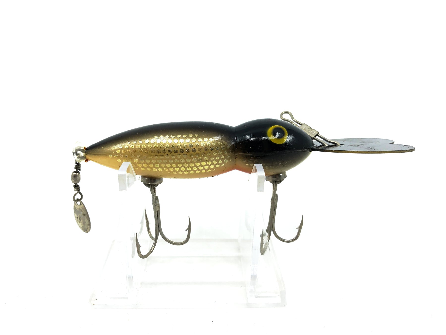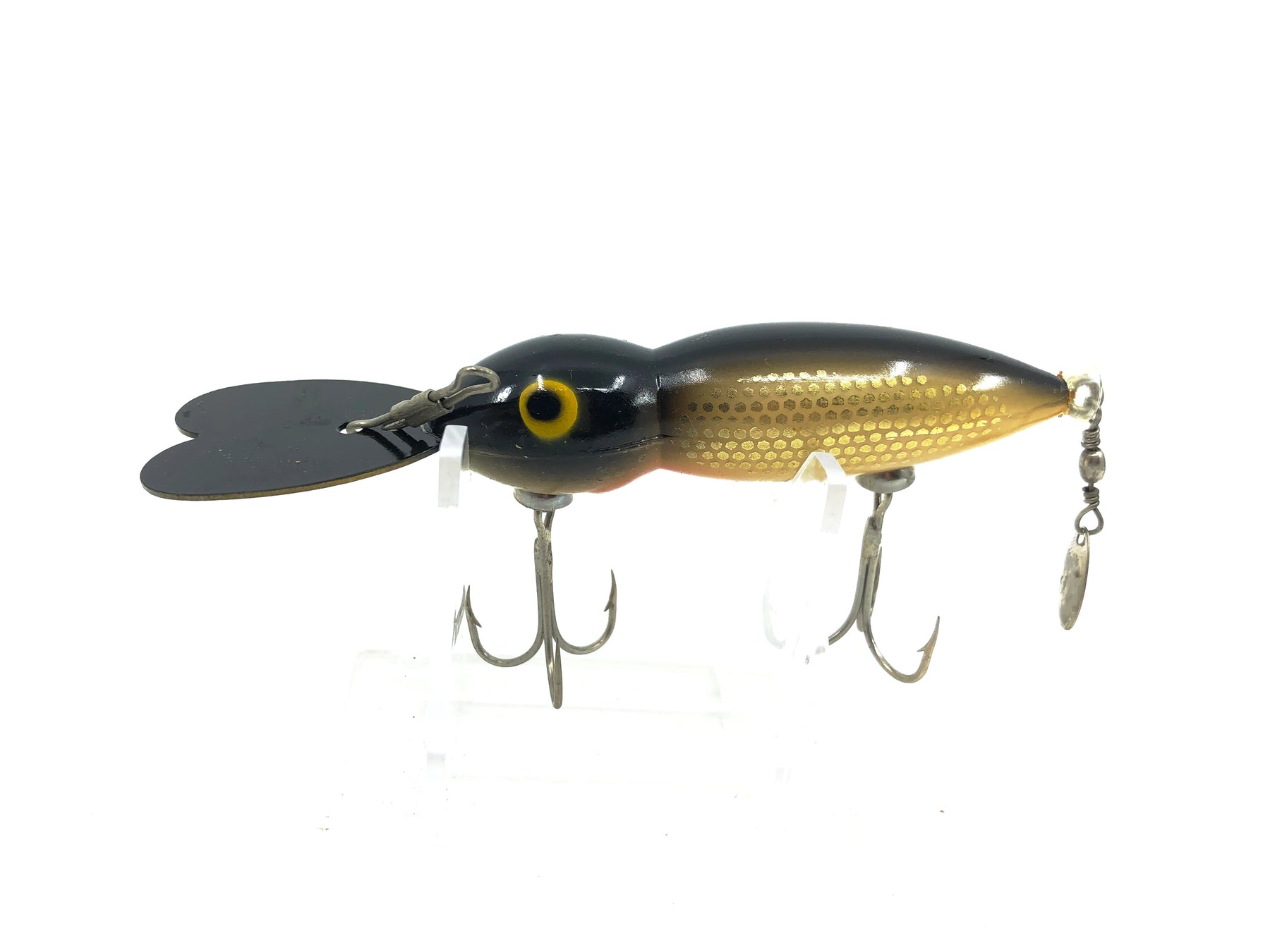 Whopper Stopper Hellbender, Black/Silver Metascale Color. About 4 1/4" long including the lip. Used vintage lure with some minor wear but overall good condition. These lures are collectible and highly sought after by fisherman. Killer on bass! Fish or collect this vintage classic bait. See photos.