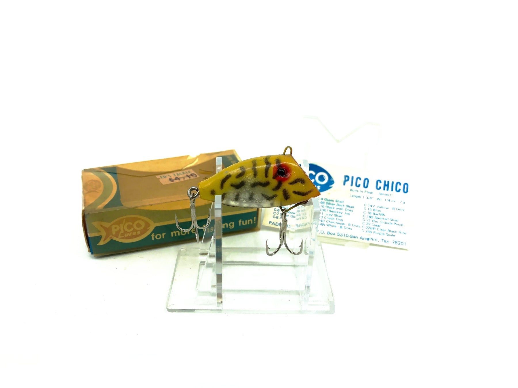 PICO Perch CHICO Series C, Yellow Black Dashes Color, With Box. About 1 3/4" long. In great shape, appears to have never been used, but with some minor wear from age. Box in ok shape with some wear and uv staining. Grab this one while you can. See photos.
