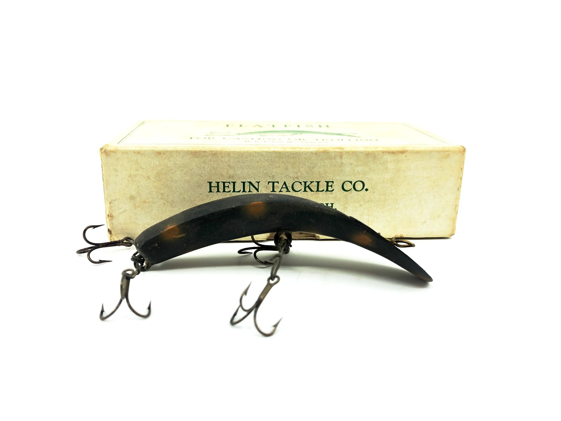 Vintage Helin Flatfish U20, BL Black Color with Box. Great unique Flatfish combo from 1949. Lure is about 3 1/2" long. Lure has some minor wear and waxing from storage. Matching is in very good shape for it's age. See photos.