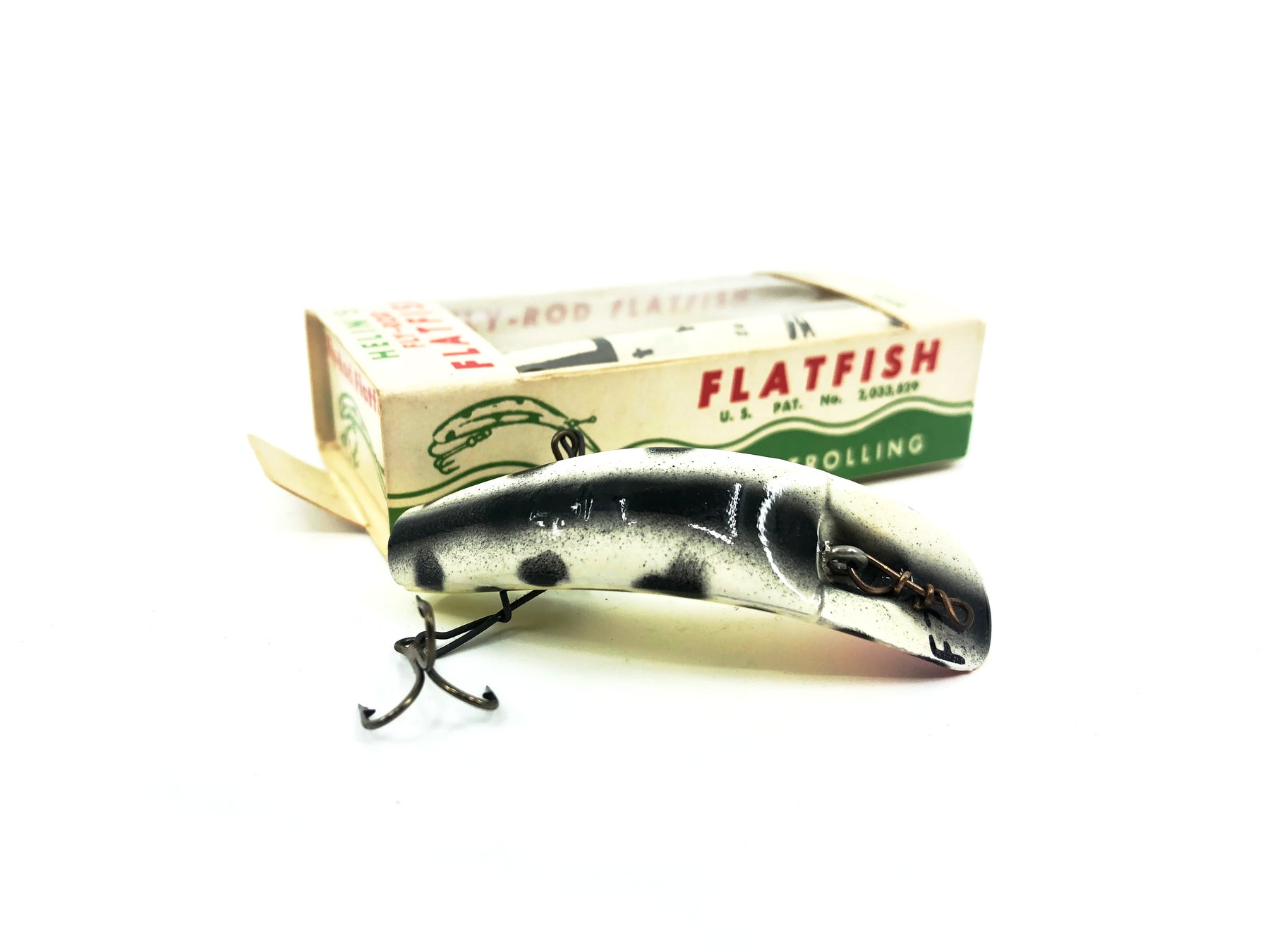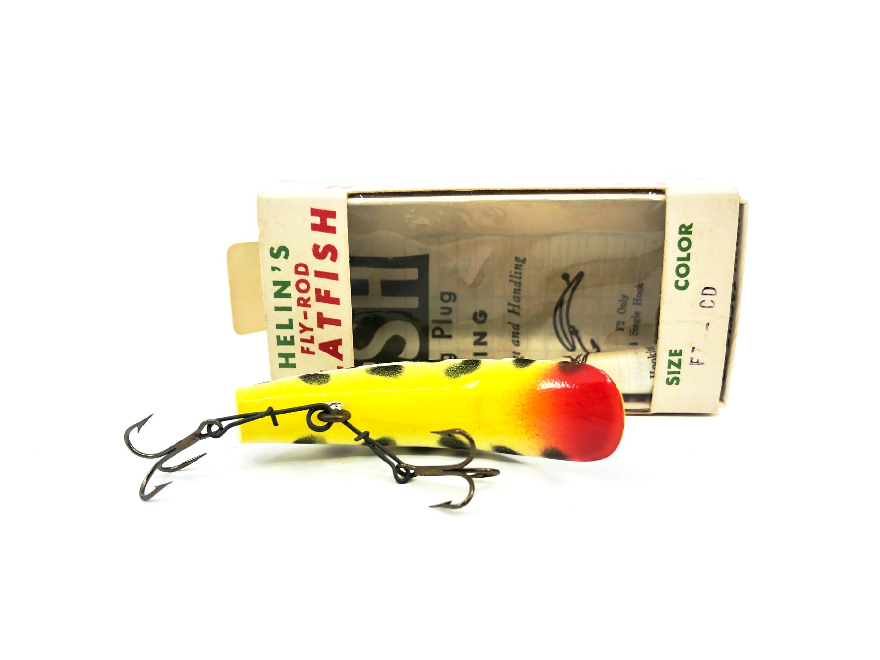 Vintage Helin Flatfish F7, CD Coachdog Color with Box. Lure is about 2 1/4" long. Lure has some minor wear and marks from storage. Matching box has some wear but is in overall good condition. See photos.