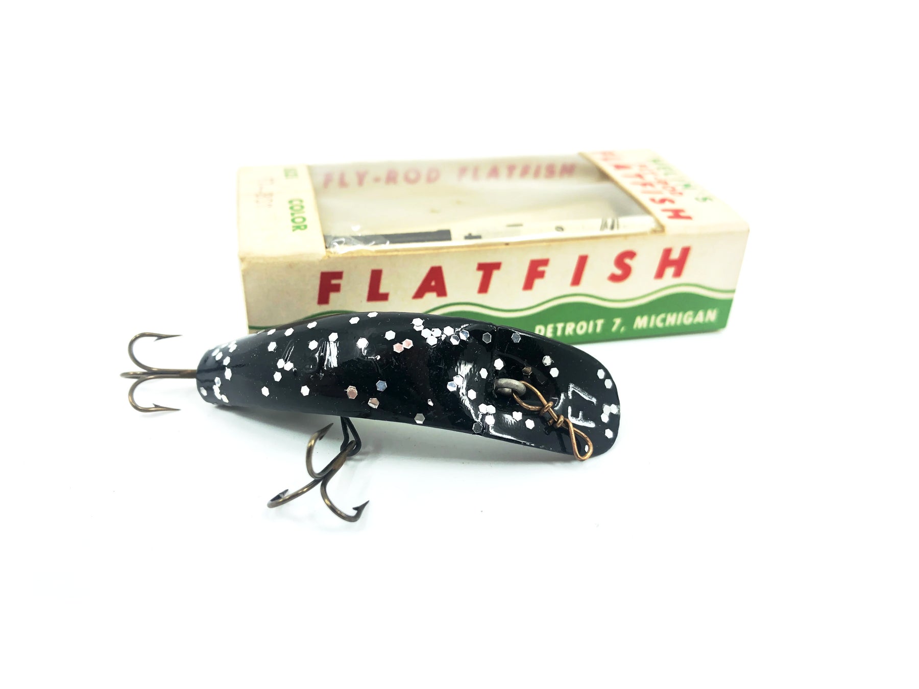 Vintage Helin Flatfish F7, BSS Black Silver Speck Color with Box. Lure is about 2 1/4" long. Lure has some minor wear and marks from storage. Matching box has some wear but is in overall good condition. See photos.
