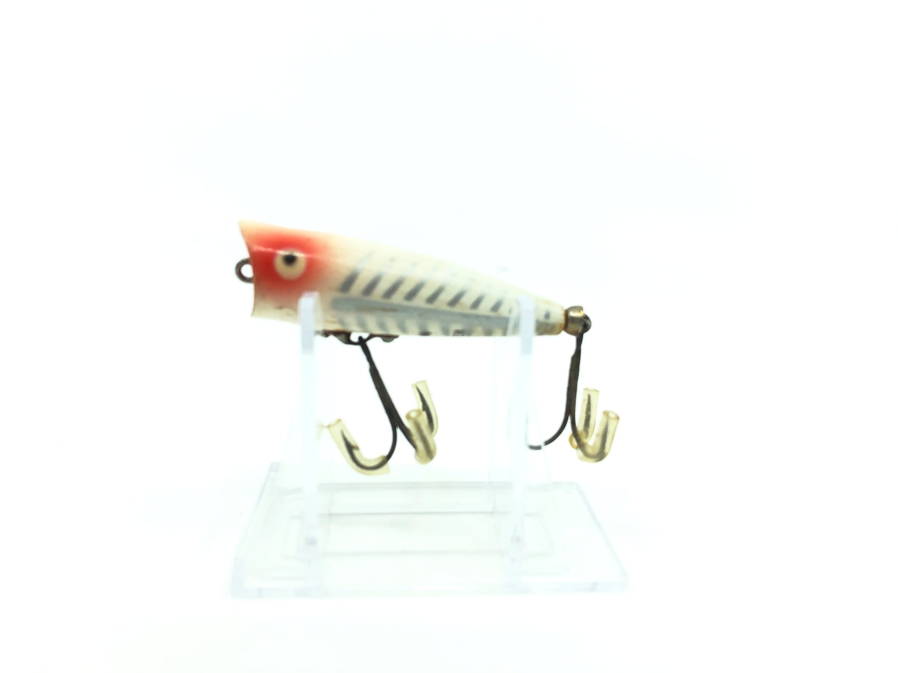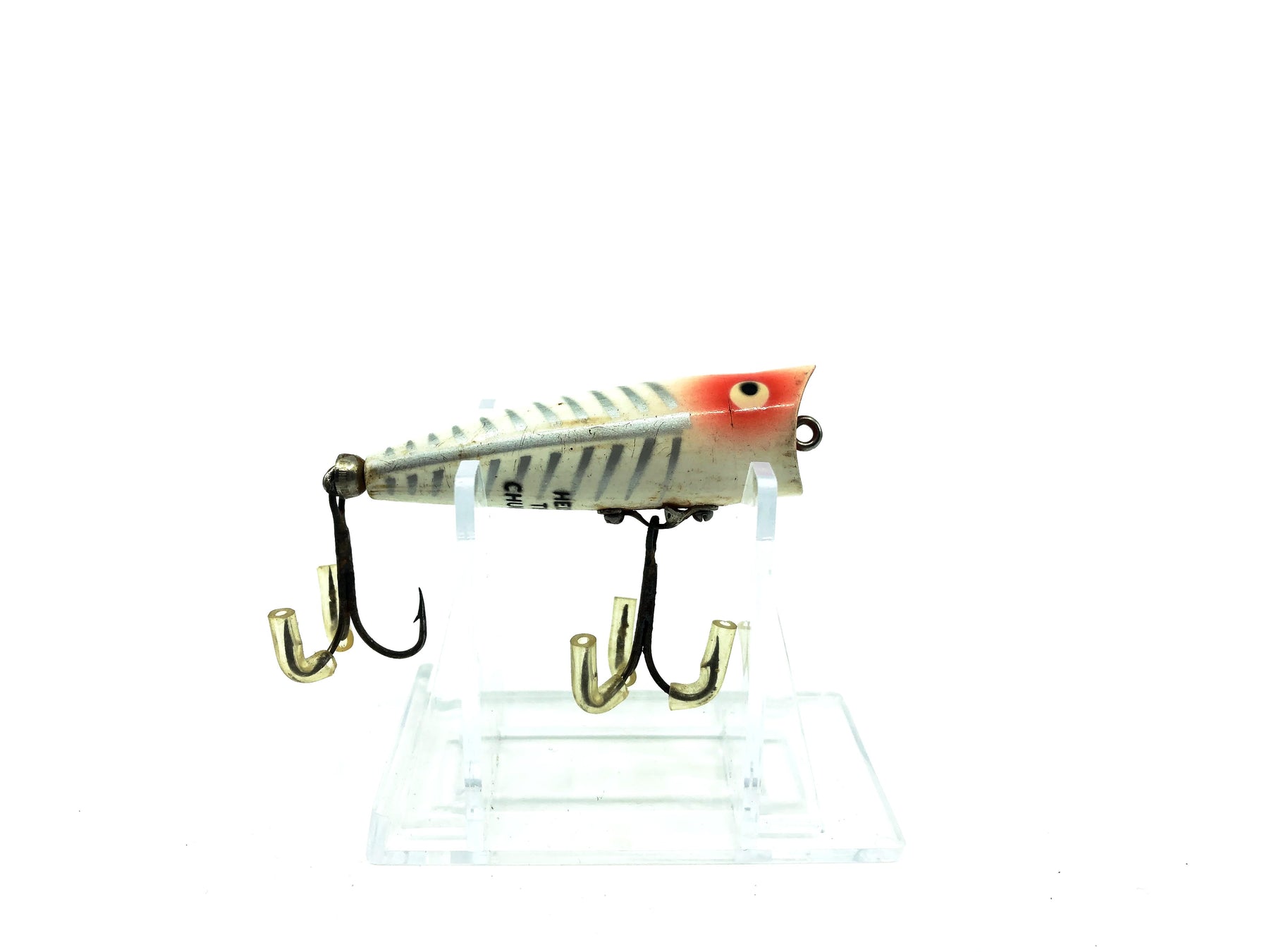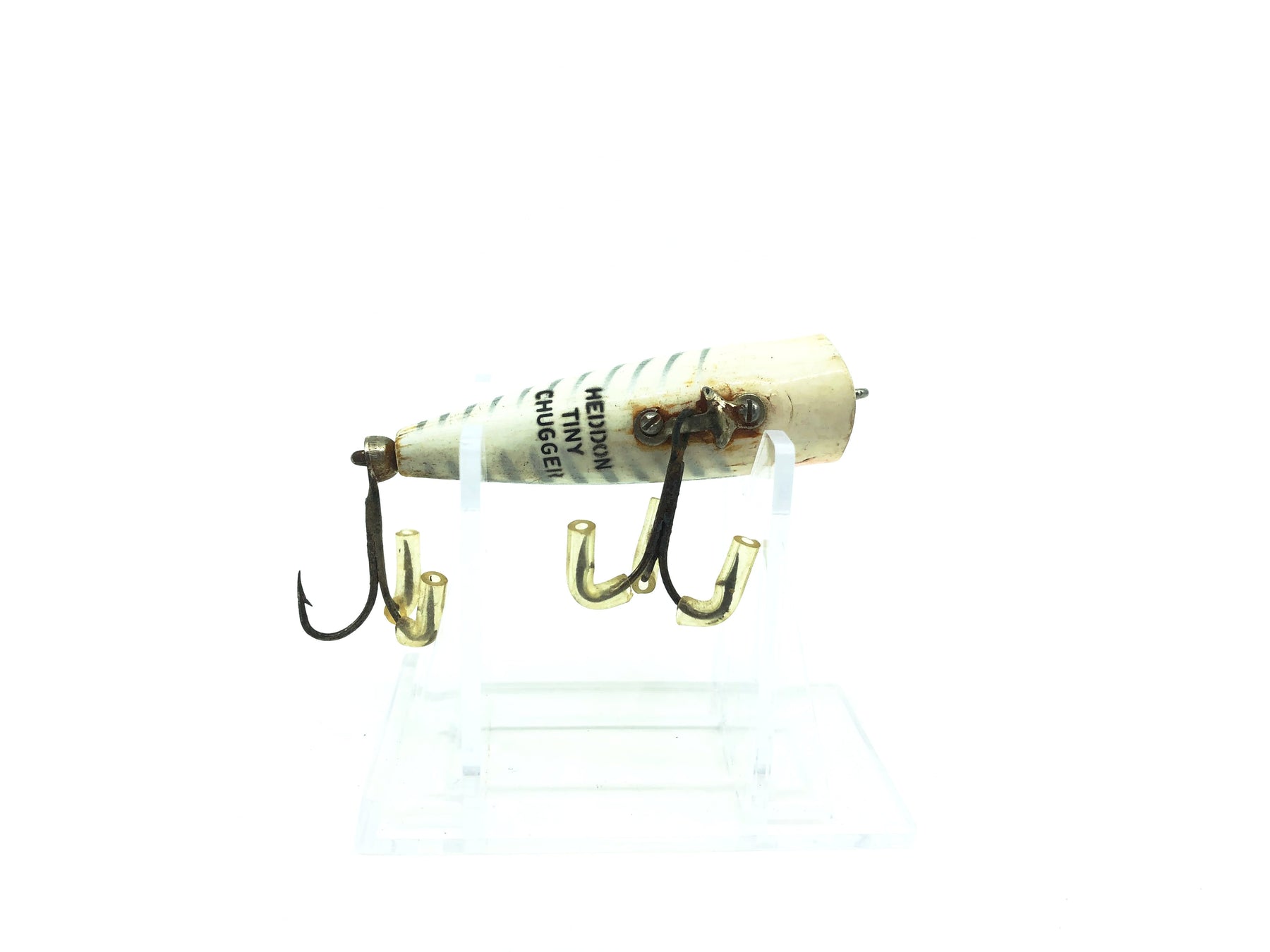 Heddon Tiny Chugger XRW White Shore Minnow Color. About 2 3/8" long. Used with some minor wear and rust on the bottom but still overall good condition. Fish or collect a classic Heddon bait.