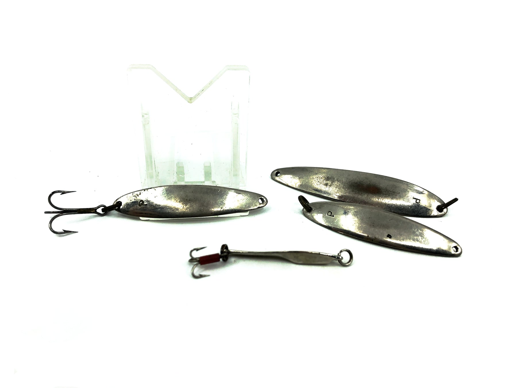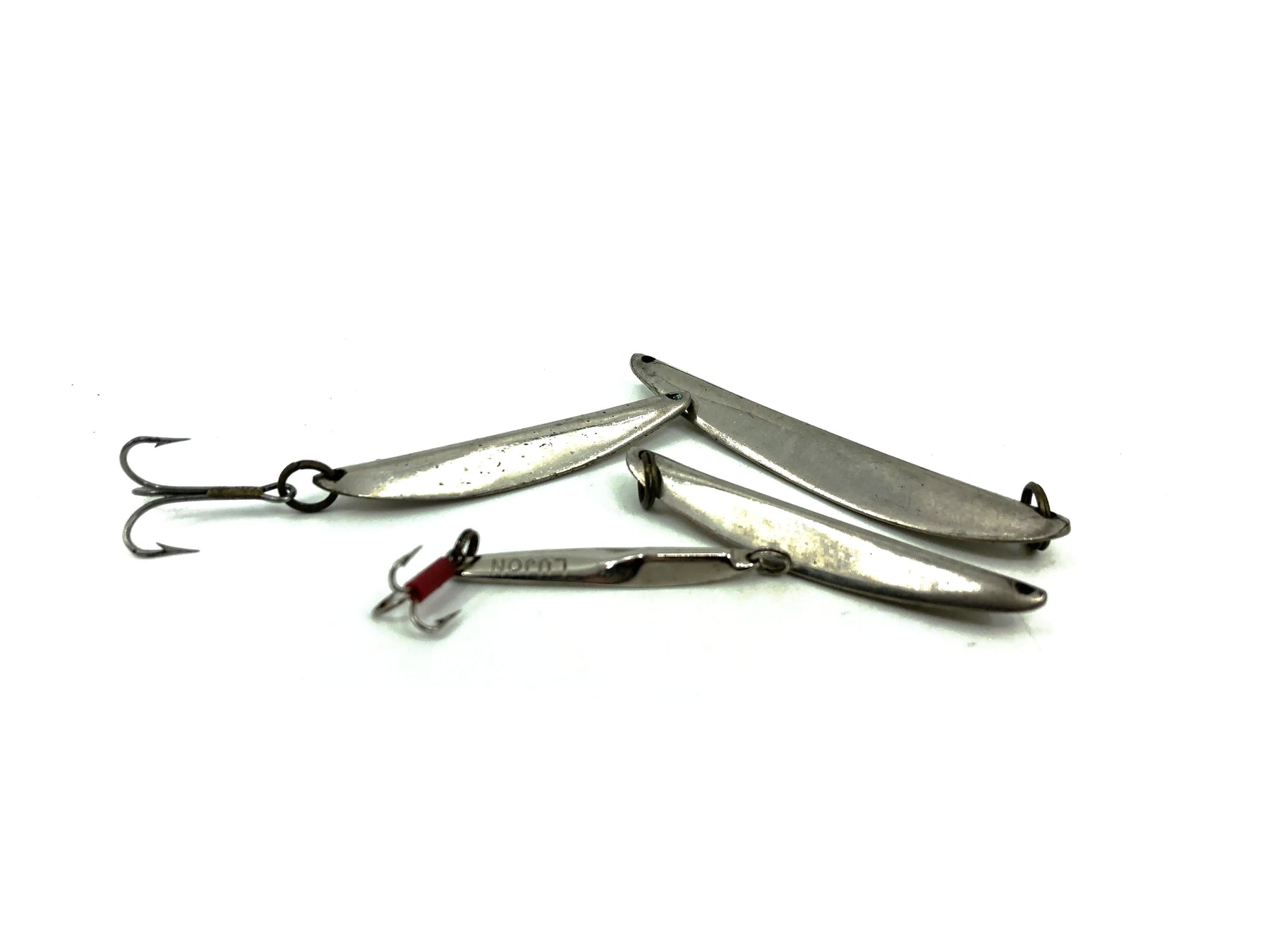 Vintage Metal Baits, Lujon & Unknown. This pack includes one Johnson's Lujon and three unkown metal spoons. All are used and show varying degrees of wear, with two having missing hooks. Ranging from 1 1/2" long to 2 3/4" long.  See photo.  Fish or collect.