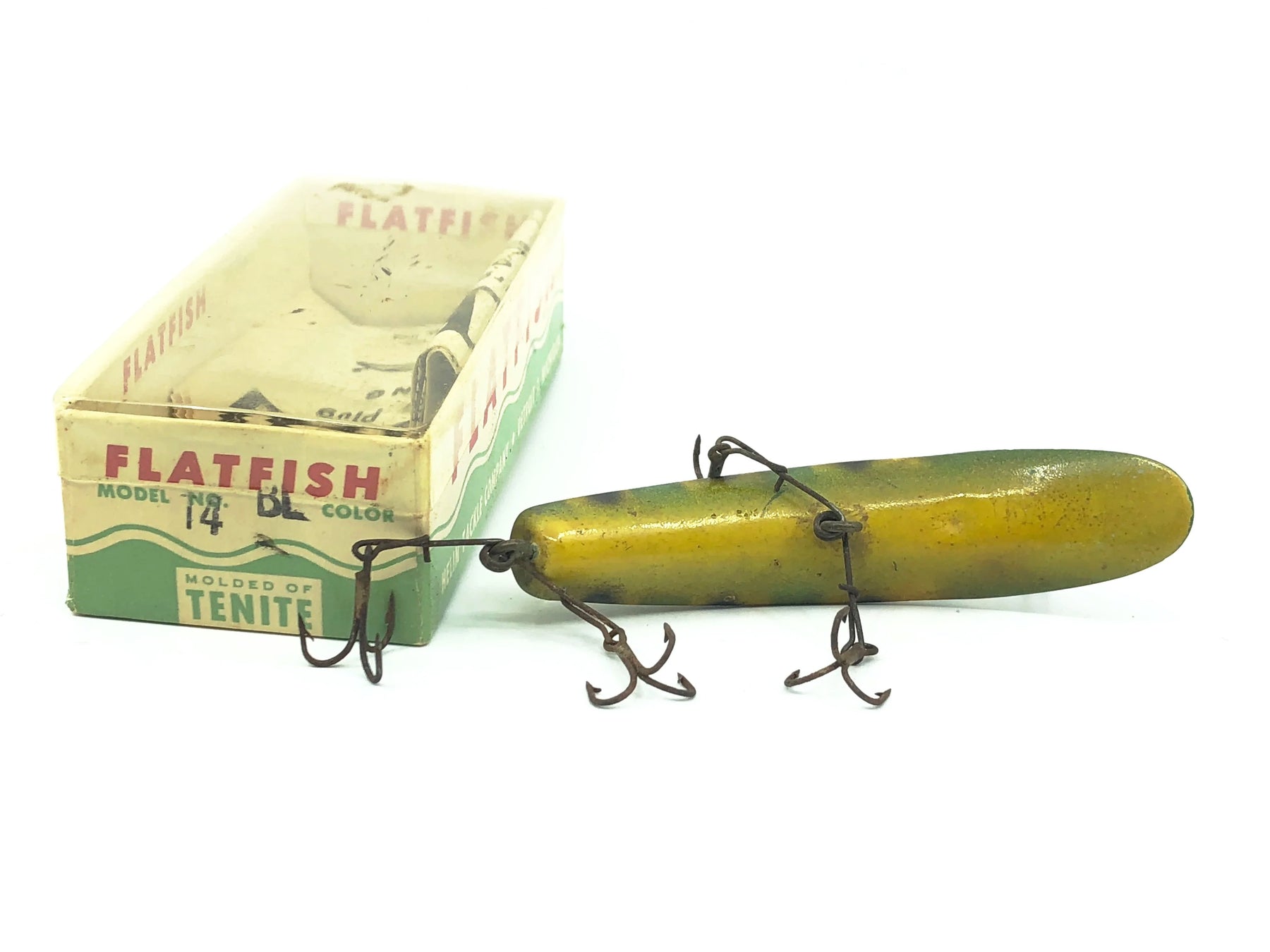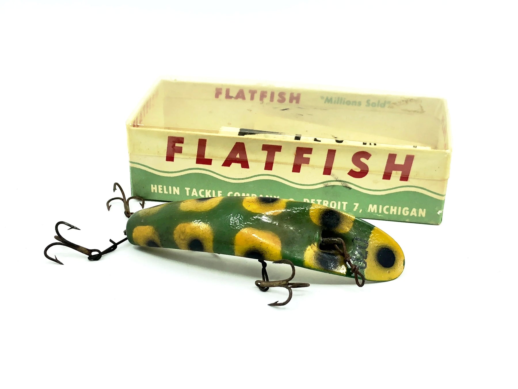 Helin Flatfish U20, Frog Color-with Box. Pre 1963 box however its for a T4 in Black color. About 3 1/2" long. Lure has some minor wear but in overall good condition, see photos. One of the most successful fishing lures ever made. Fish or collect!