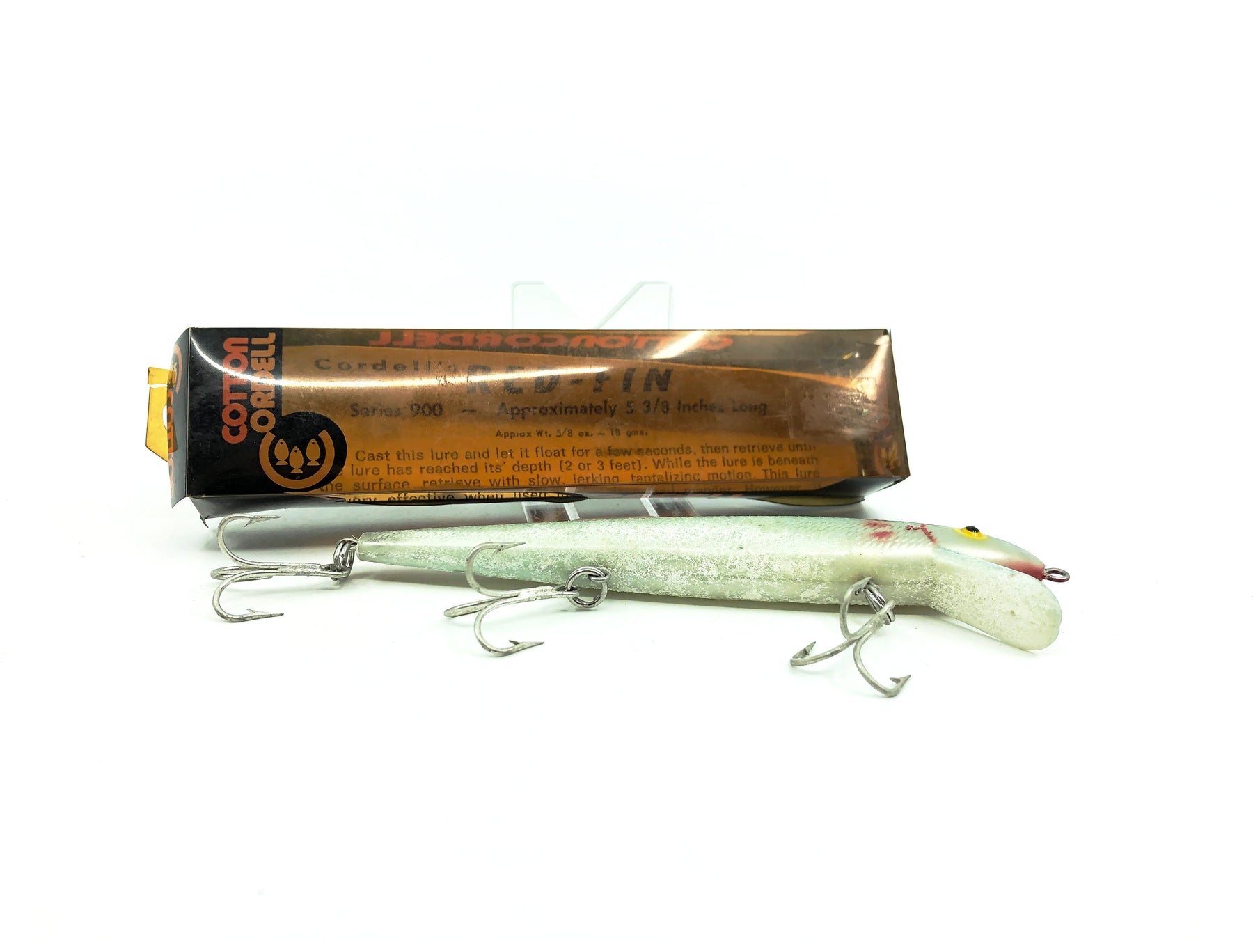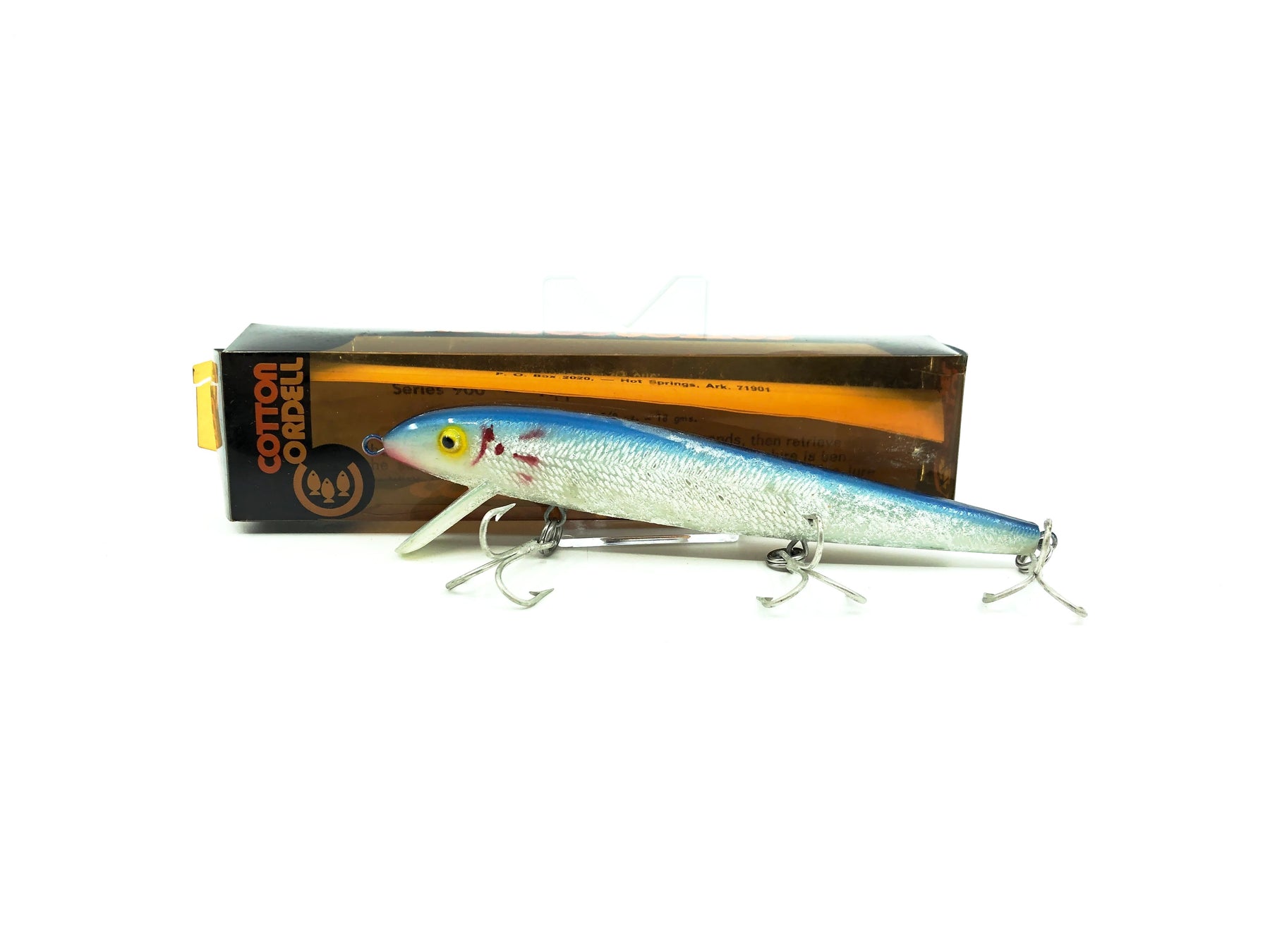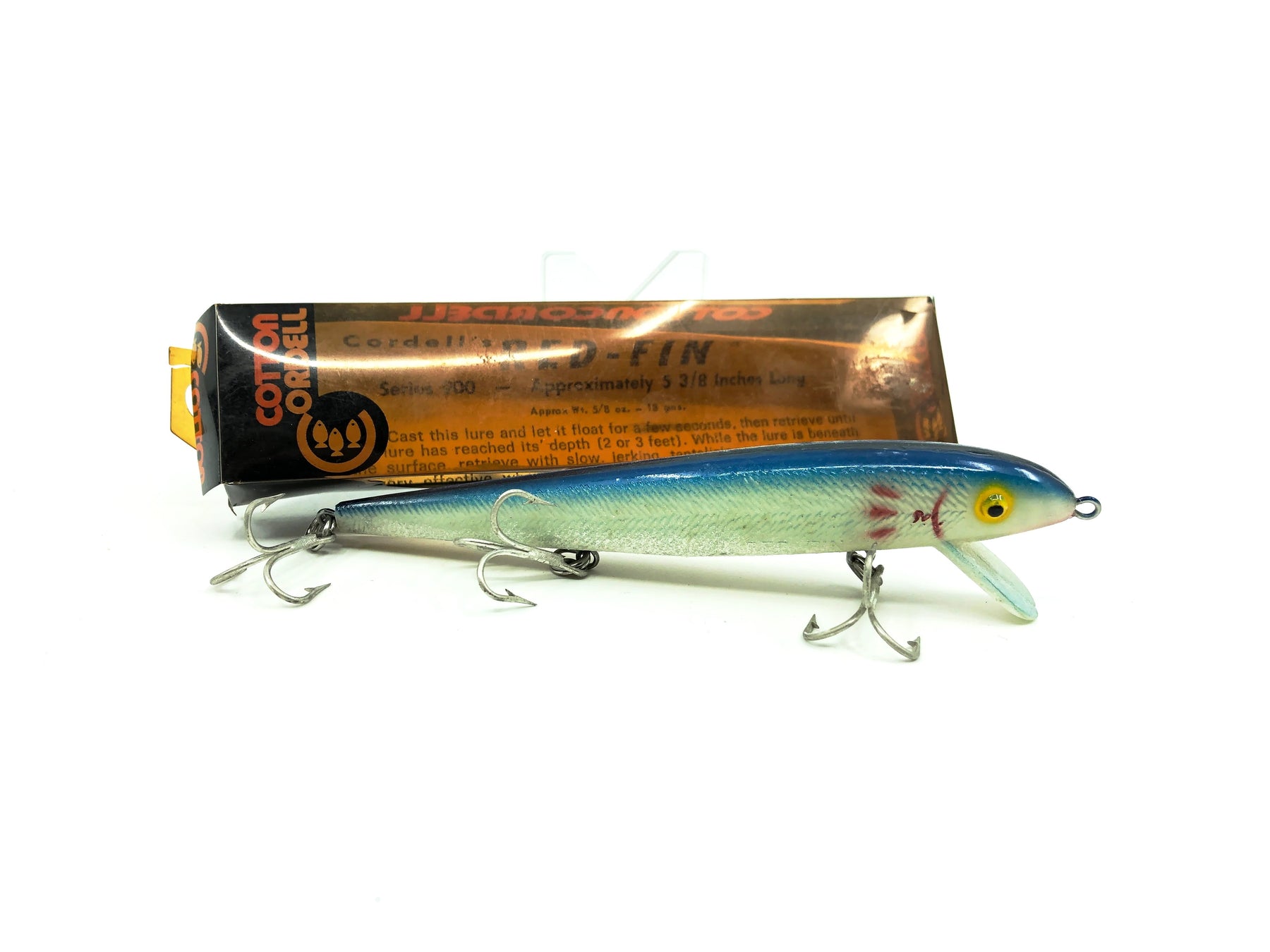 Cordell Deep Diver Red Fin 900, Silver/Blue Back Color with Box. Harder Cordell to find. Lure is about 5 3/8" long. Box has wear, damage and cracking. Lure is in good condition with some waxing, see photos. Fish or collect a great bait.