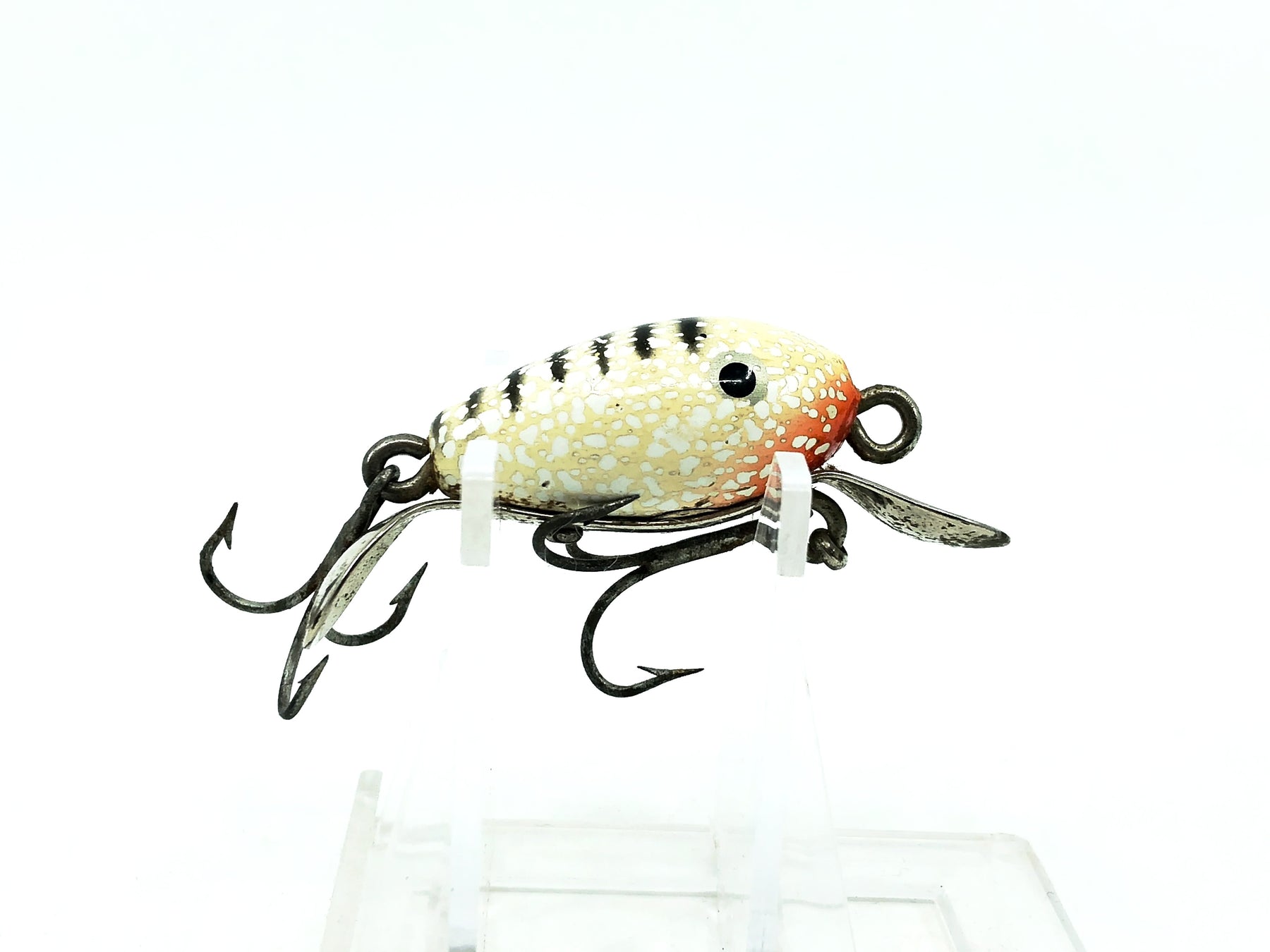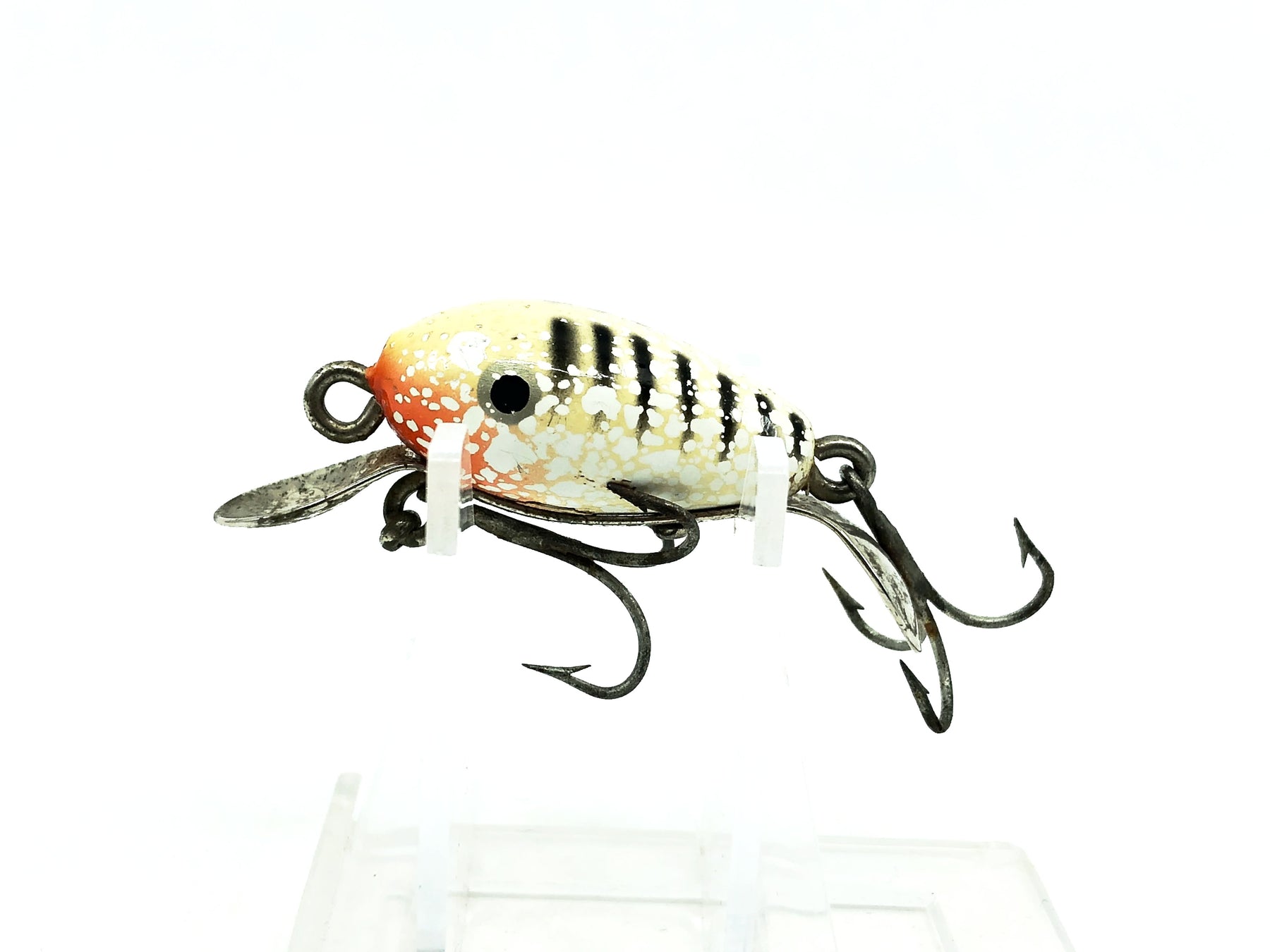 Shakespeare Dopey, White/Black Stripes Color. Harder to find Shakespeare here. About 2 1/4" long. Used lure with a good amount of marks and some wear but overall in ok condition, see photos. Fish or collect.