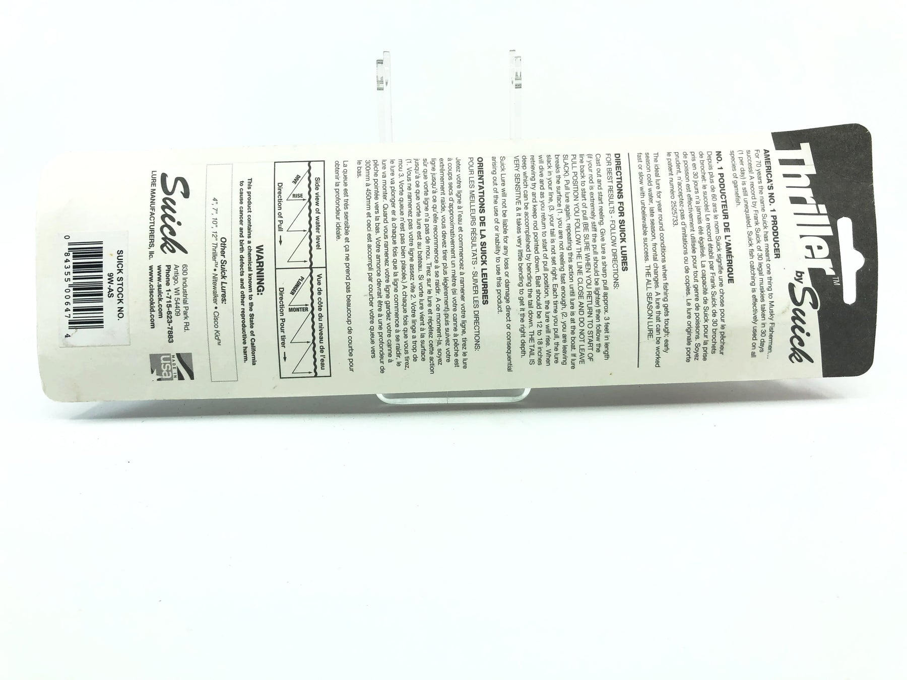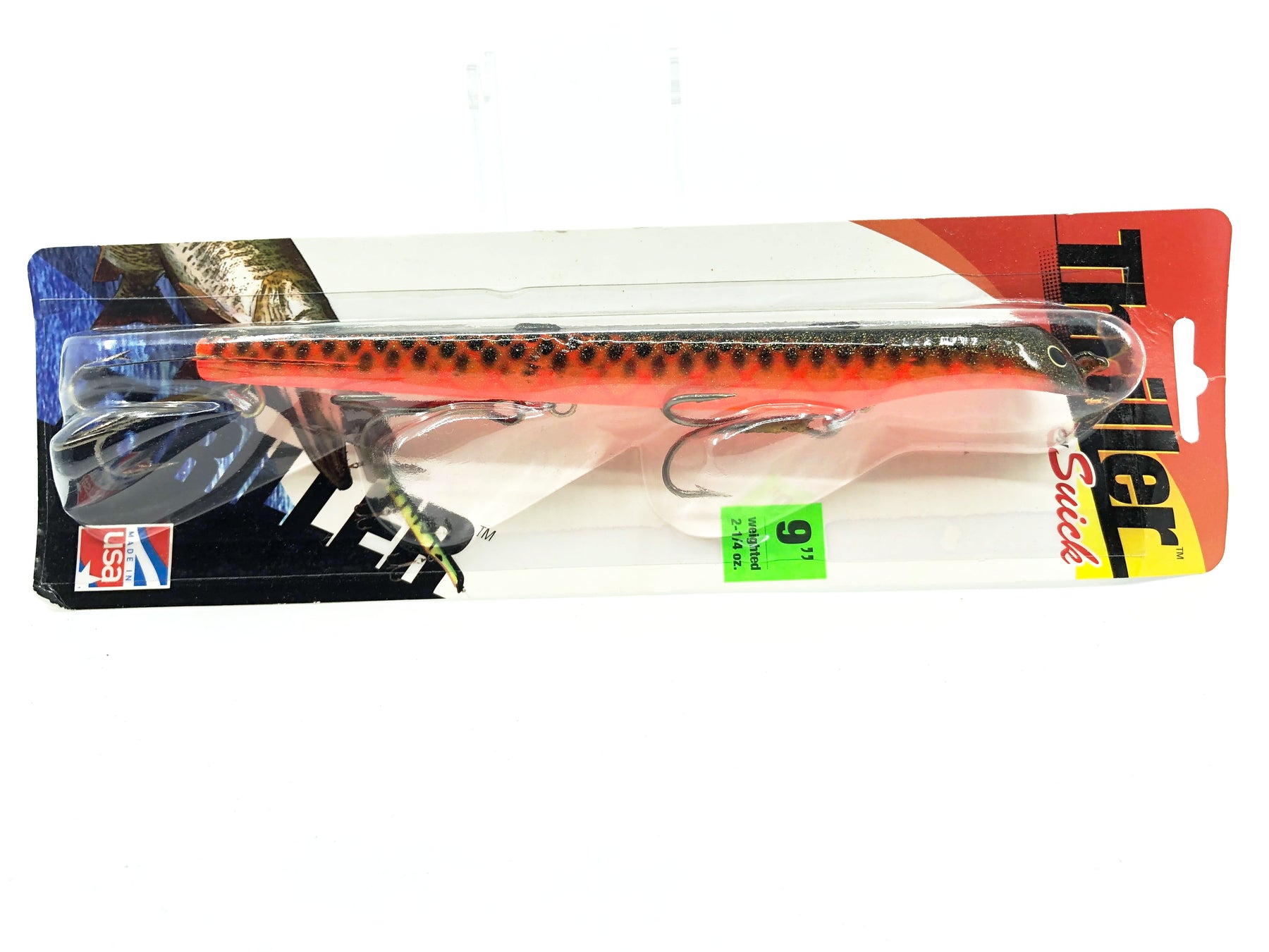 Suick 9" Weighted Thriller Orange Black/Storm Color 9W-AS New on Card Old Stock.  Old stock here that has been in storage.  Dating from somewhere around 2013.  Would make a great addition to a collection or take fishing.  Card has some minor warping and wear to it.  Lure new inside card.  Lure is about 9" long.  Made by Suick.  One of the all time great Musky lures.