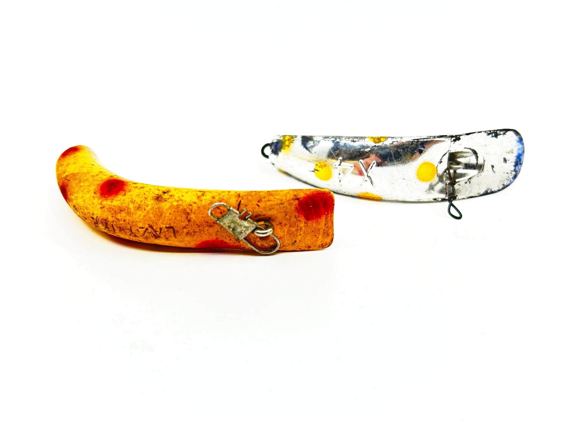 Two Lure Bodies, Flatfish and Lazy Ike. Longest is about 3". Used with wear as shown. An X4 Flatfish and a Lazy Ike 3. Both have quite a bit of wear and are missing hooks. Clean up, add hooks and take fishing. Bargain price.