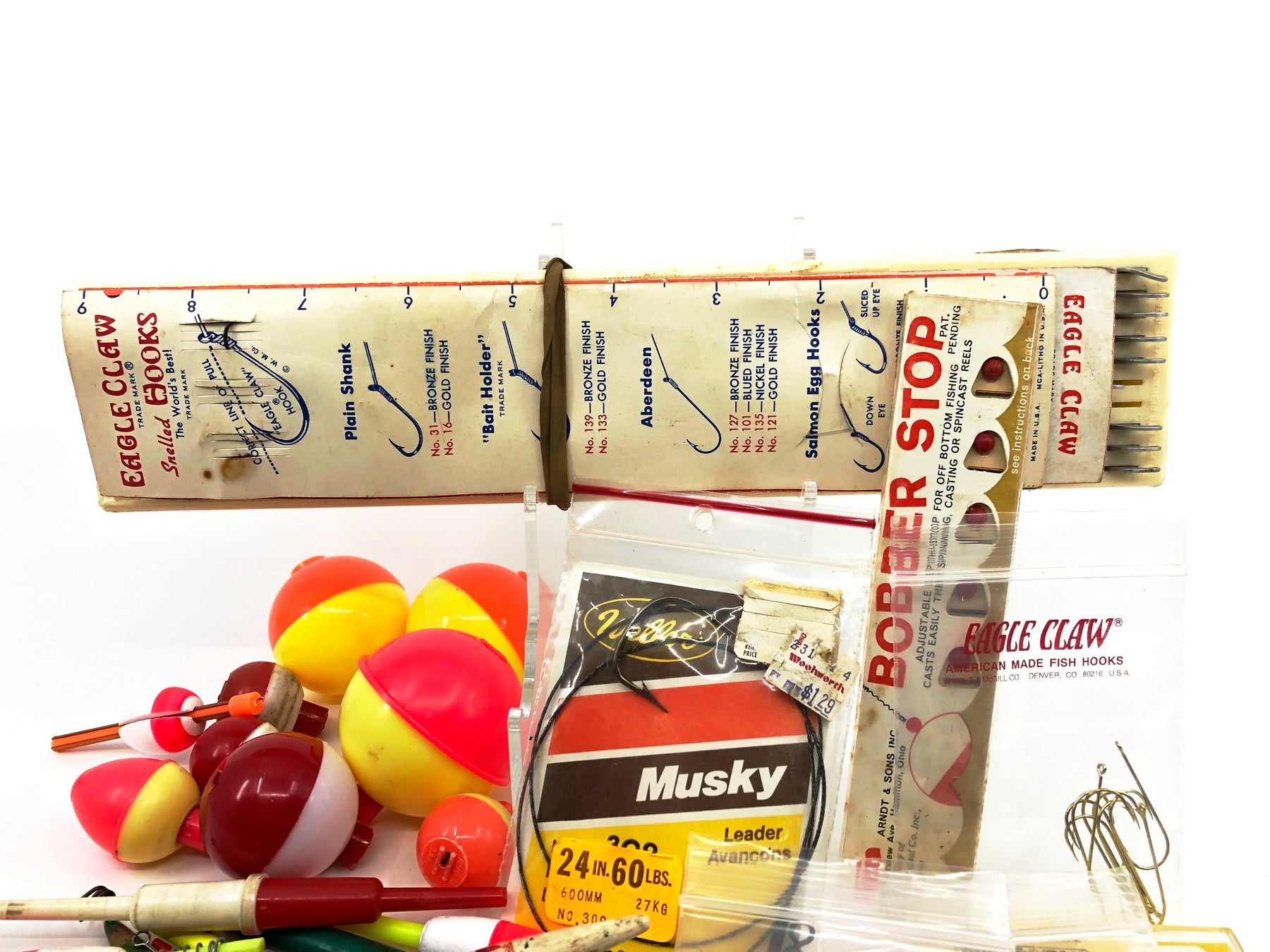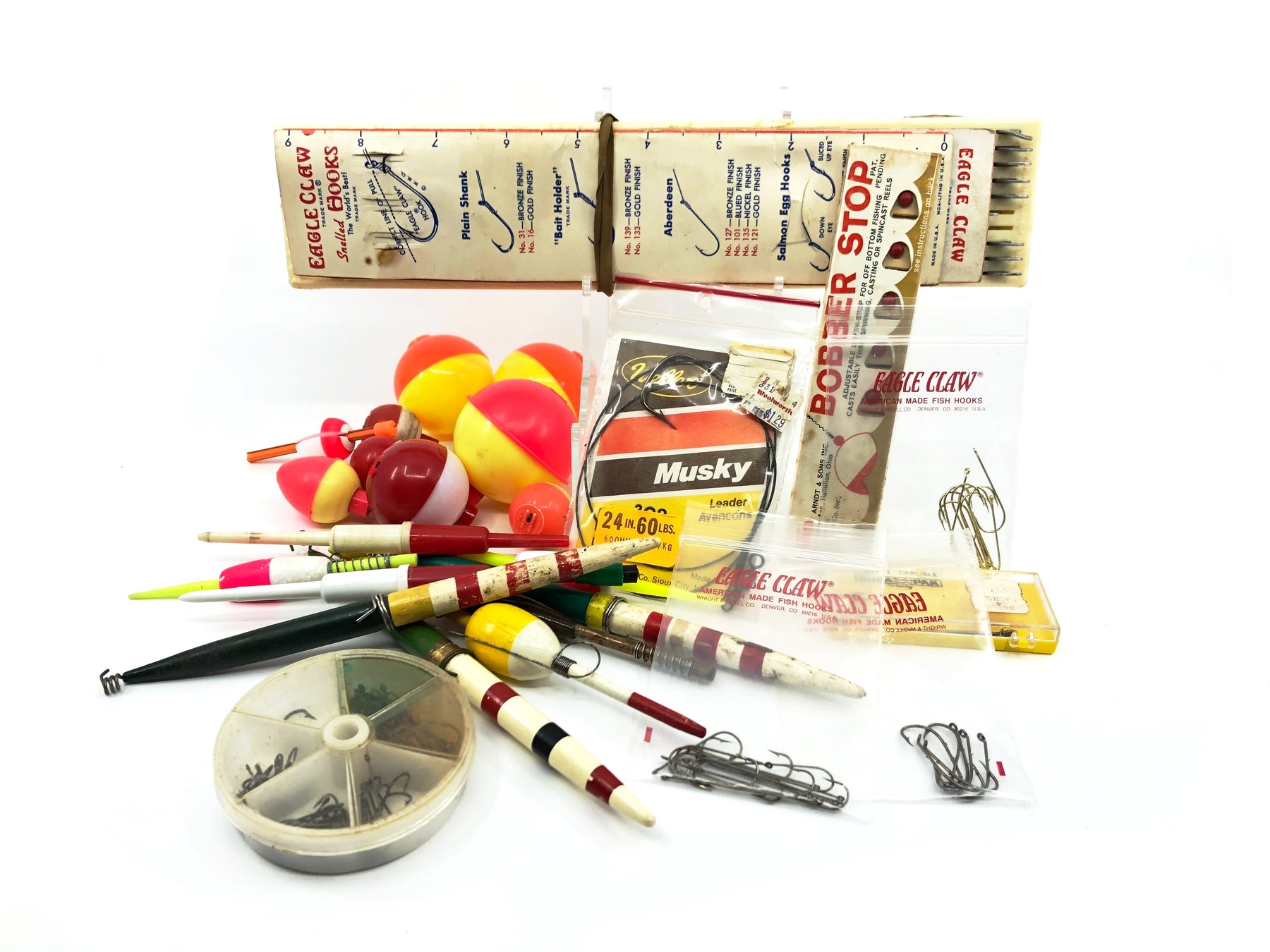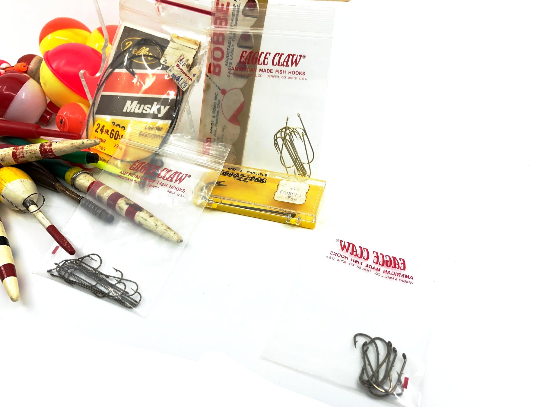 Vintage Bobber/Hook Pack. This pack includes a variety of essential hooks and bobbers for any fishermen's tackle box. All these objects are used or vintage with varying degrees of wear but are still in overall ok condition. Good stuff to fill up your tacklebox at a bargain price.
