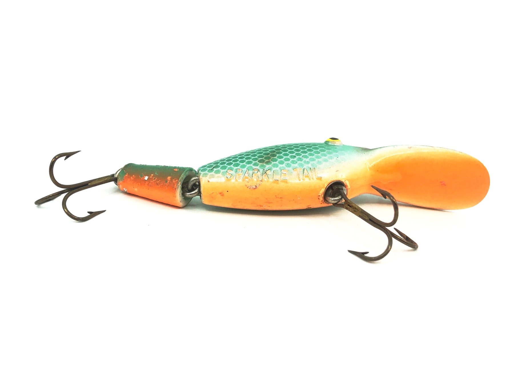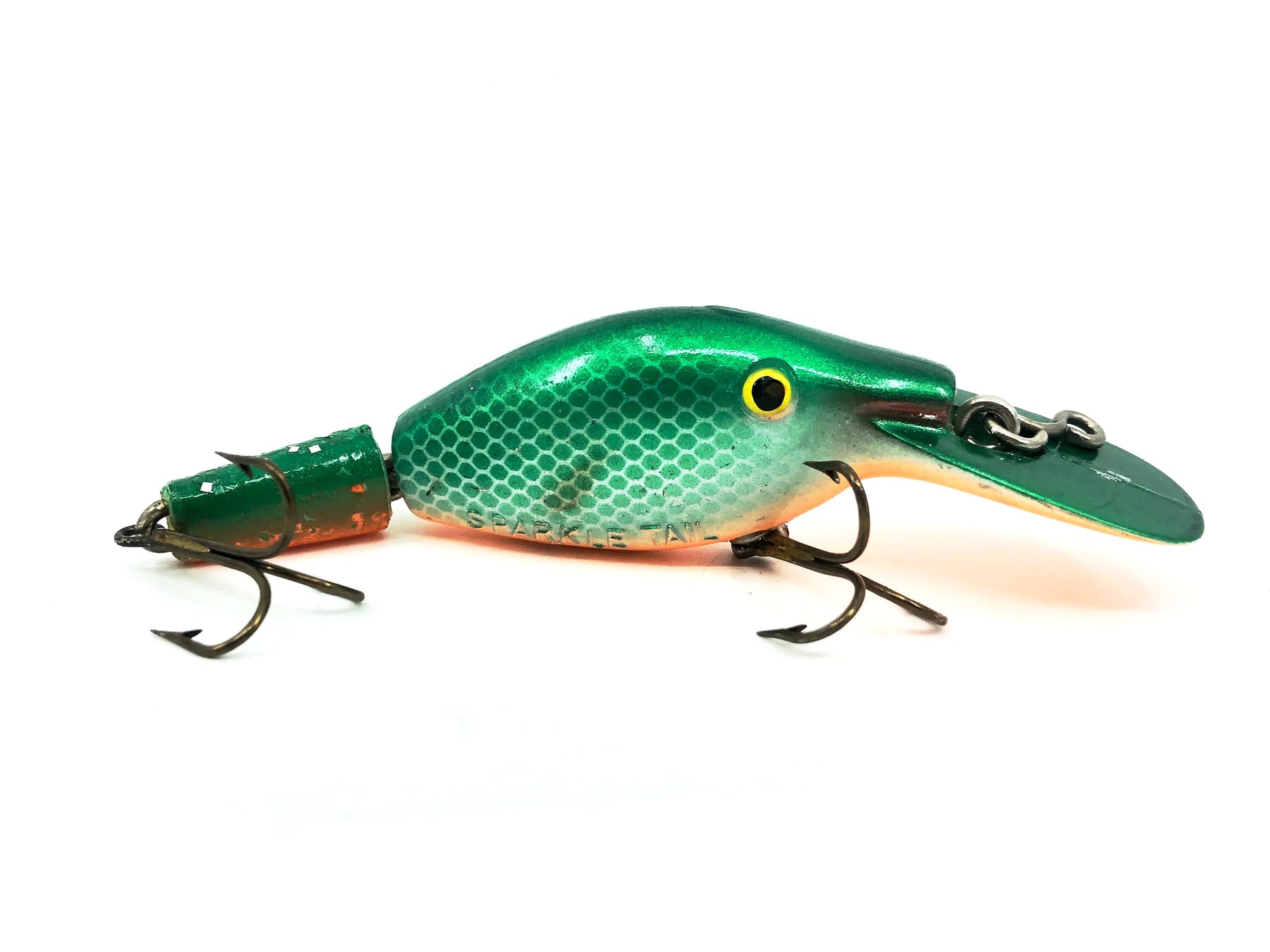 Vintage Sparkle Tail, Green Scale Color. Great lure here. Awesome for walleye and bass. Great to collect. About 3 3/4" long. Vintage used lure with some minor wear but in good overall shape, see photos. Made by Hubbards Lures.