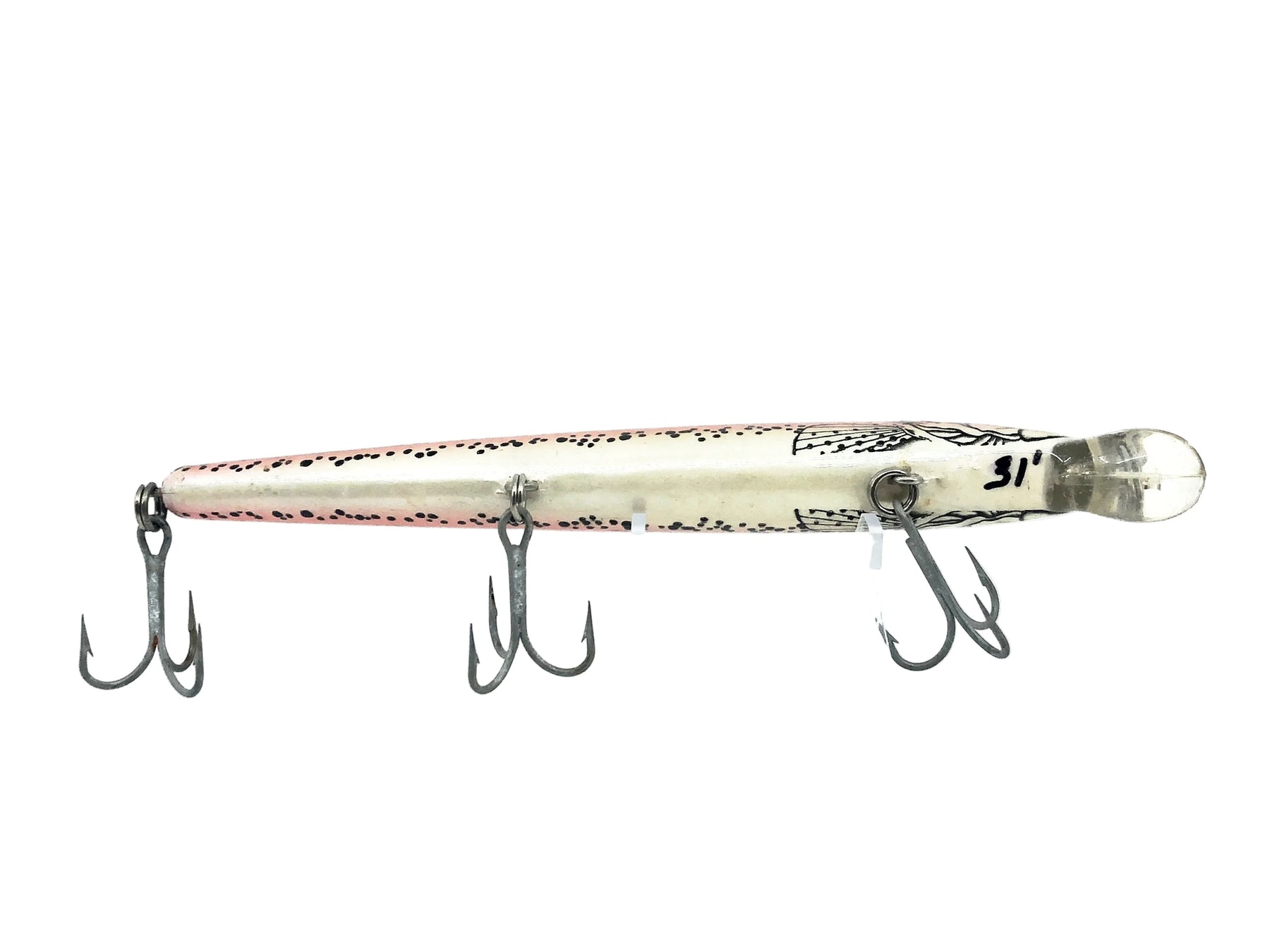 Bomber Magnum Long a 16A, XRT Rainbow Trout Color. Great lure here from the late 80s-90s. This bait is about 6" long excluding the lip. Lure is used with some marks on one sides gill and writing on the bottom but in overall good condition. Fish or collect!