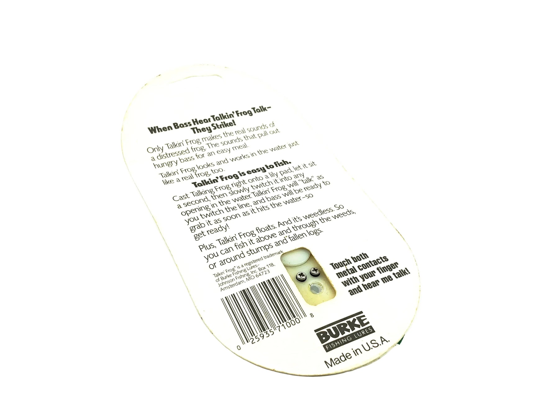 Johnson Lures Novelty Talking Frog on Card. Great novelty lure here. Card still in decent shape, though the bubble is coming off. Lure is new in card but with some storage wear. Probably needs new batteries to hear it talk again. See photos.