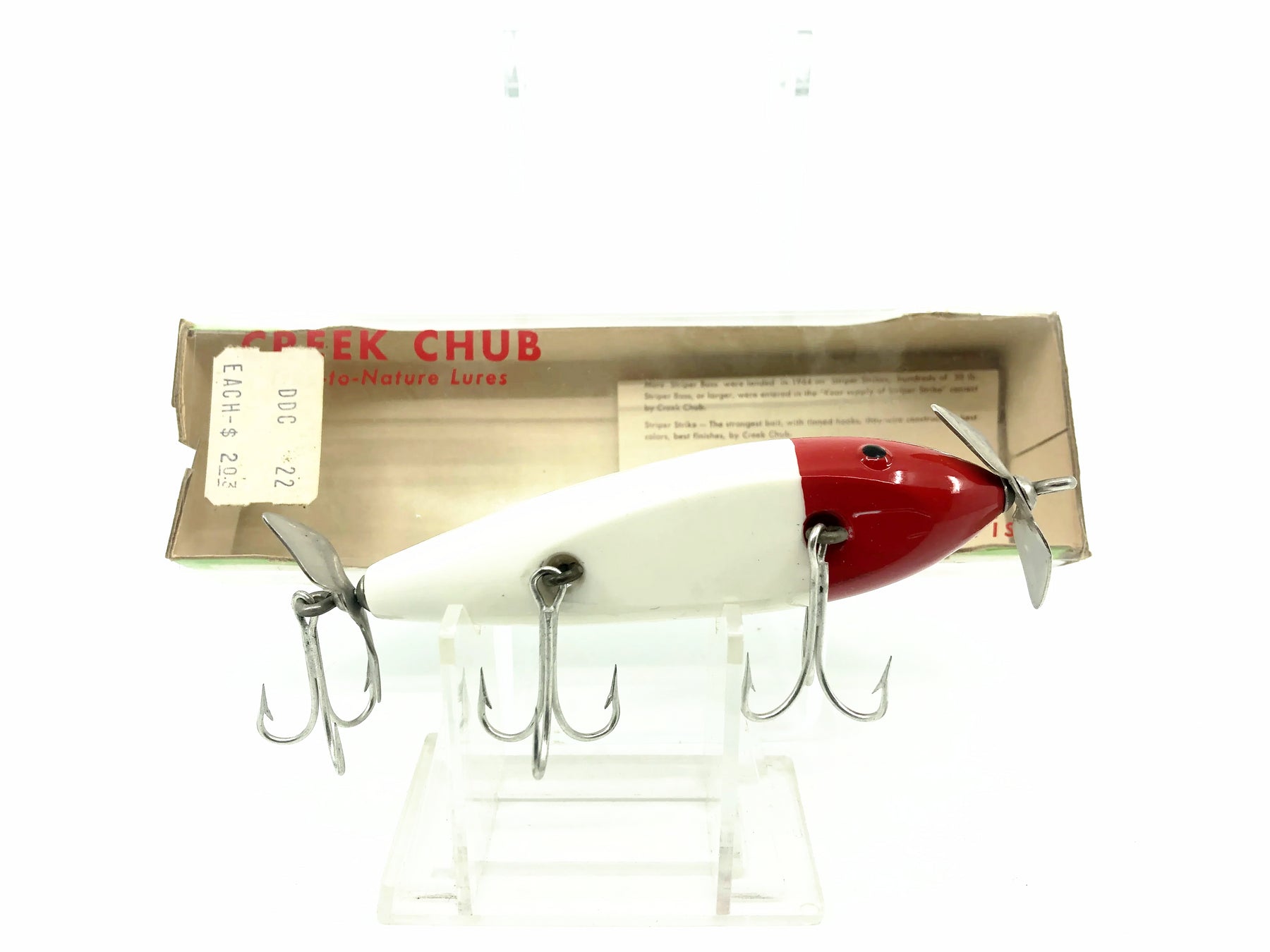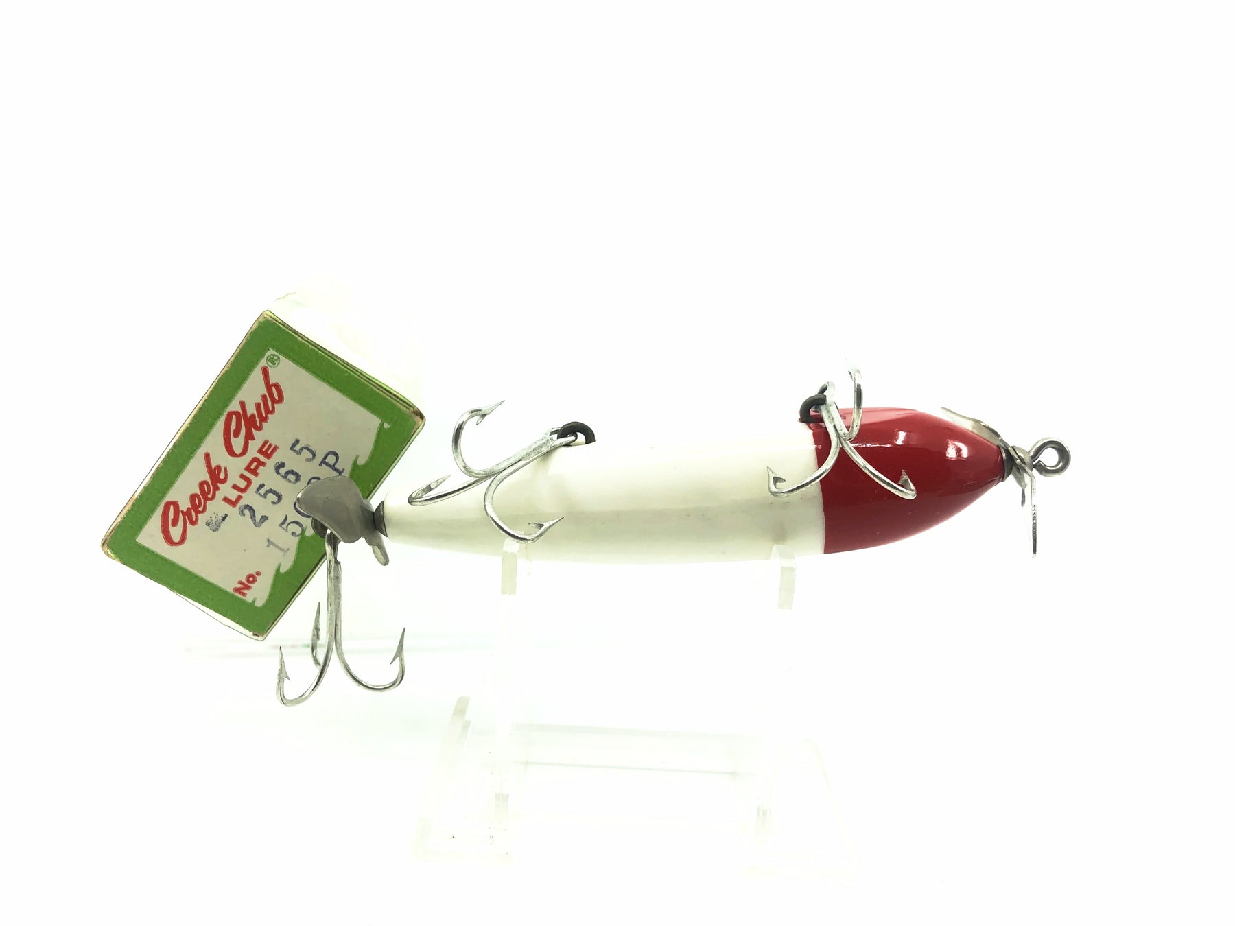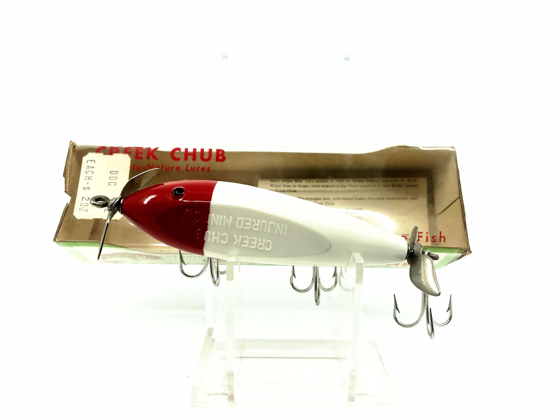 Creek Chub 1500P Injured Minnow, RW Red White Color w/Box. Vintage plastic injured minnow. About 3 5/8" long. Box has two lure markings on it however one is the correct 1502 marking Lure is in great condition. See photos. Fish or collect you can't go wrong with a vintage Creek Chub Injured Minnow. Made for over 50 years for a reason! Take this one back out fishing.