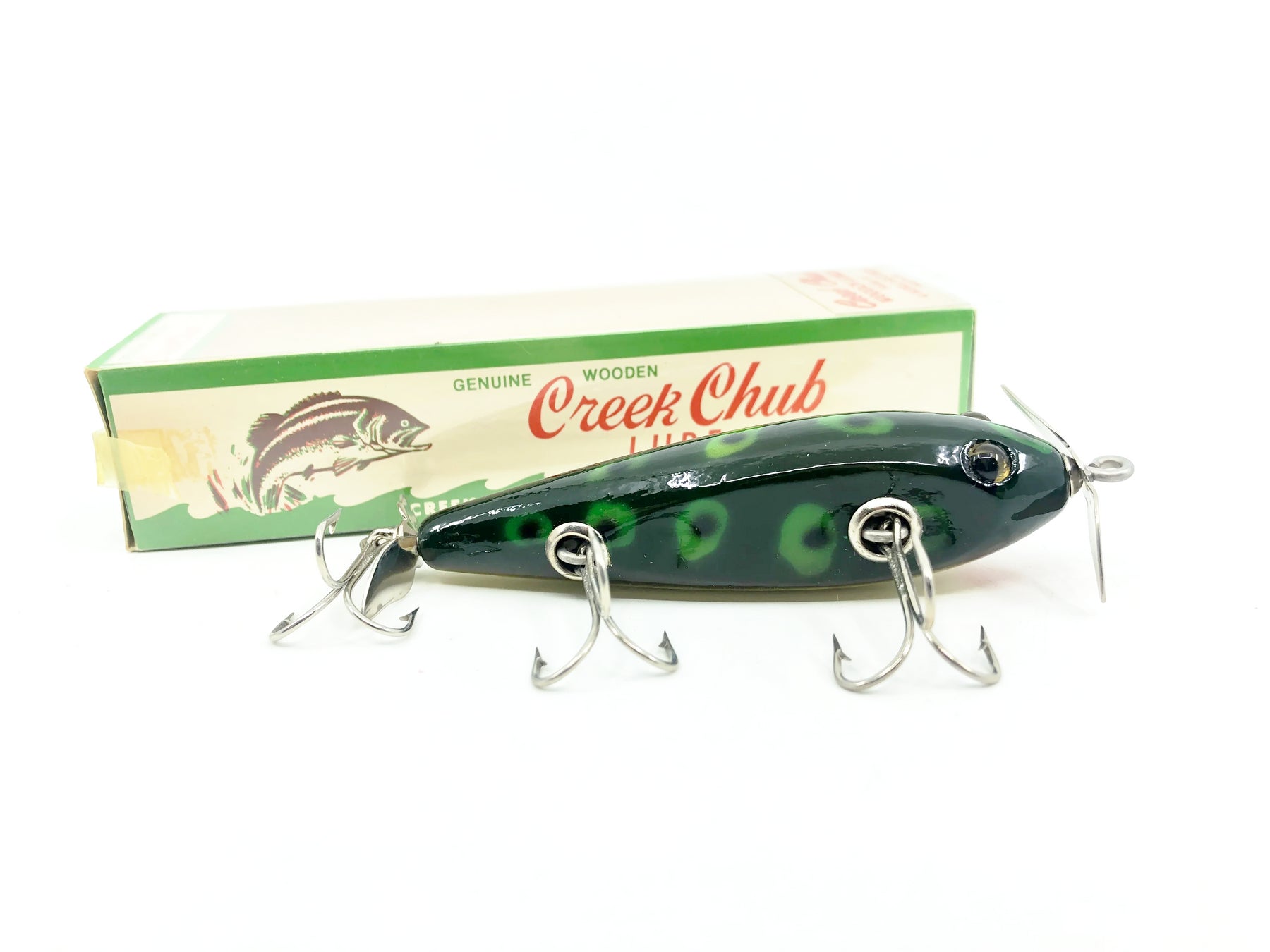 Creek Chub 1500 Wooden GE Injured Minnow, F Frog Color w/Box. Sioux City Creek Chub Injured Minnow. About 3 5/8" long. Lure is new with box with just a little wear from storage and the box is in good condition. See photos. Fish or collect you can't go wrong with a vintage Creek Chub Injured Minnow. Made for over 50 years for a reason! Take this one back out fishing.