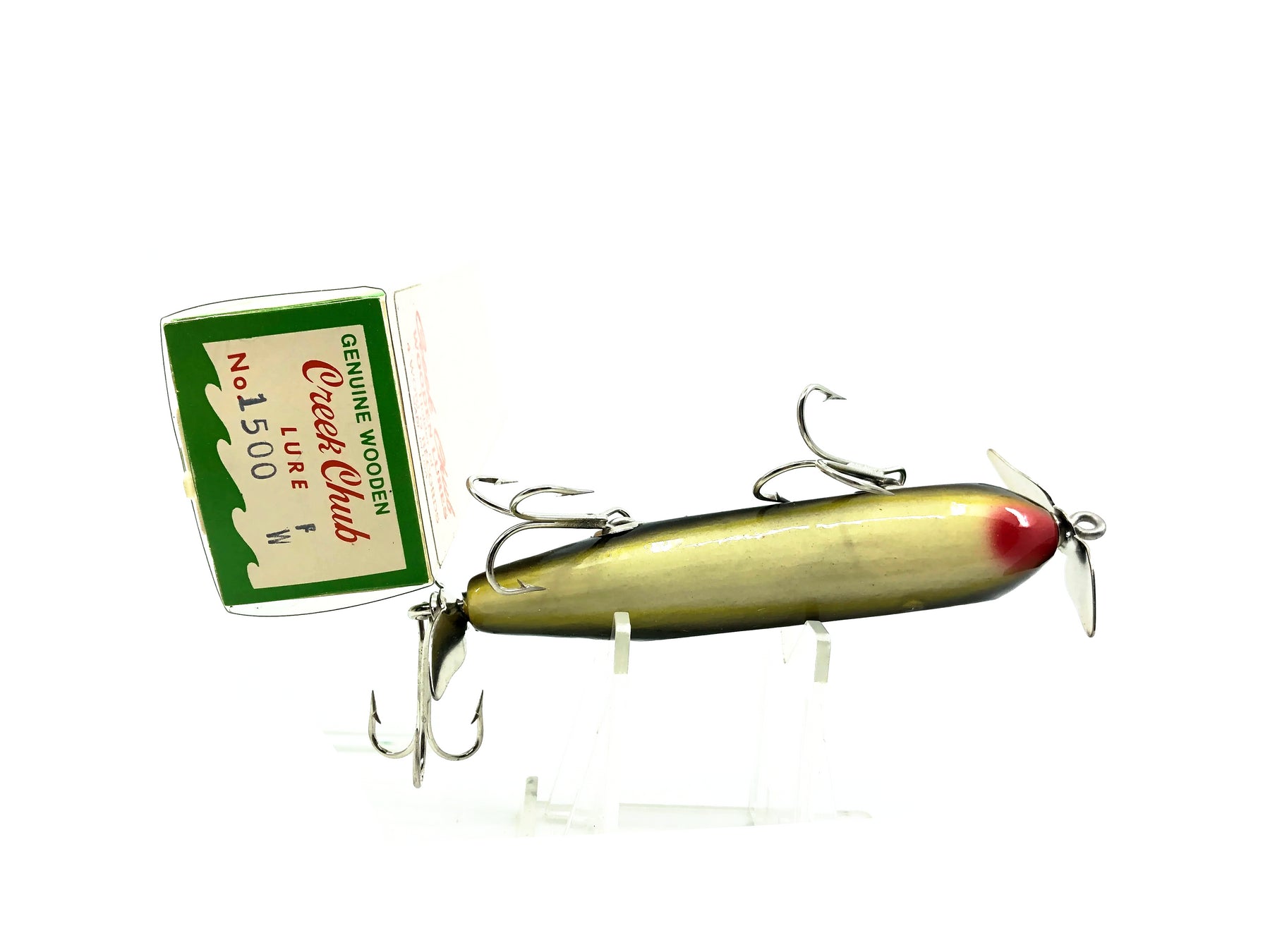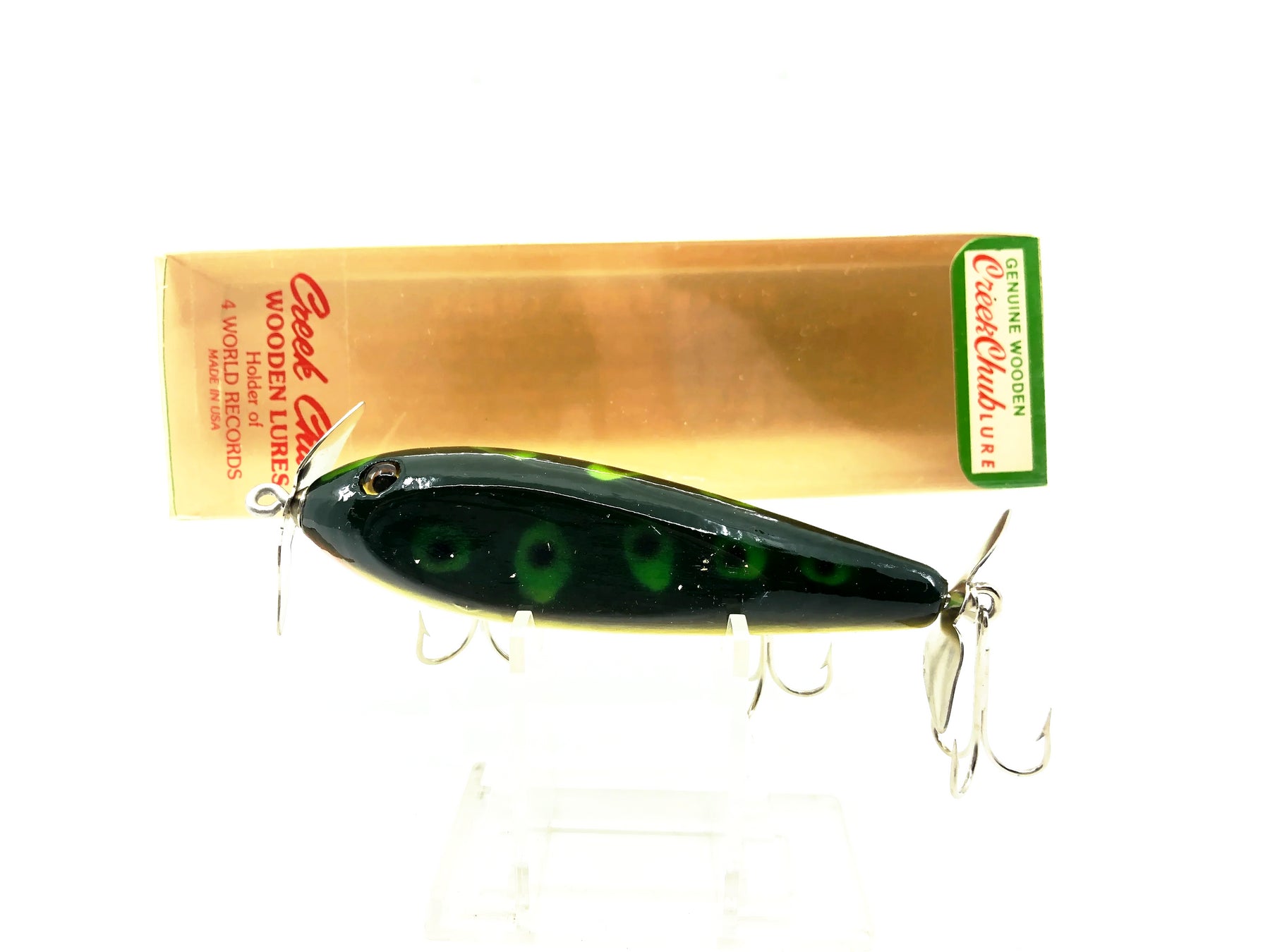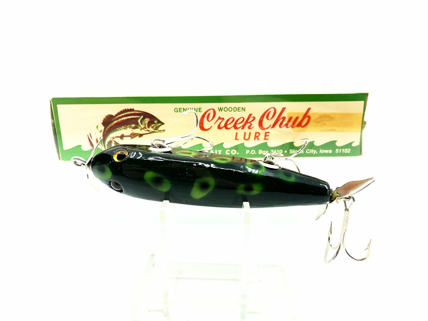 Creek Chub 1500 Wooden GE Injured Minnow, F Frog Color w/Box. Sioux City Creek Chub Injured Minnow. About 3 5/8" long. Lure is new with box with just a little wear from storage and the box is in good condition. See photos. Fish or collect you can't go wrong with a vintage Creek Chub Injured Minnow. Made for over 50 years for a reason! Take this one back out fishing.