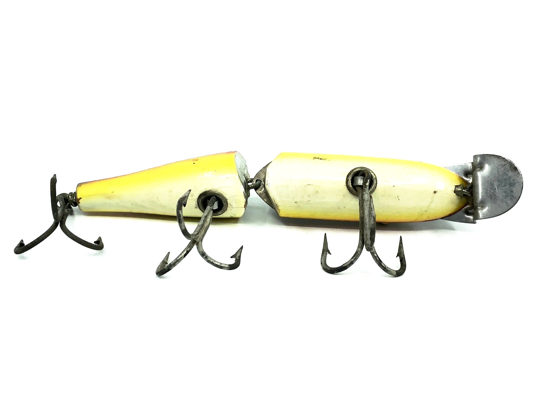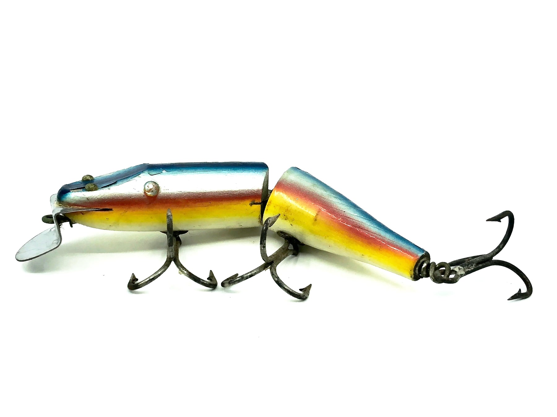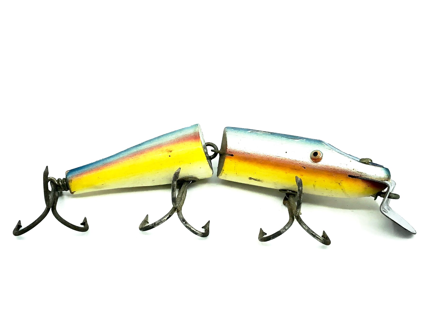 Creek Chub Jointed Husky Pikie 3000, Rainbow Color 3008. About 6" long body excluding lip. Great vintage lure here. Wooden lure, tack eyes. Lure has some minor wear, marks, and a missing Creek Chub sticker but in overall good condition. This one won't last long so grab it for your collection while you can. See photos.