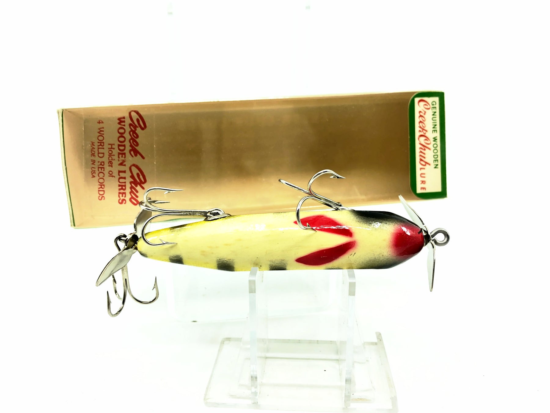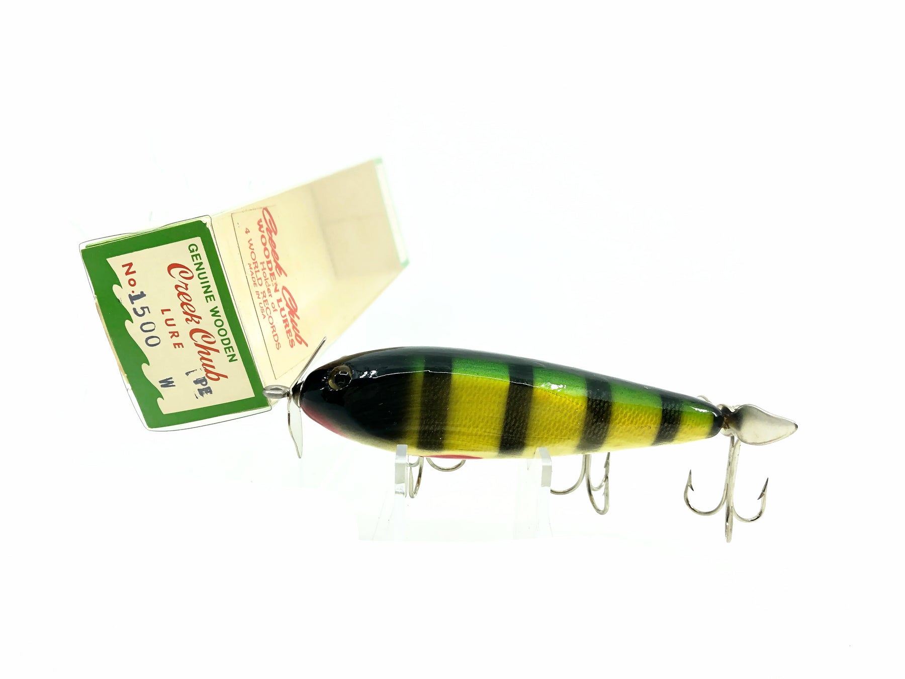 Creek Chub 1500 Wooden Injured Minnow, PE Perch Color w/Box. Sioux City Creek Chub Injured Minnow. About 3 5/8" long. Lure is new with box and the box is in good condition. See photos. Fish or collect you can't go wrong with a vintage Creek Chub Injured Minnow. Made for over 50 years for a reason! Take this one back out fishing.